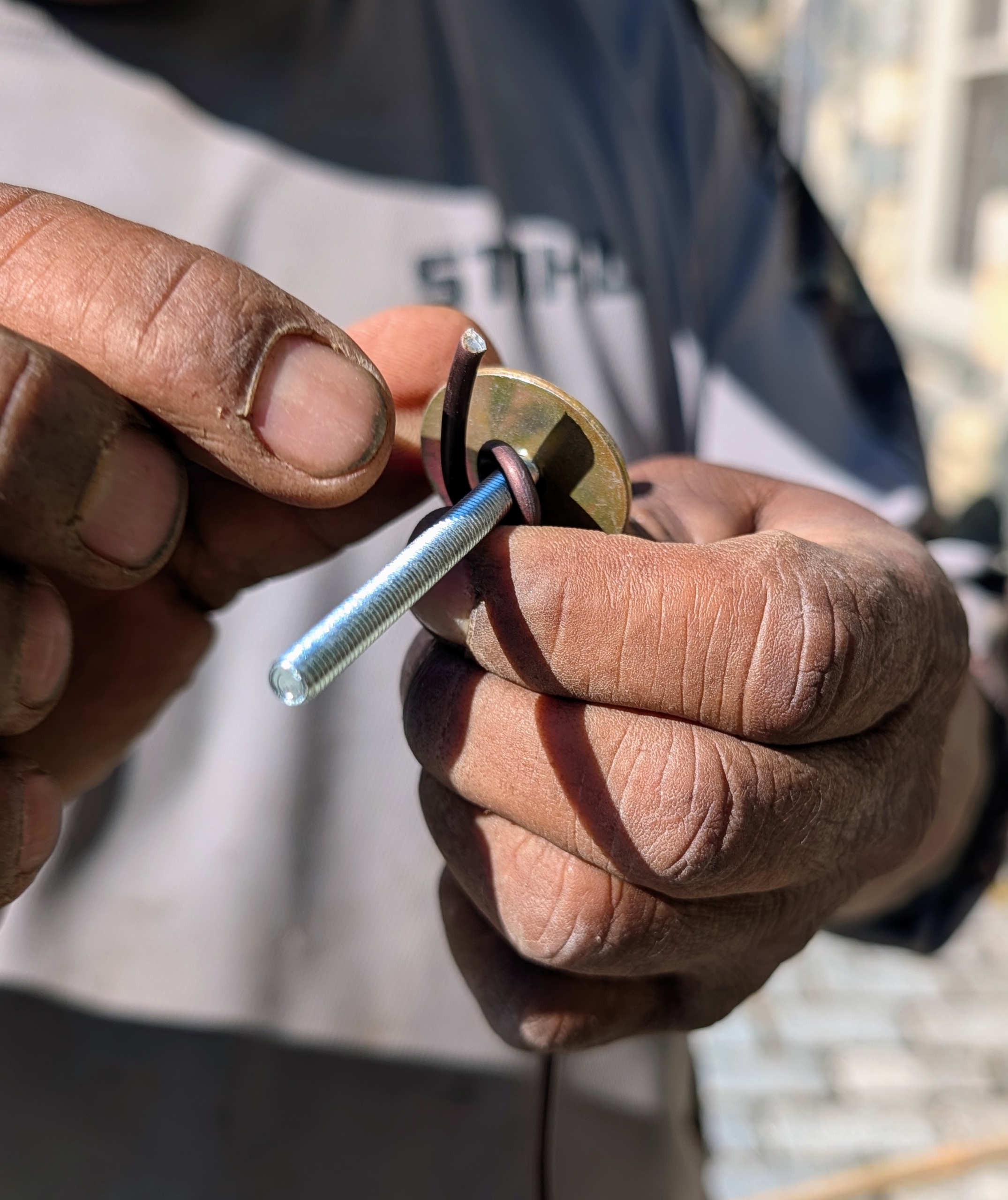 - Pete also gets two appropriate washers and secures one on each of the anchoring screws.