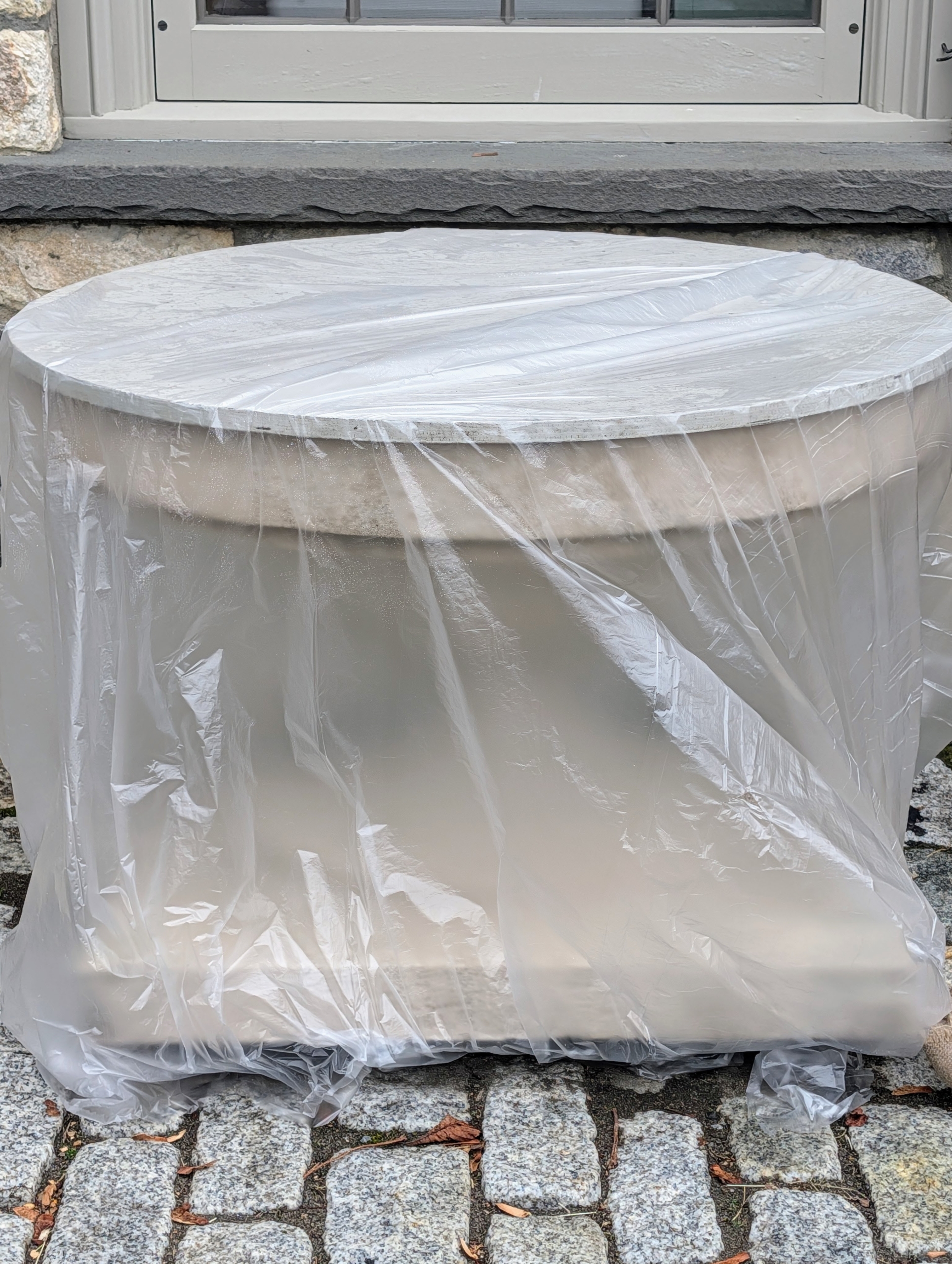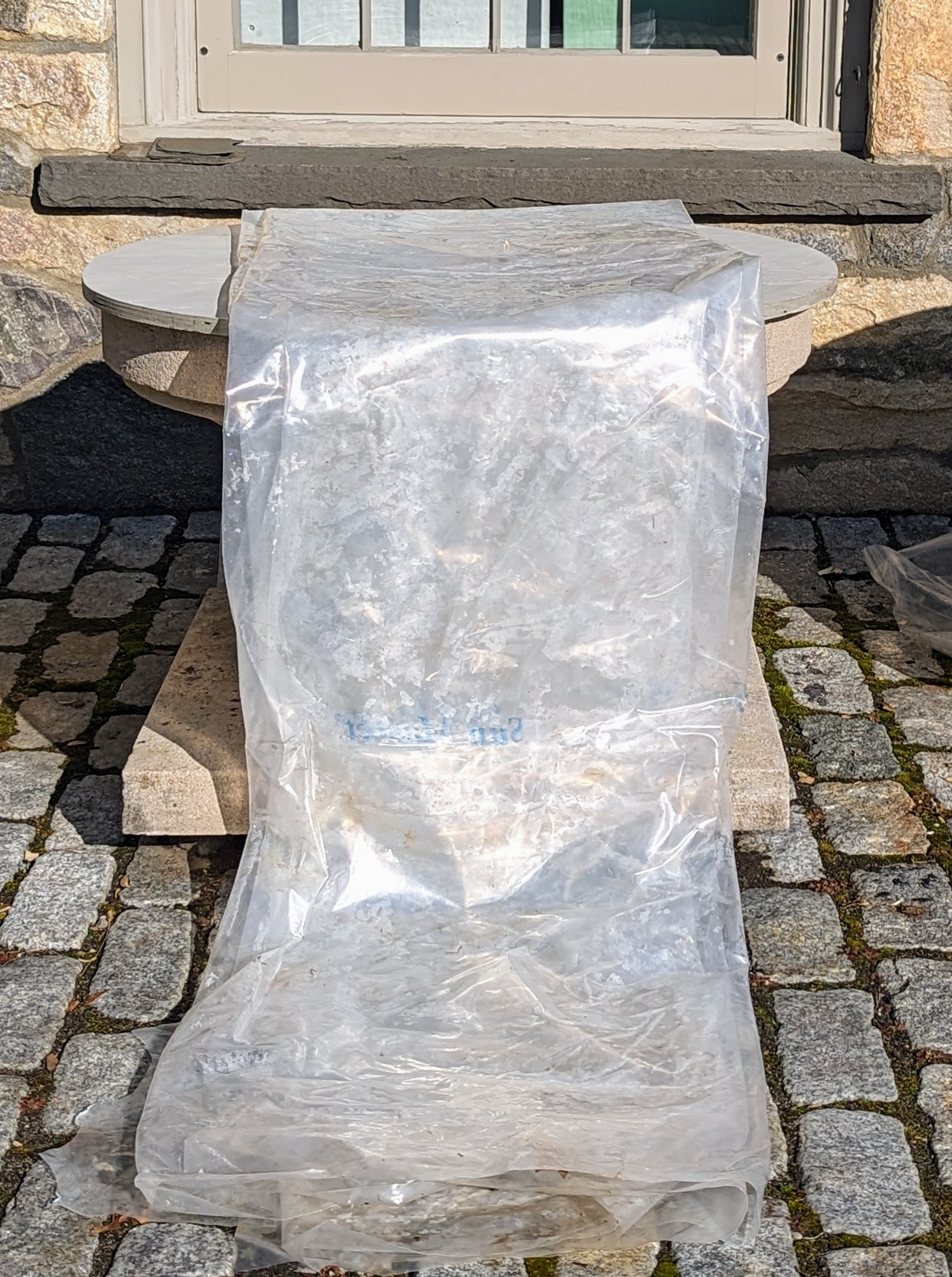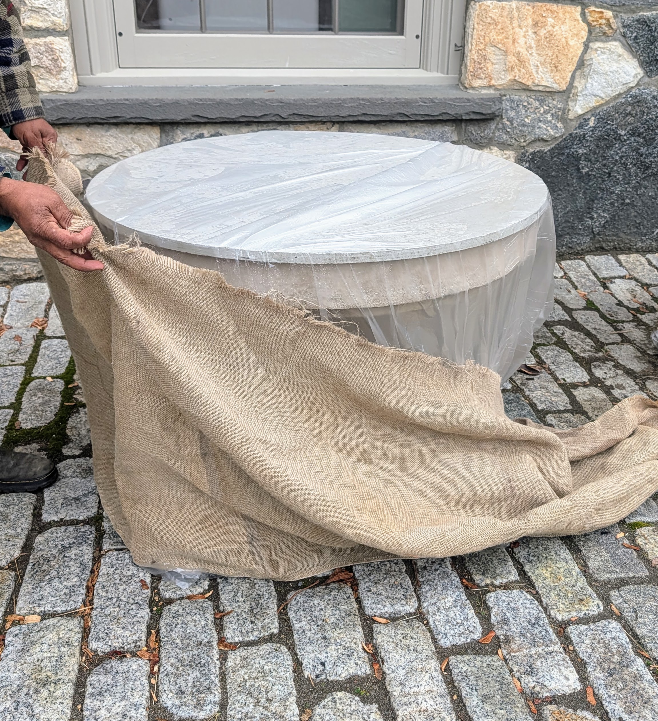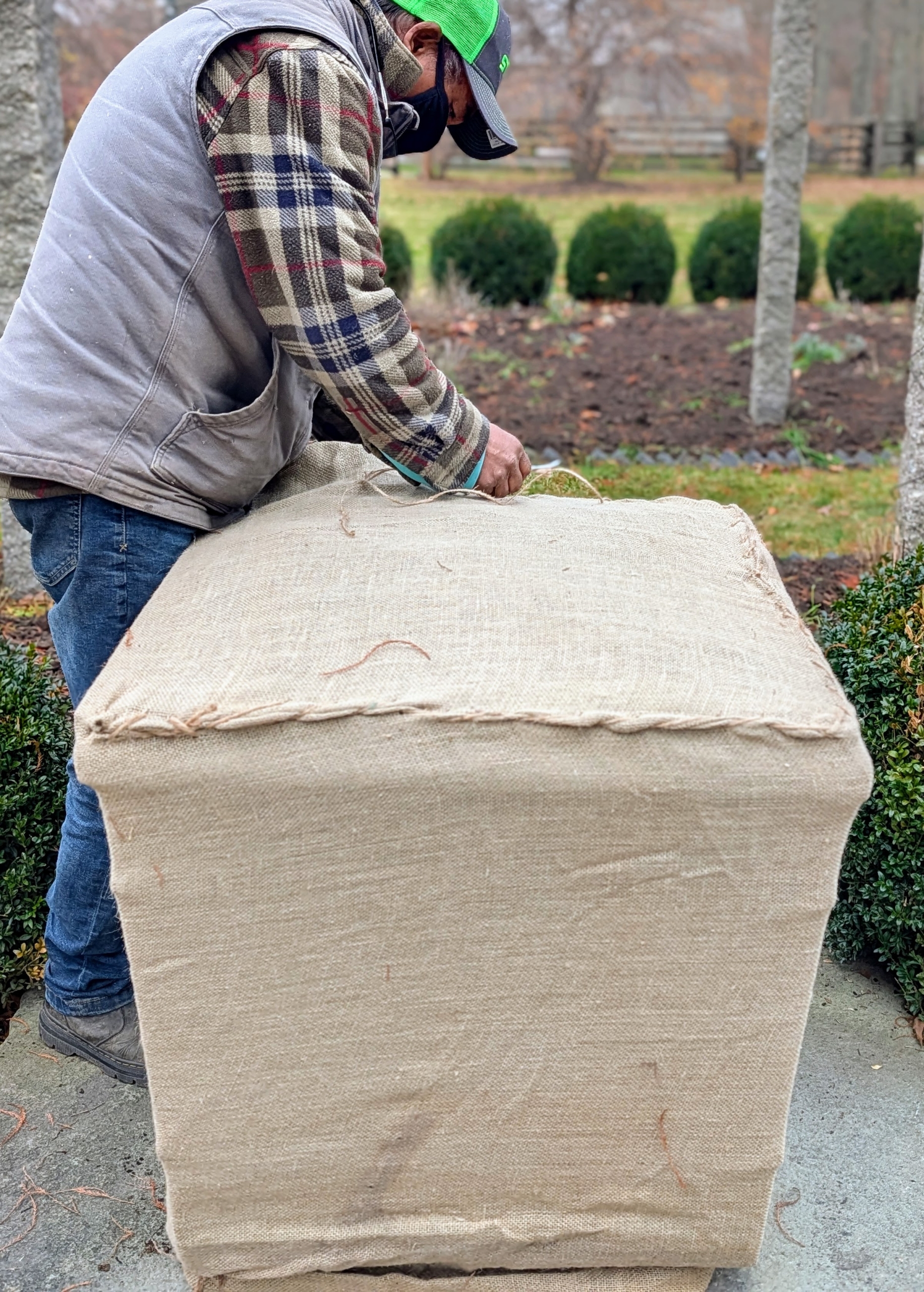 I've been covering my boxwood shrubs and hedges with burlap for many years to protect them from splaying and breaking from the weight of snow and ice. I feel it is equally important to protect my outdoor garden containers from the harsh winter elements. A winter freeze, alternating with thaws, could crack or crumble any kind of stone or cement, especially if it is antique. During this time, all my outdoor planters, birdbaths, stanchions, etc., are covered in the same burlap used for my live specimens.