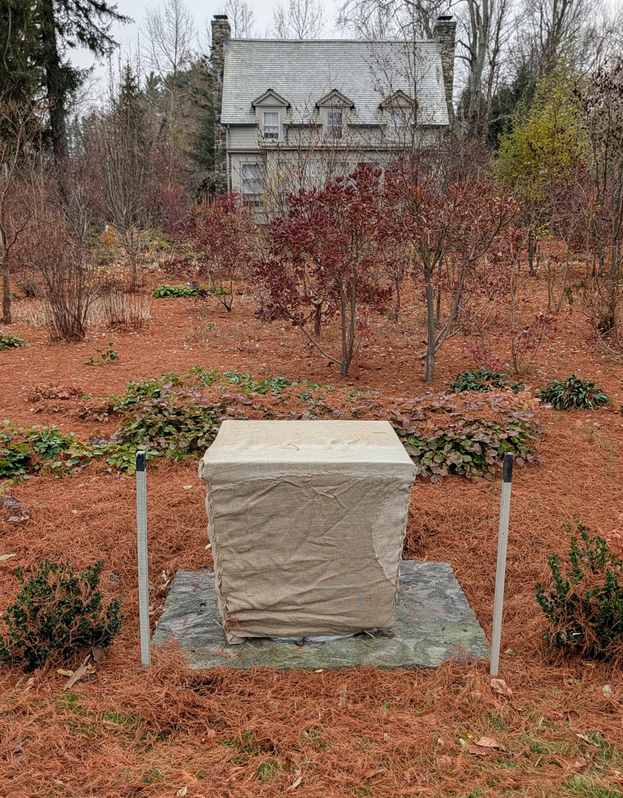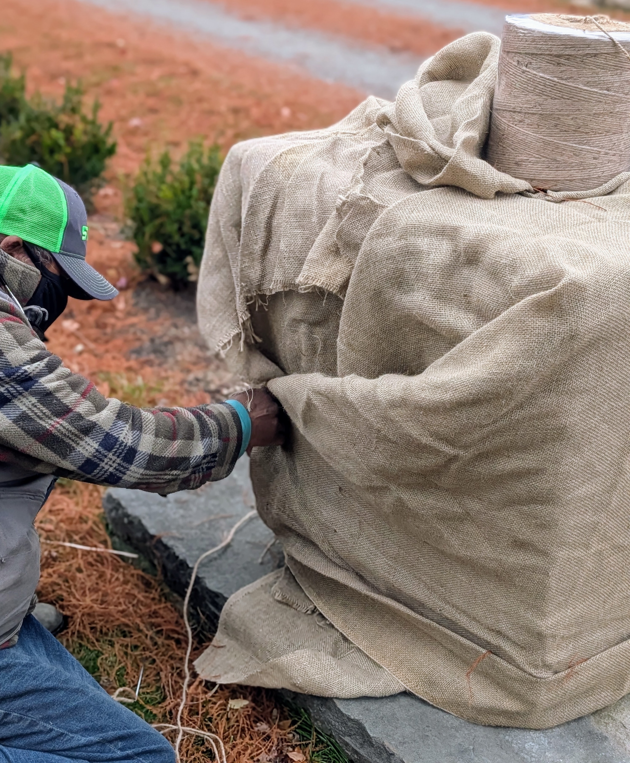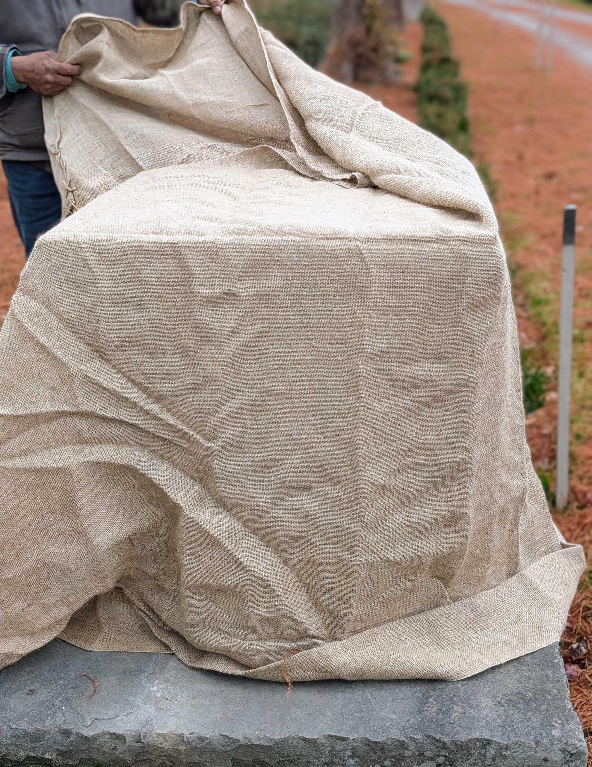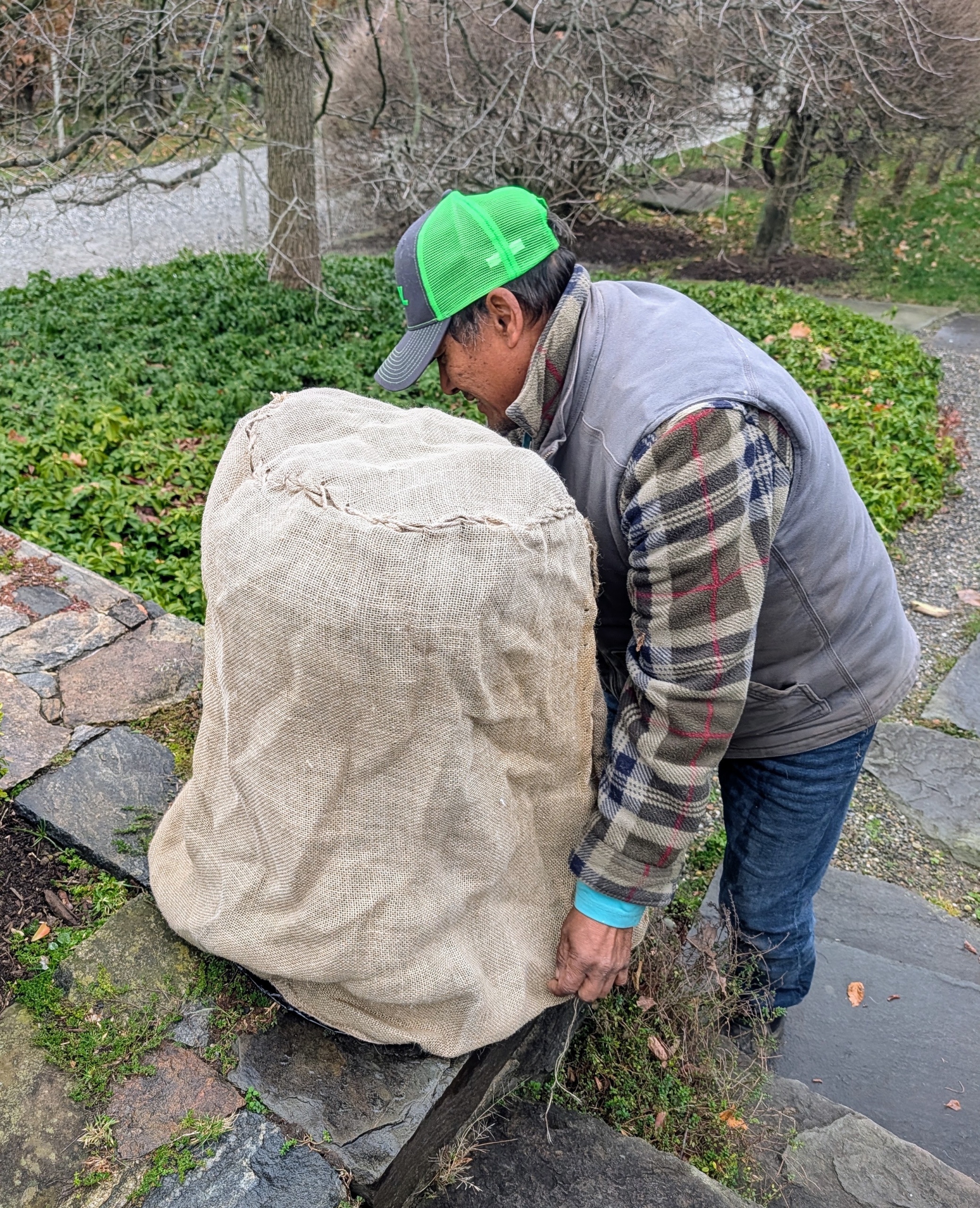 You know cold winter weather is on the way when various ornamental vessels around my farm are covered in burlap.