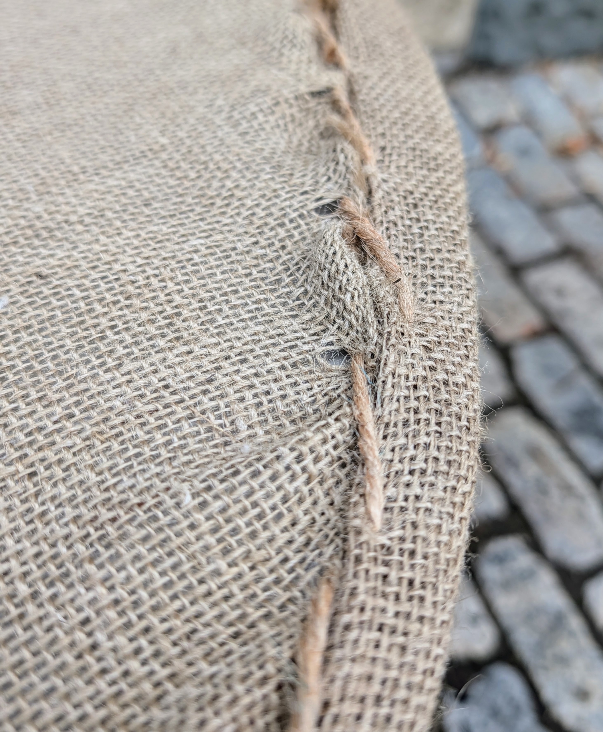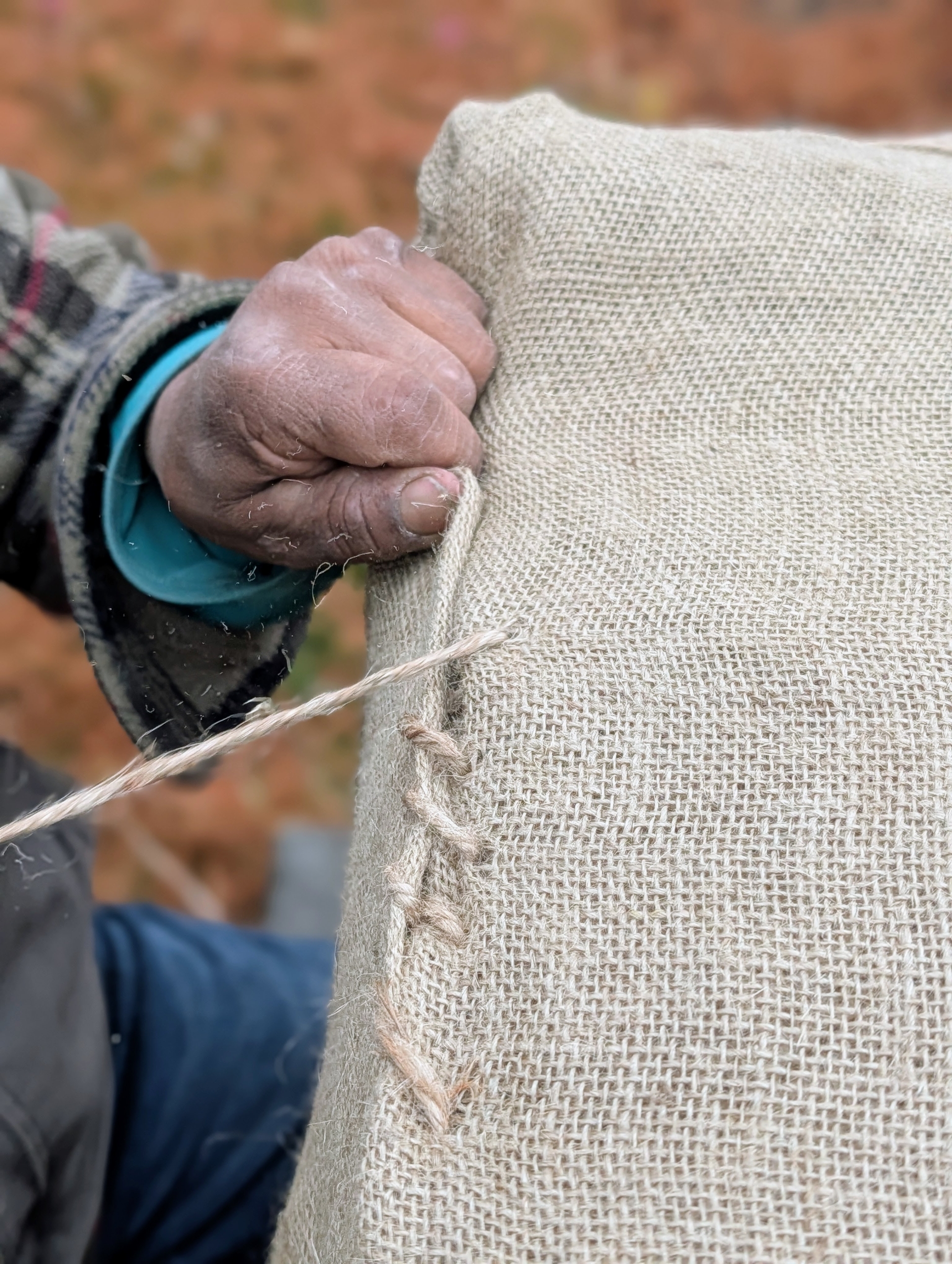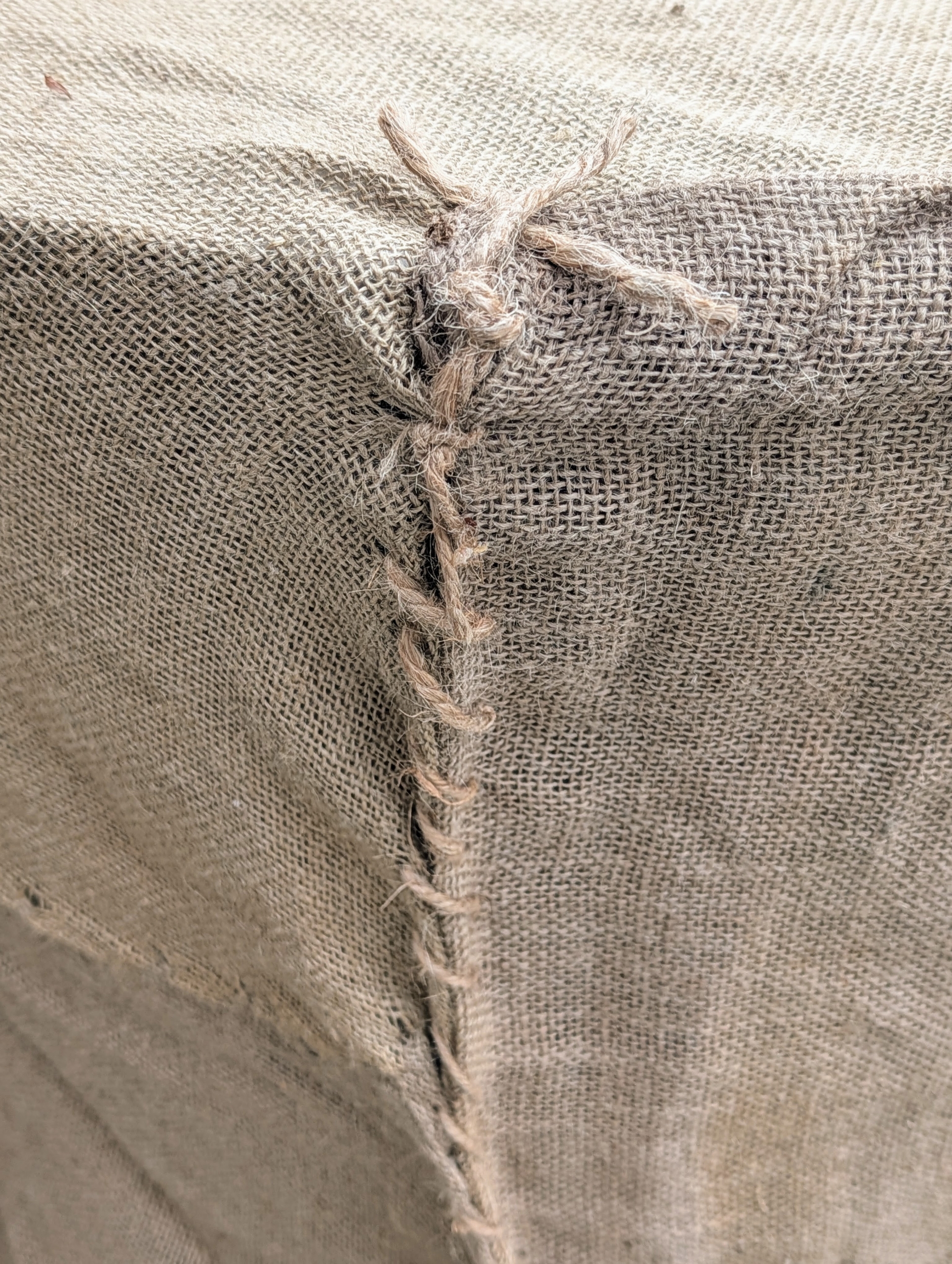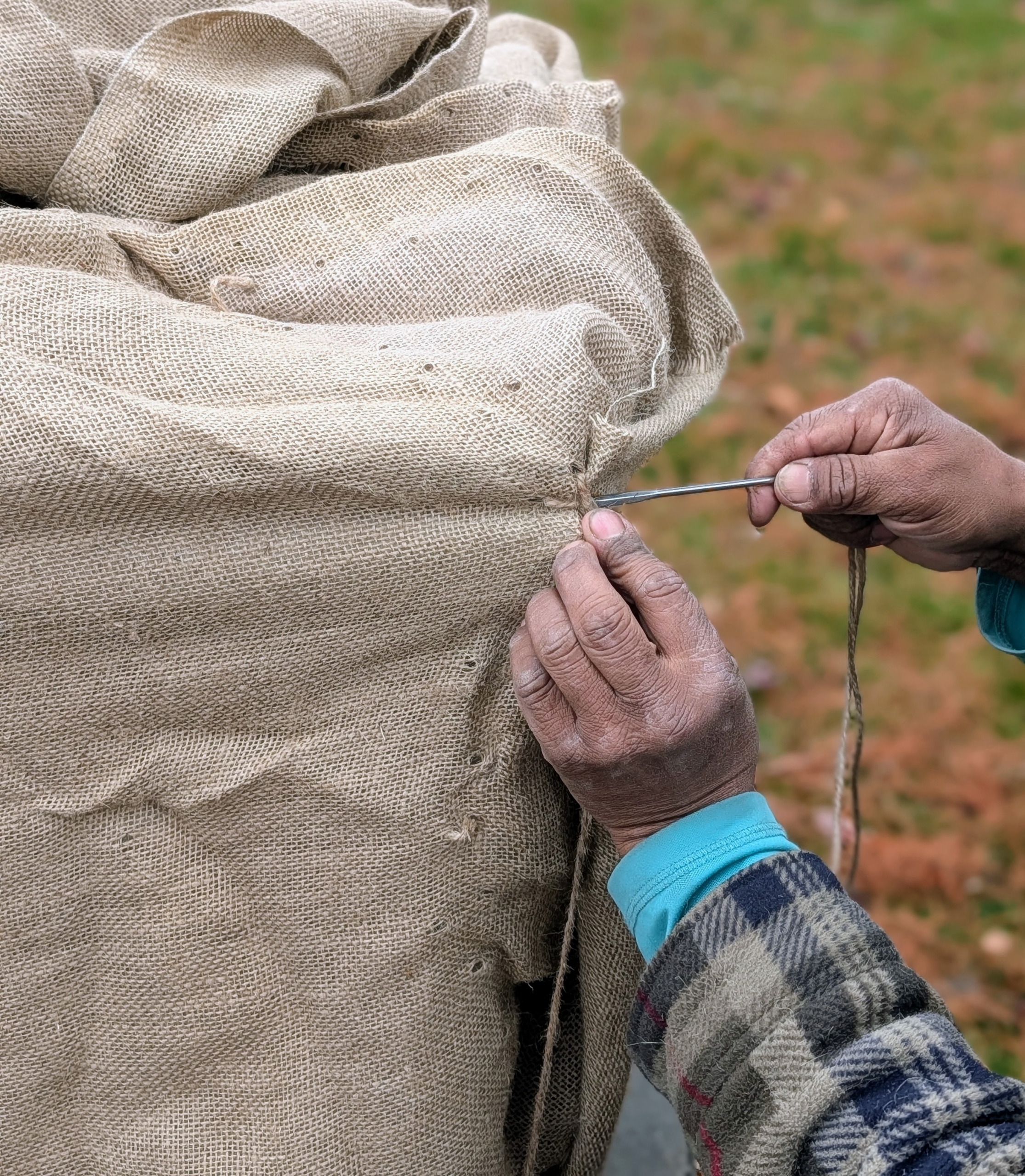 You know cold winter weather is on the way when various ornamental vessels around my farm are covered in burlap.