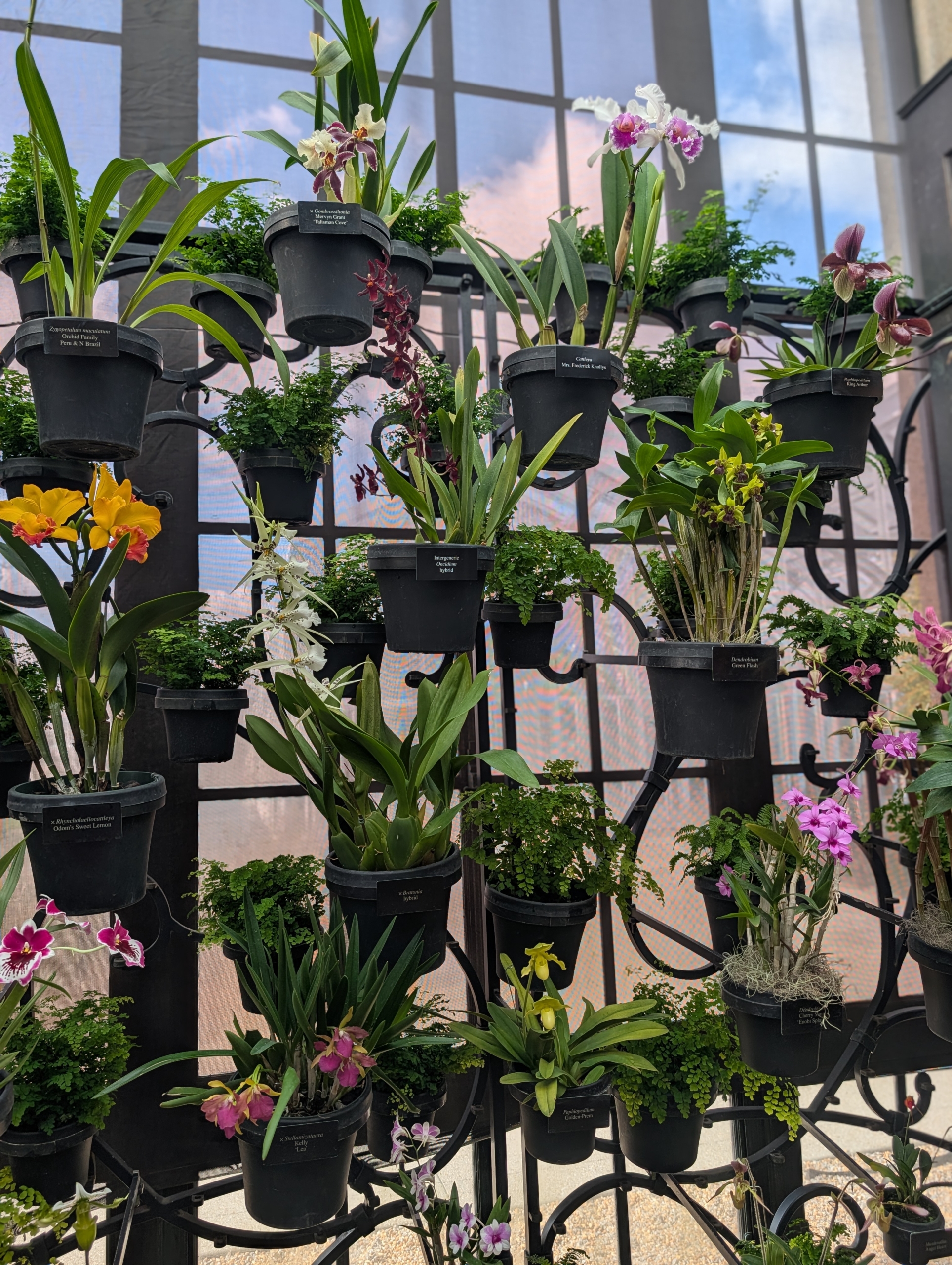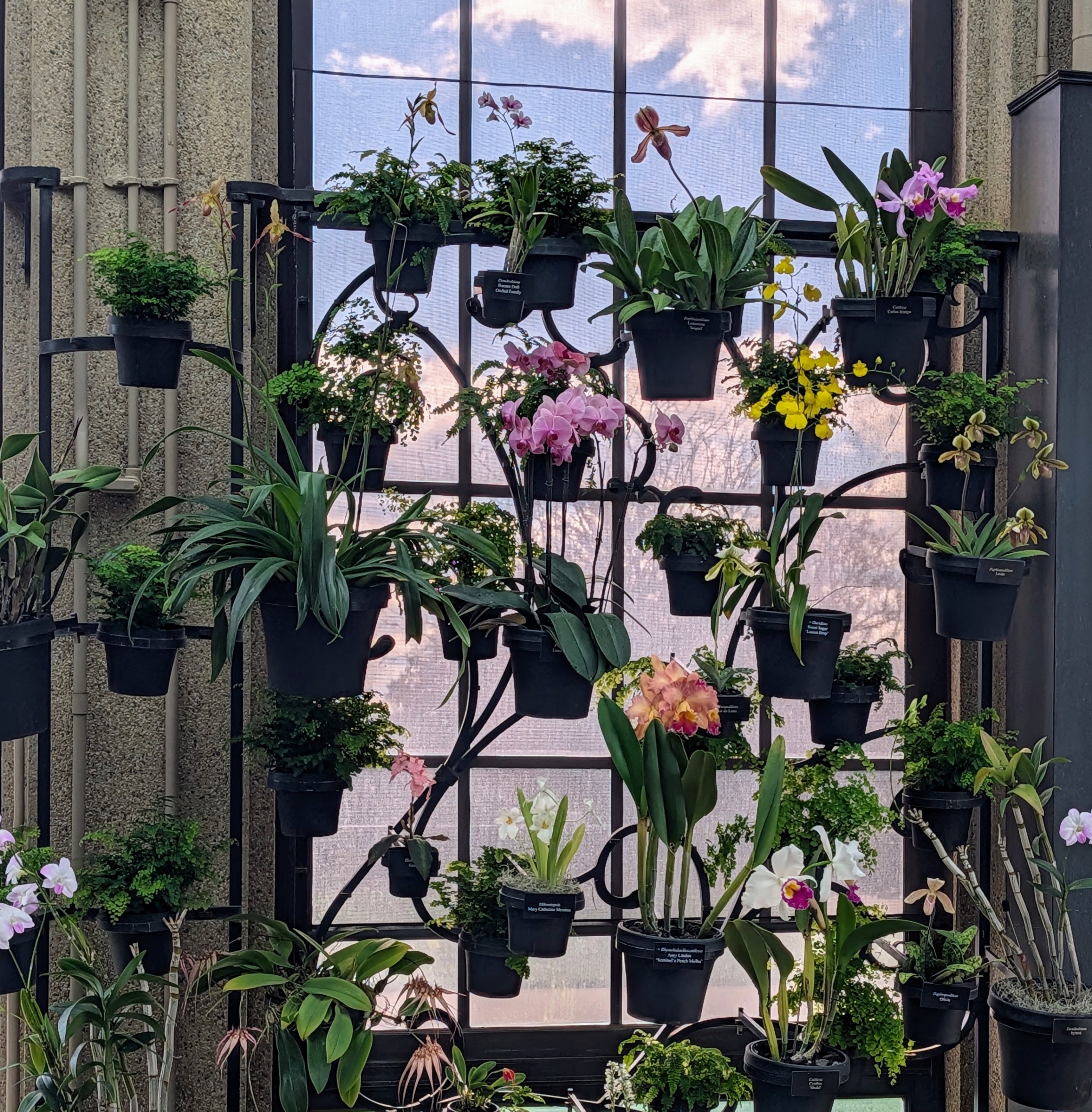 The Orchid House at Longwood Gardens in Kennett Square, Pennsylvania, is a place where one can view some stunning orchid specimens. Longwood features hundreds of beautiful potted orchids displayed in a newly restored gallery-like room on custom frame trellises. The garden's collection was started by founder Pierre S. du Pont and his wife, Alice, in the 1920s and now includes more than 5000 different plants representing 2000 different groups.