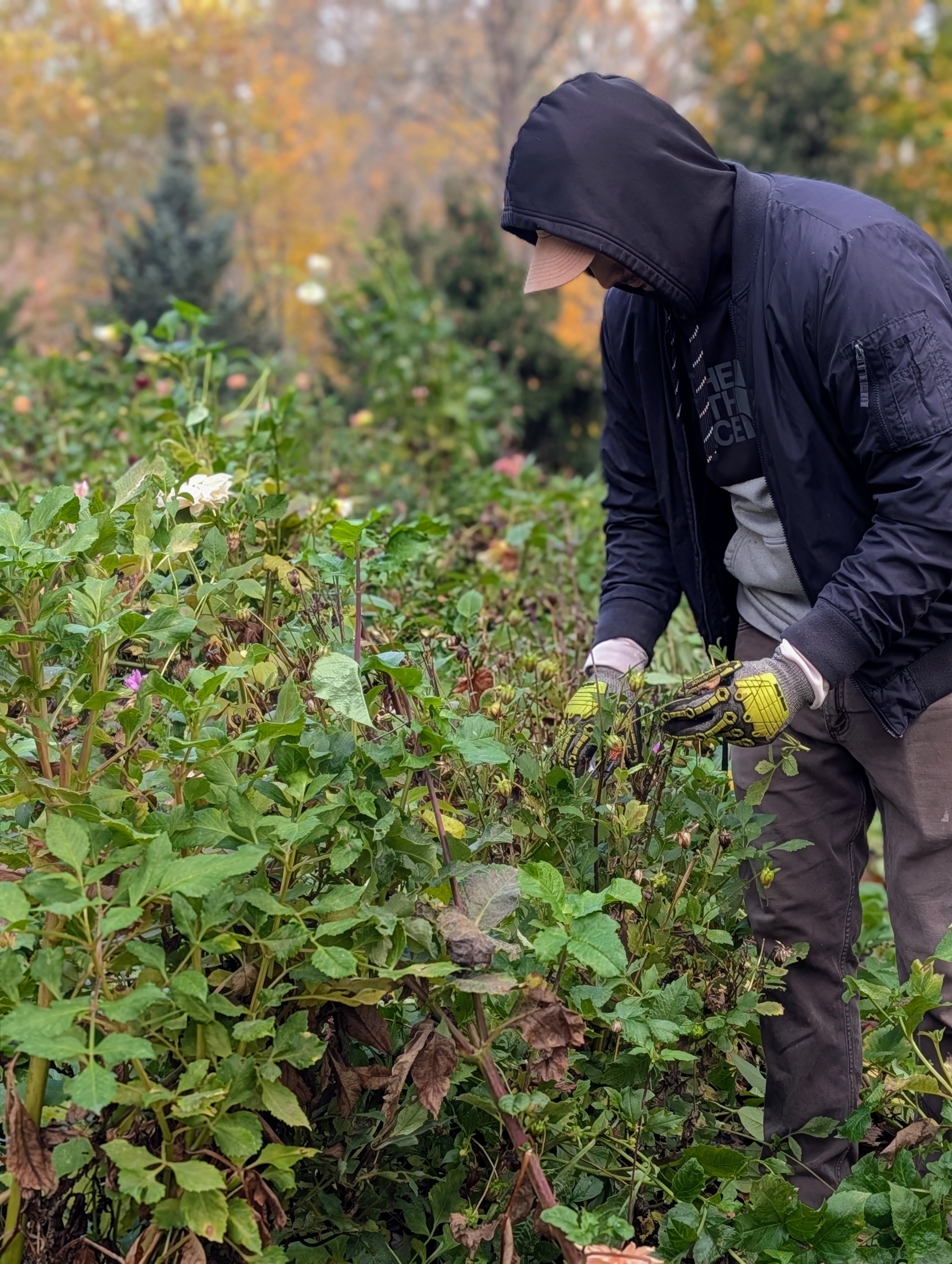 - Matthew rakes the compost evenly over the dahlia tubers.