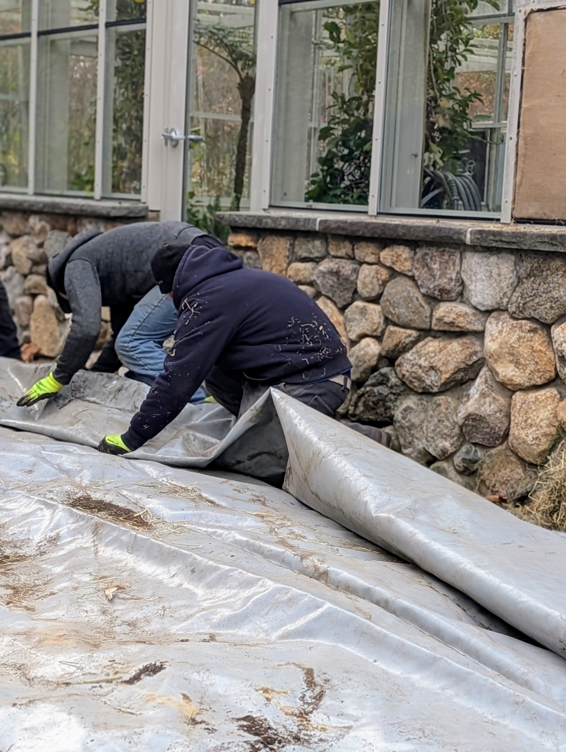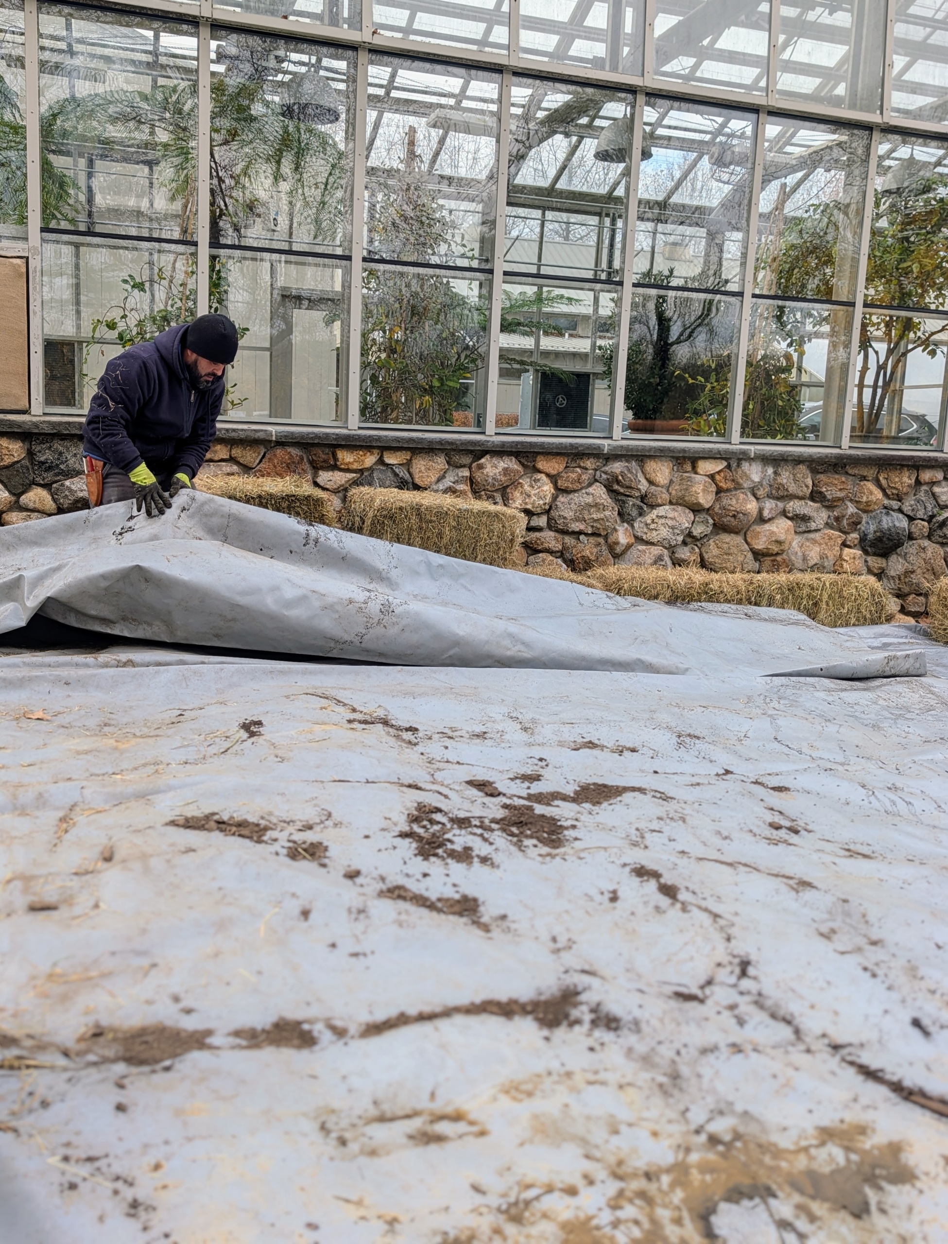 - It is big enough to cover the entire bed. Adan neatly unfolds the tarp and lays it down carefully, making sure to cover all the tubers and compost.
