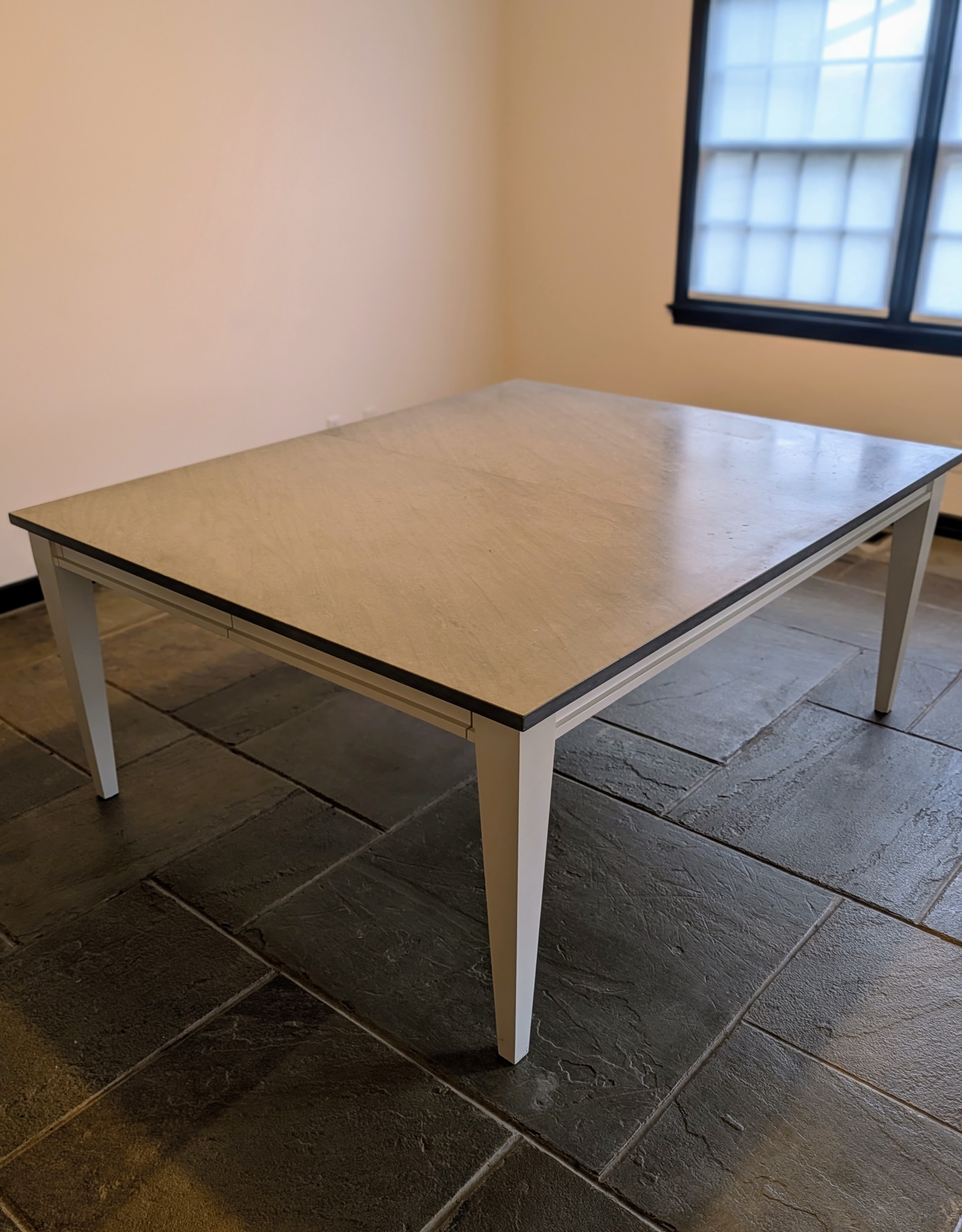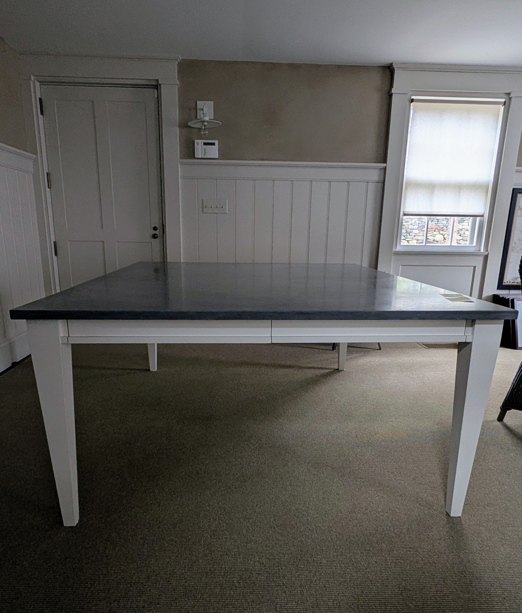 - The table has a very interesting gray marble top that weighs hundreds of pounds. Despite marble’s strength as a surface, it is very hard to move. Marble is prone to cracking if mishandled. The team had to have a good plan.