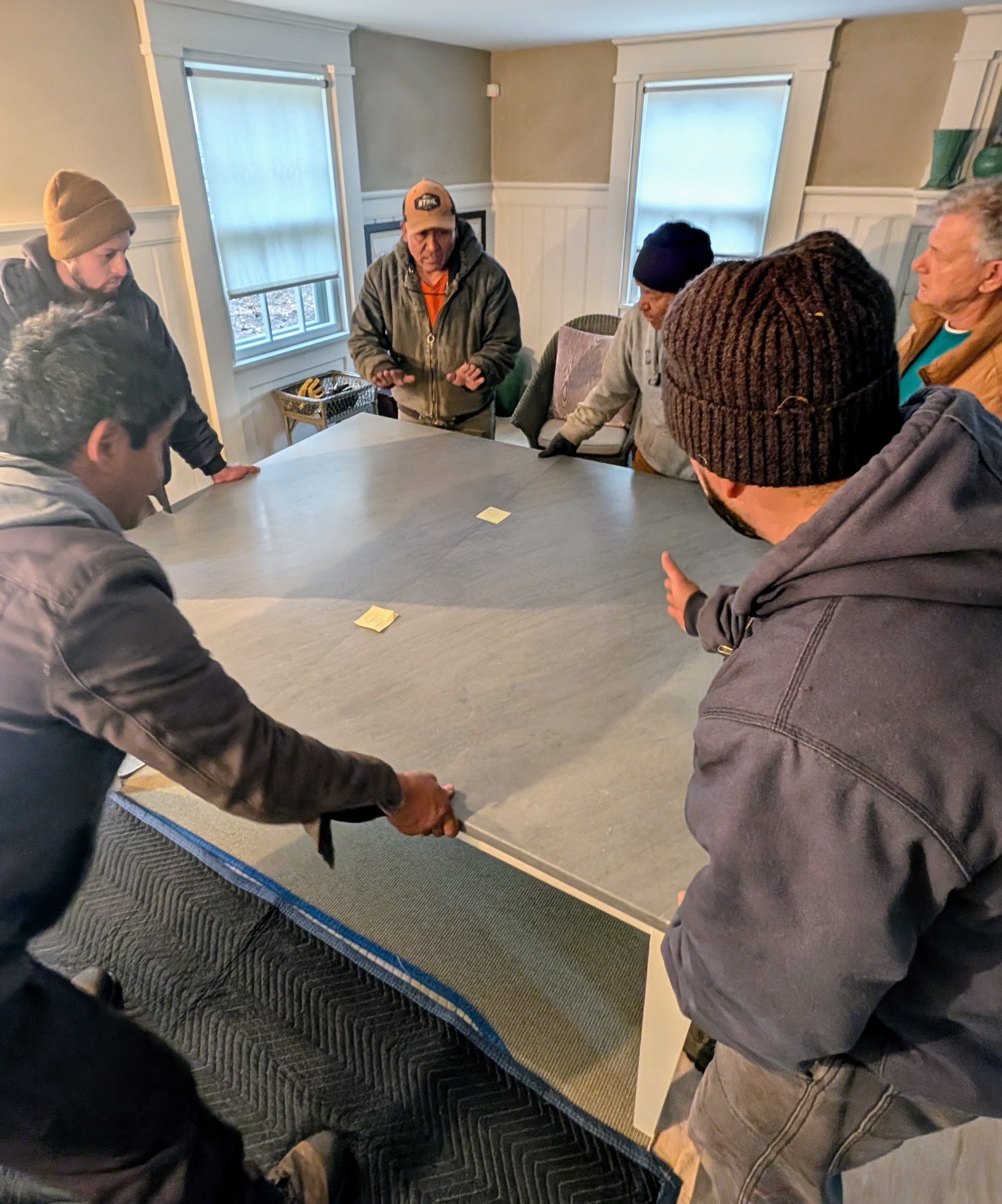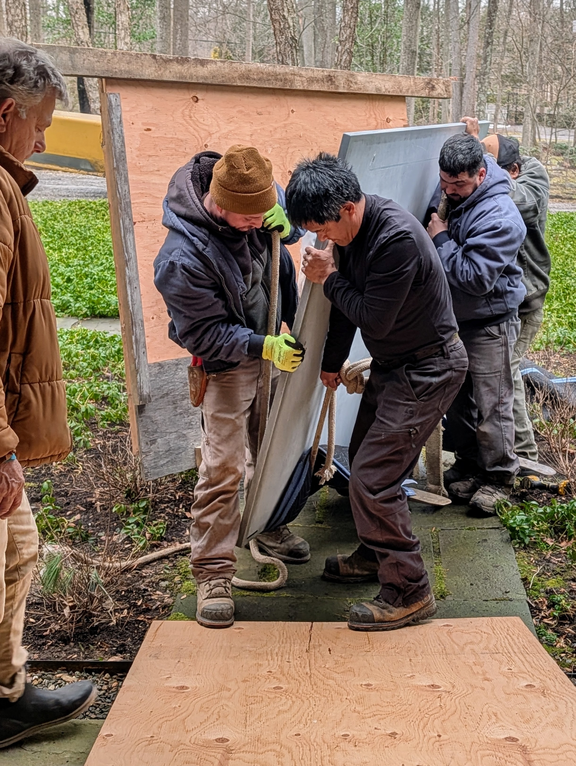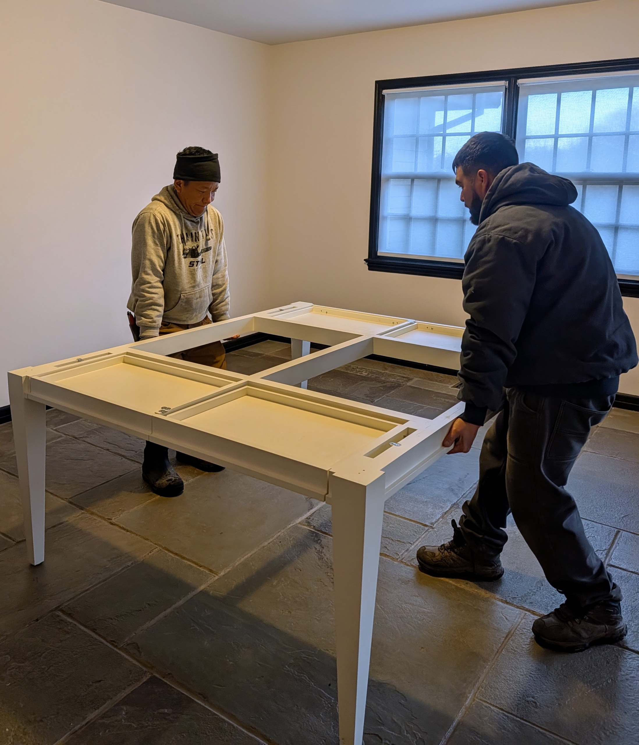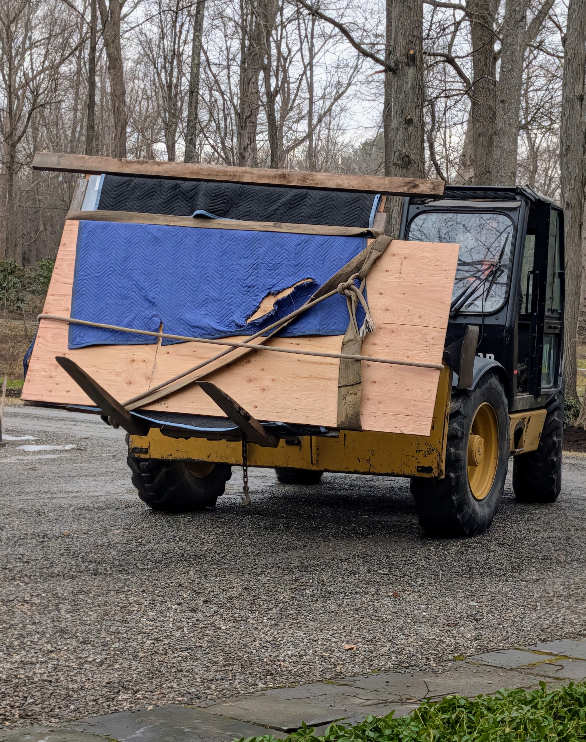 Yesterday, I asked my outdoor grounds crew to move a large table from my Tenant House to my production guest house. The table, which was previously used in my daughter's kitchen, was extremely heavy and fragile, so Pete built a wooden frame to protect it during transport and recruited the power of five to help get the table to its destination.