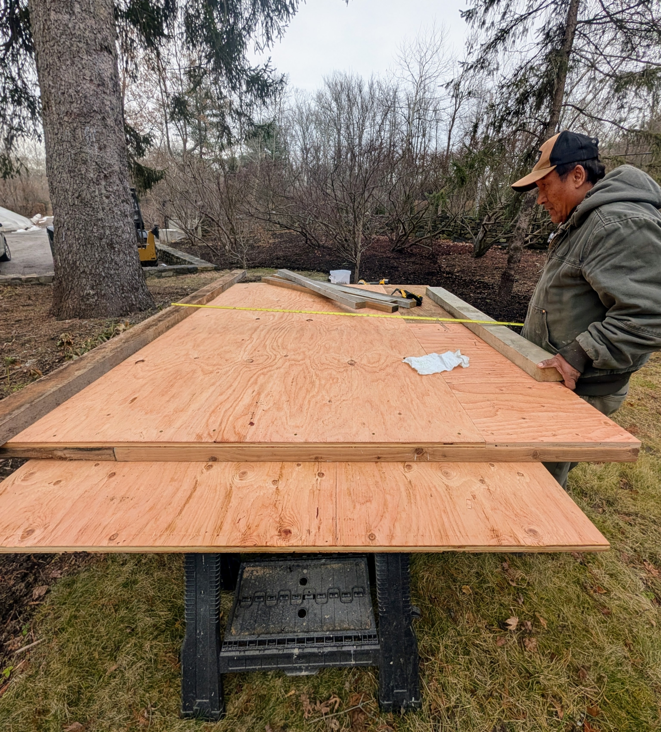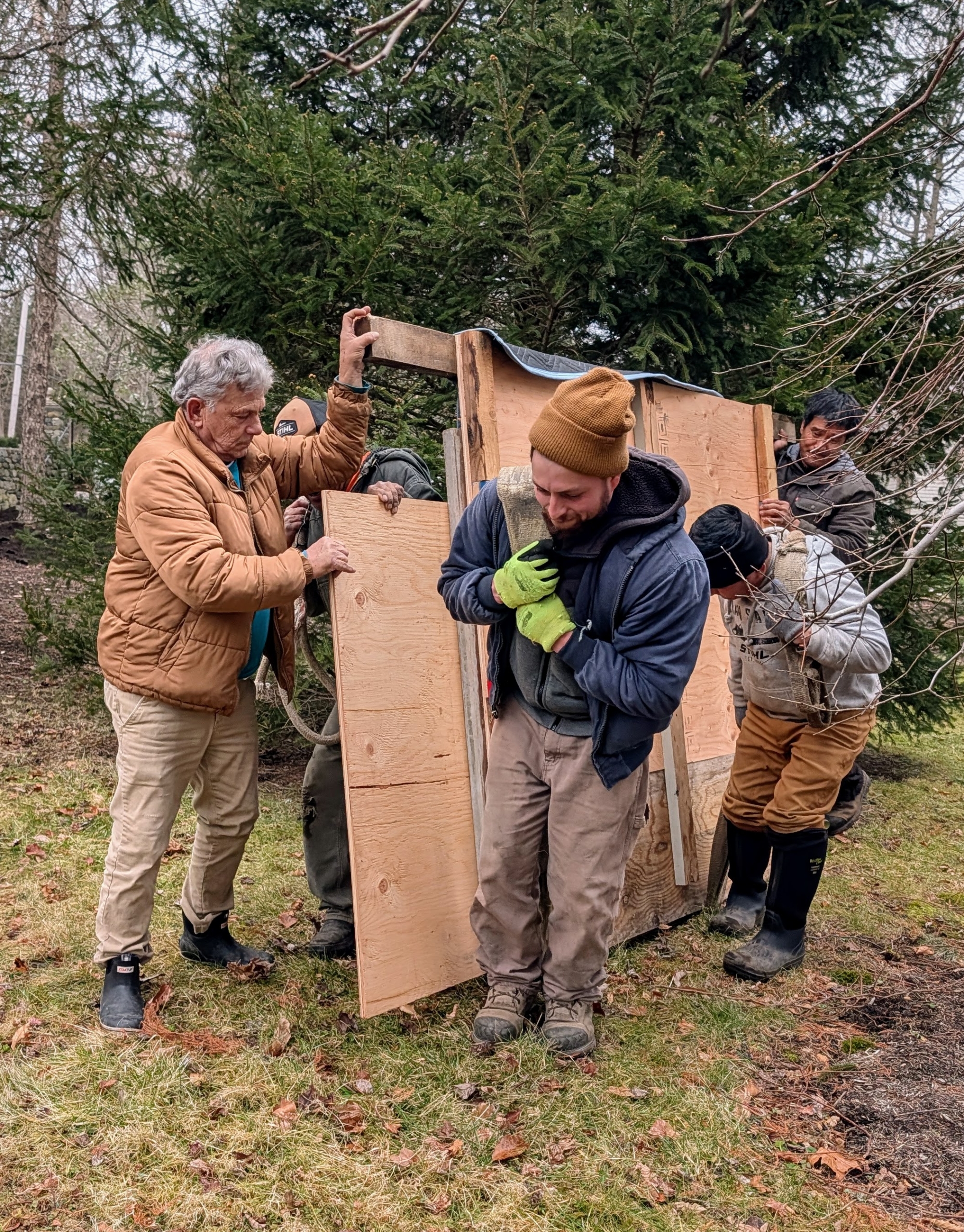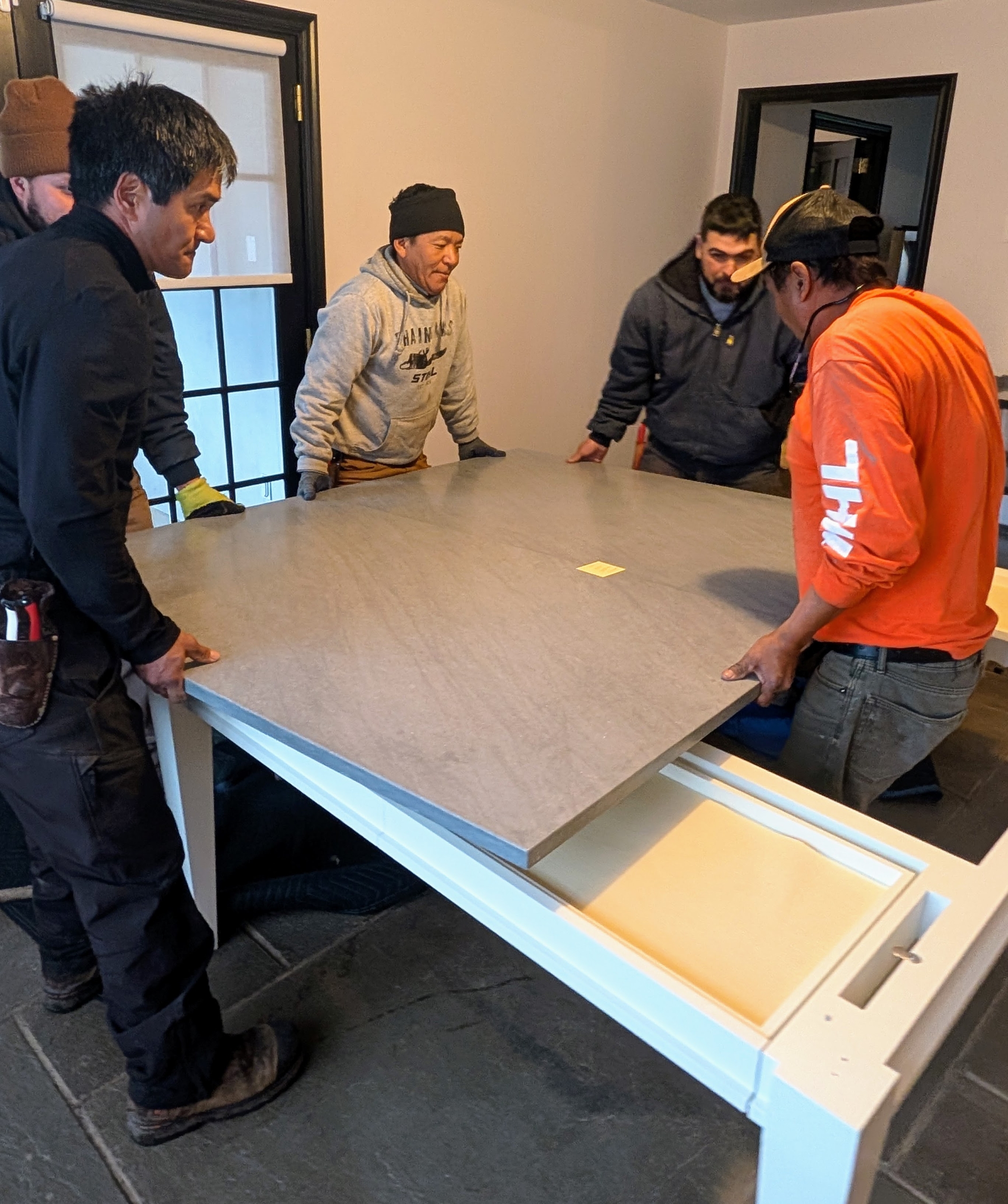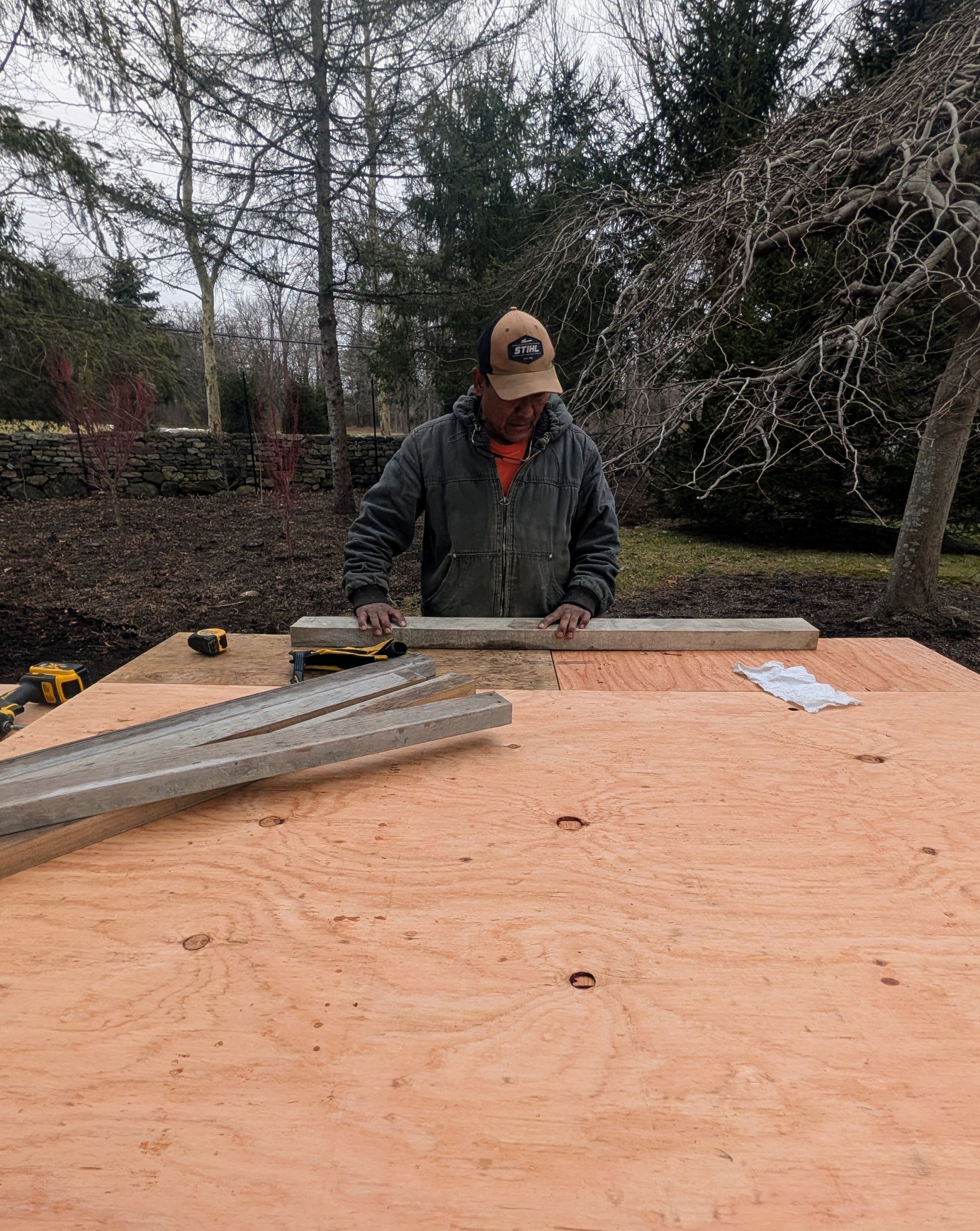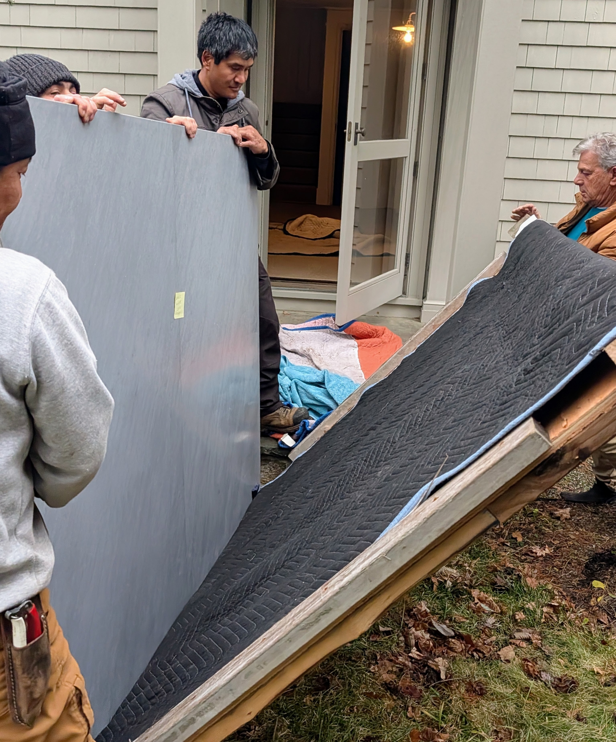 Yesterday, I asked my outdoor grounds crew to move a large table from my Tenant House to my production guest house. The table, which was previously used in my daughter's kitchen, was extremely heavy and fragile, so Pete built a wooden frame to protect it during transport and recruited the power of five to help get the table to its destination.