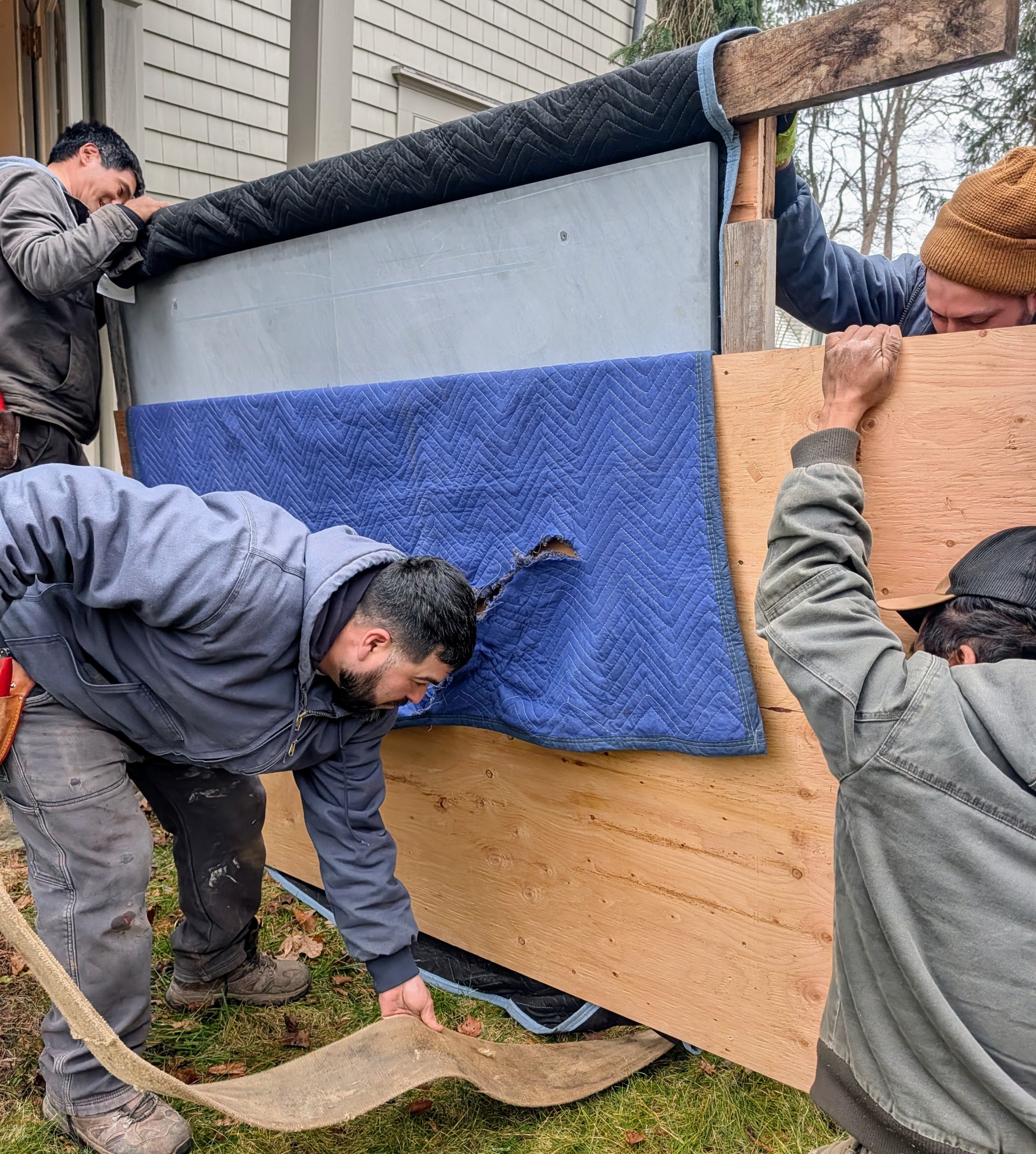 - So Pete, who has worked with me for years, thoughtfully devised a step-by-step process for moving the marble table. Using plywood and some other wooden scraps, Pete made a frame to hold the top in place during transport.