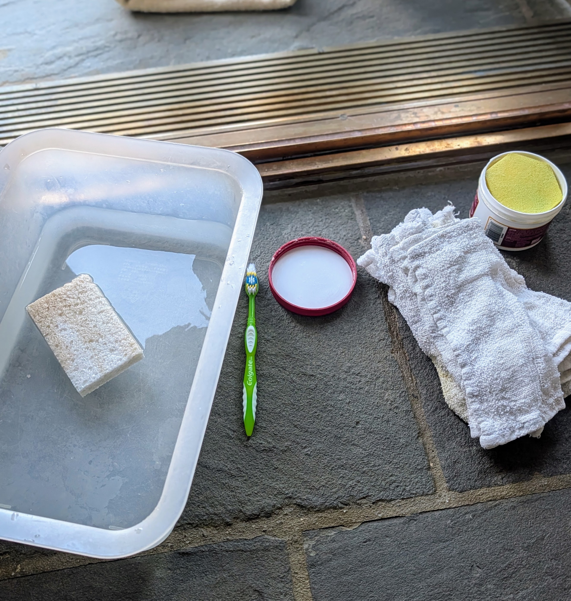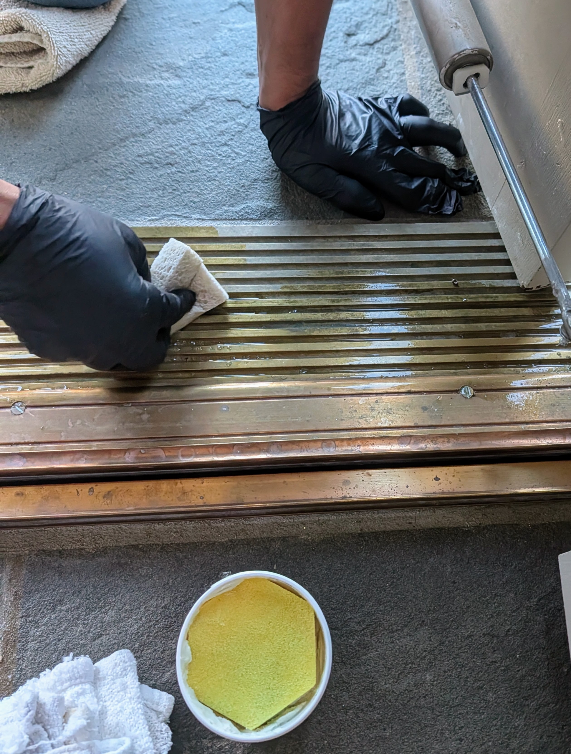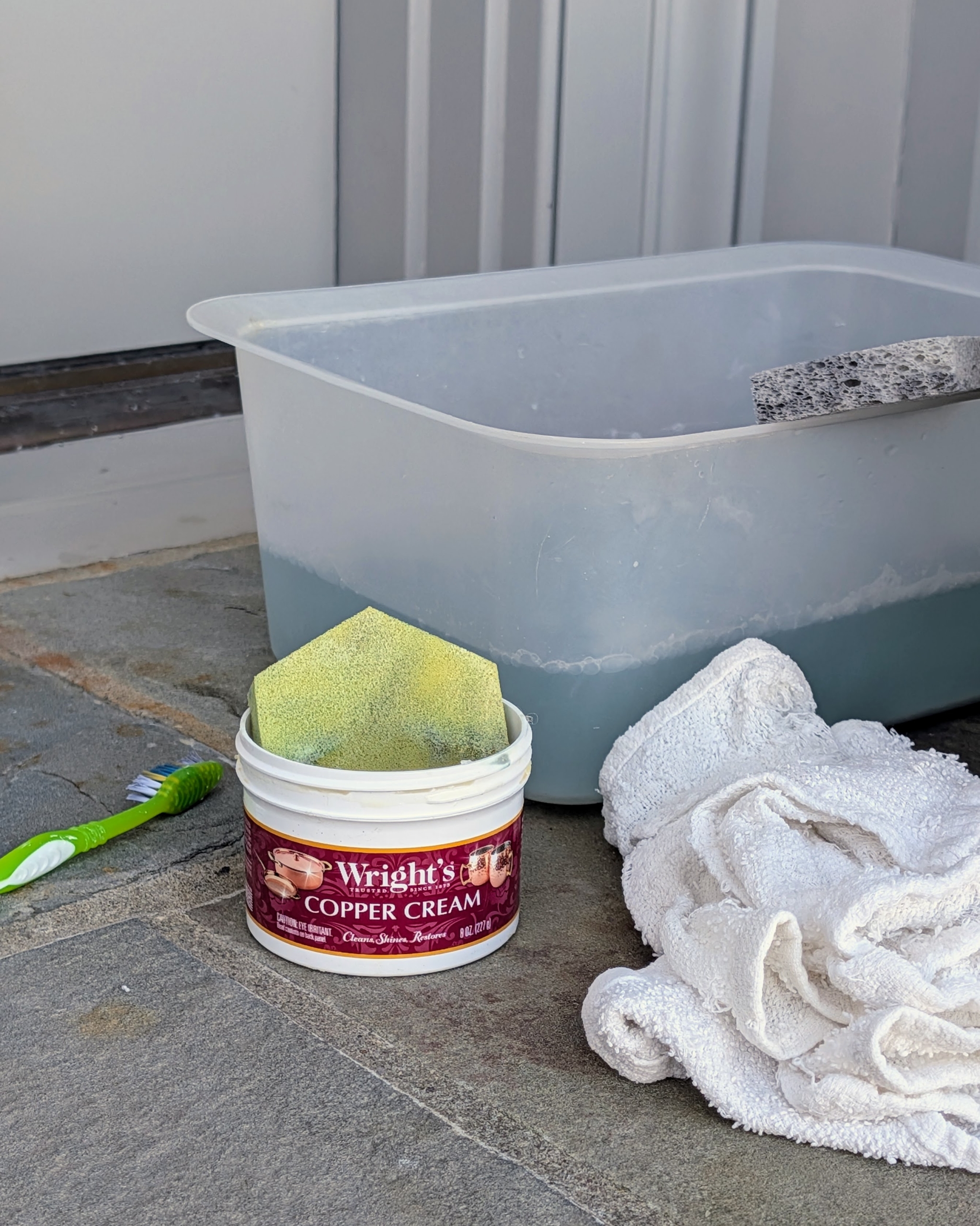 - For this job, Carlos gathers the Wright’s Copper Cream, which comes with an application sponge, an old toothbrush, some cleaning rags, and a tub of water with another sponge for removing the cleaner. I always tell my team to collect all the needed supplies first, so it saves time hunting them down later.