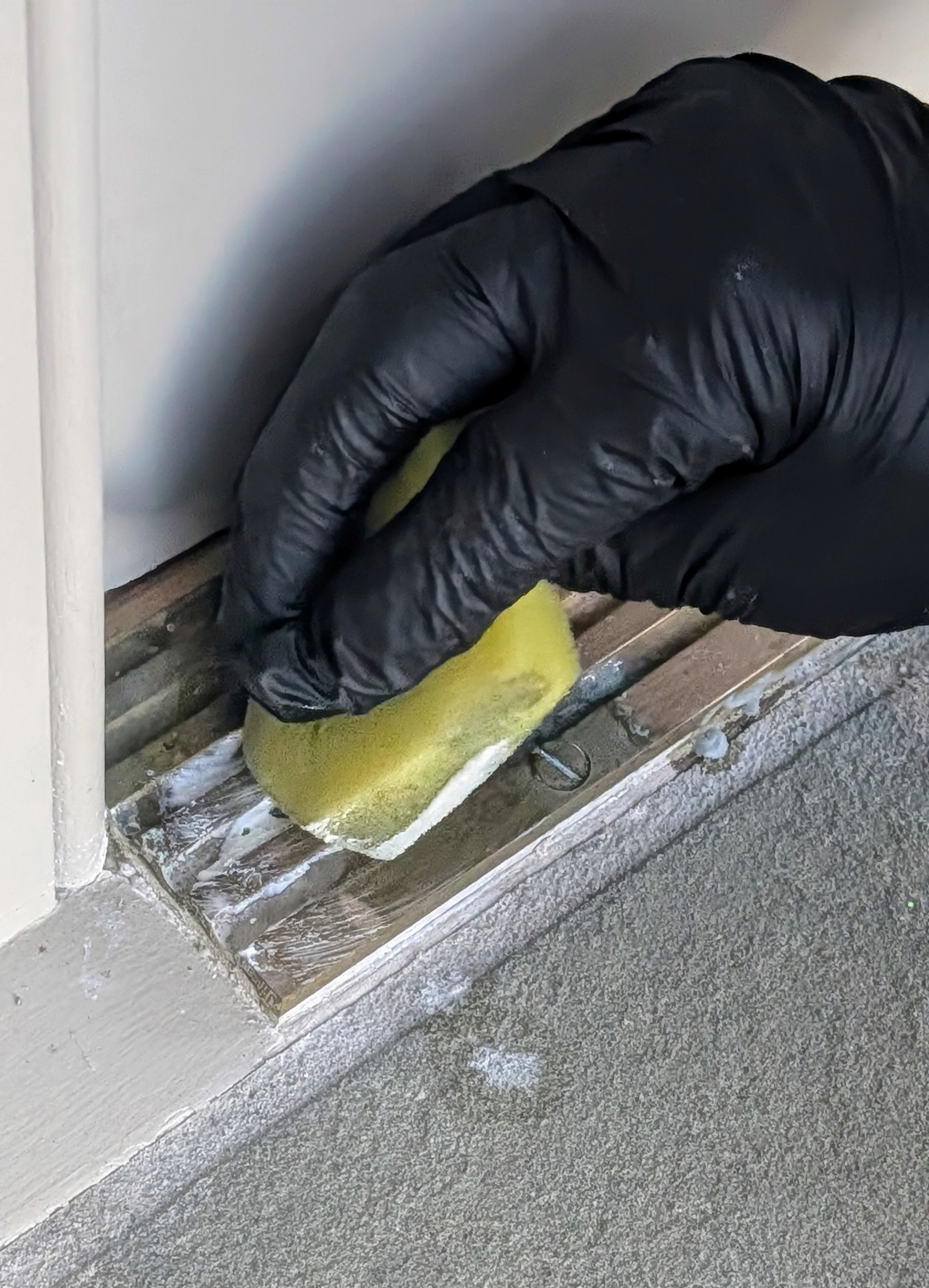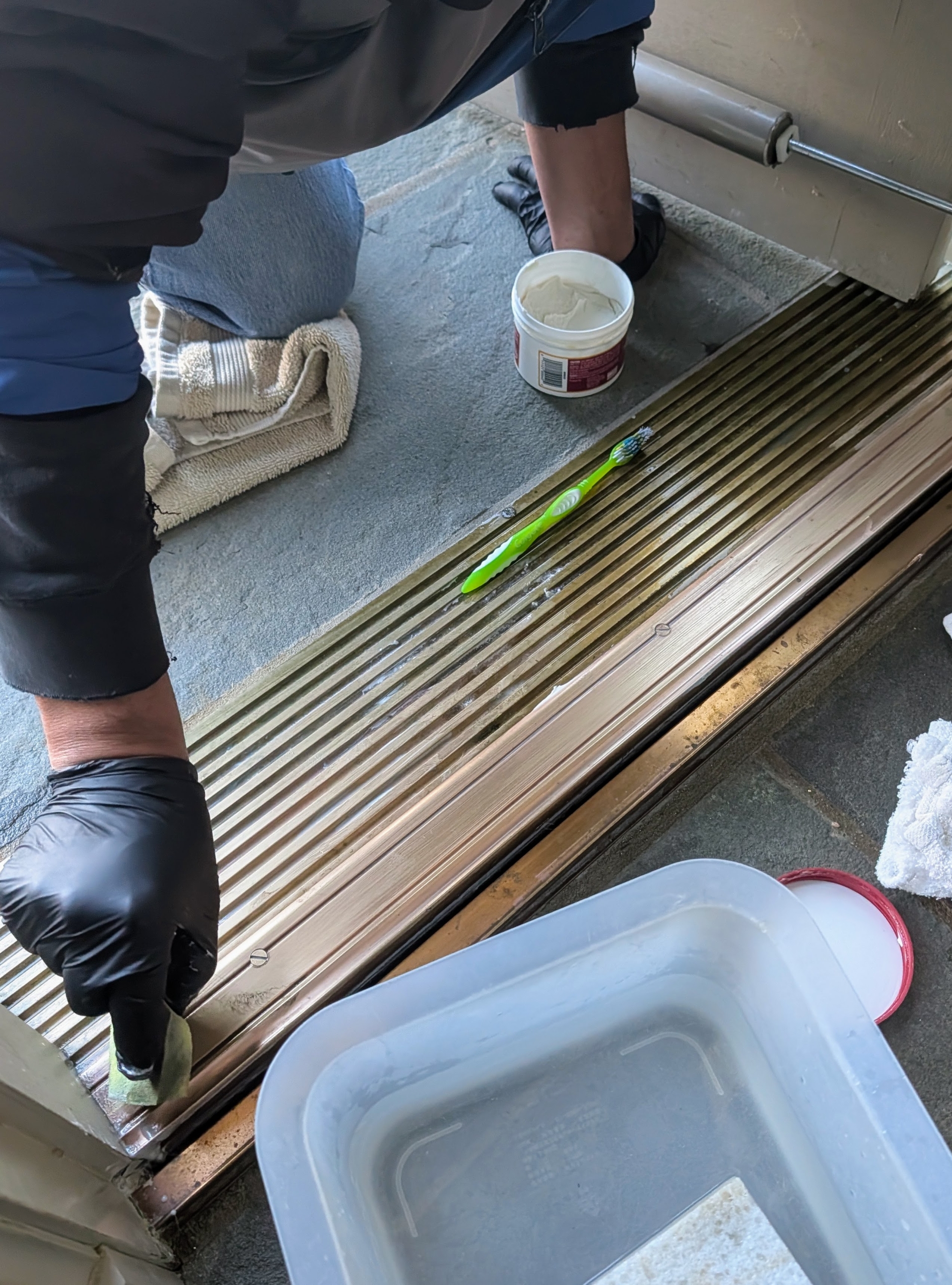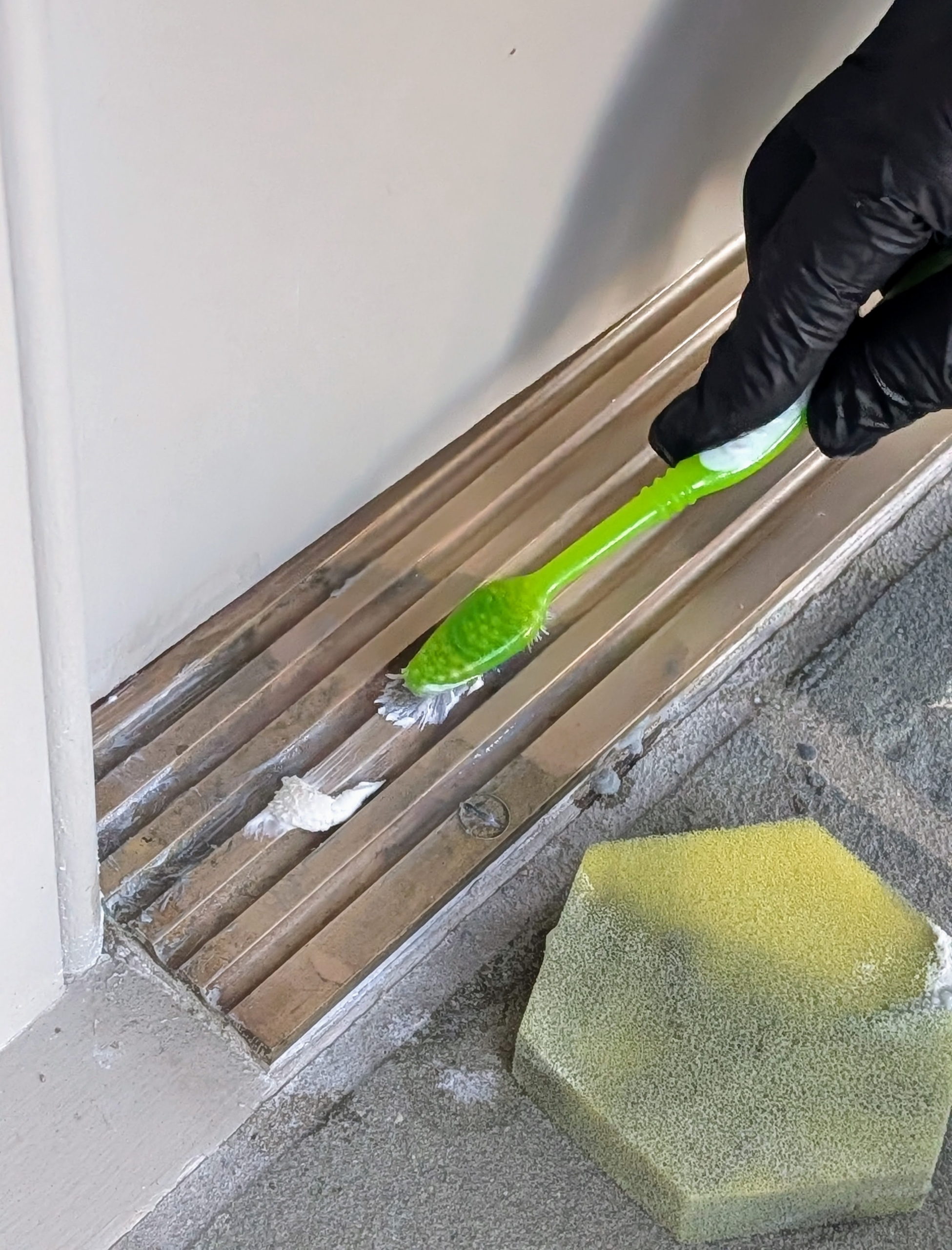 - Then he applies some of the Wright’s cleaning cream and gently wipes the dirt from in between the grooves of this threshold.