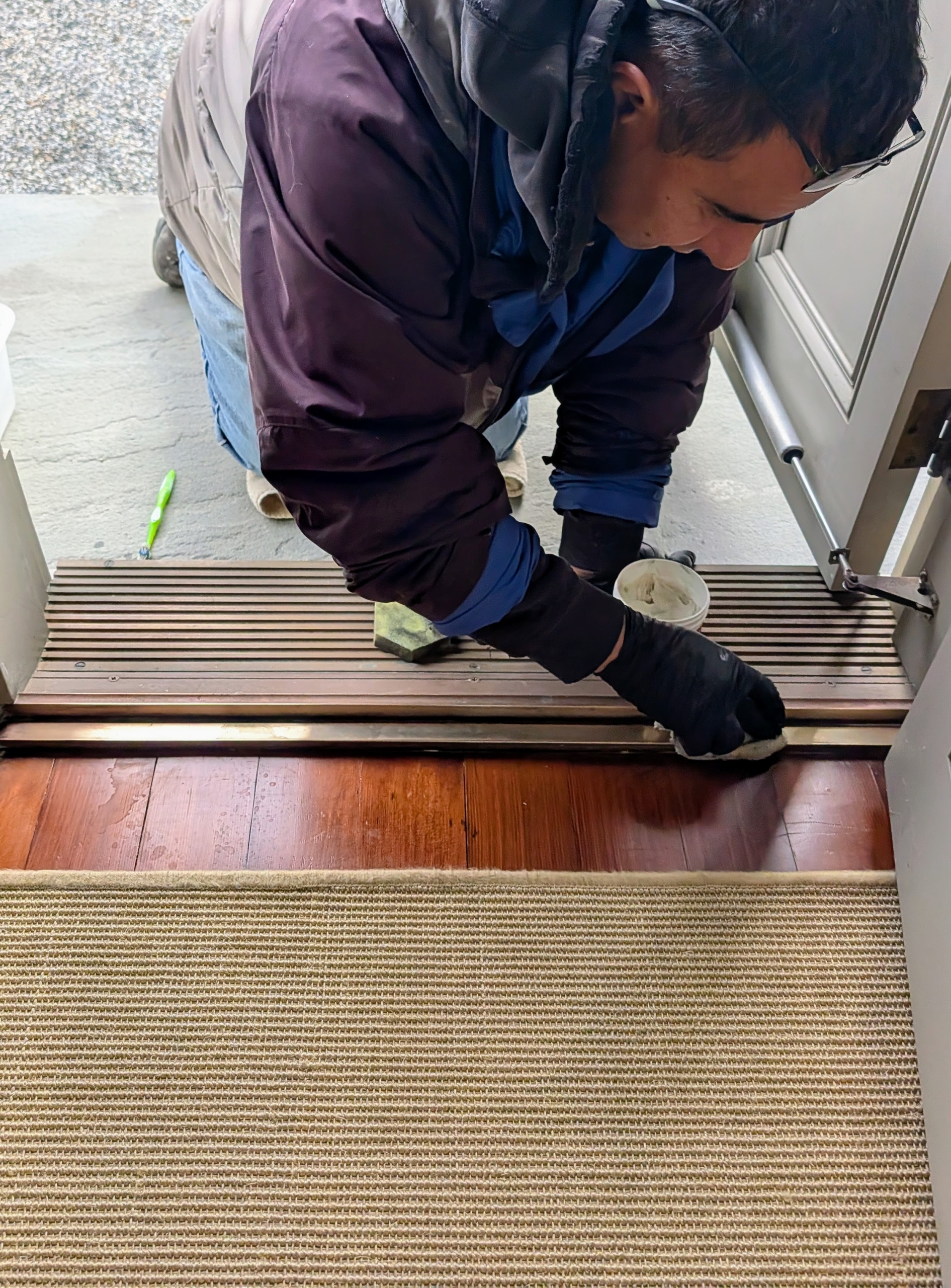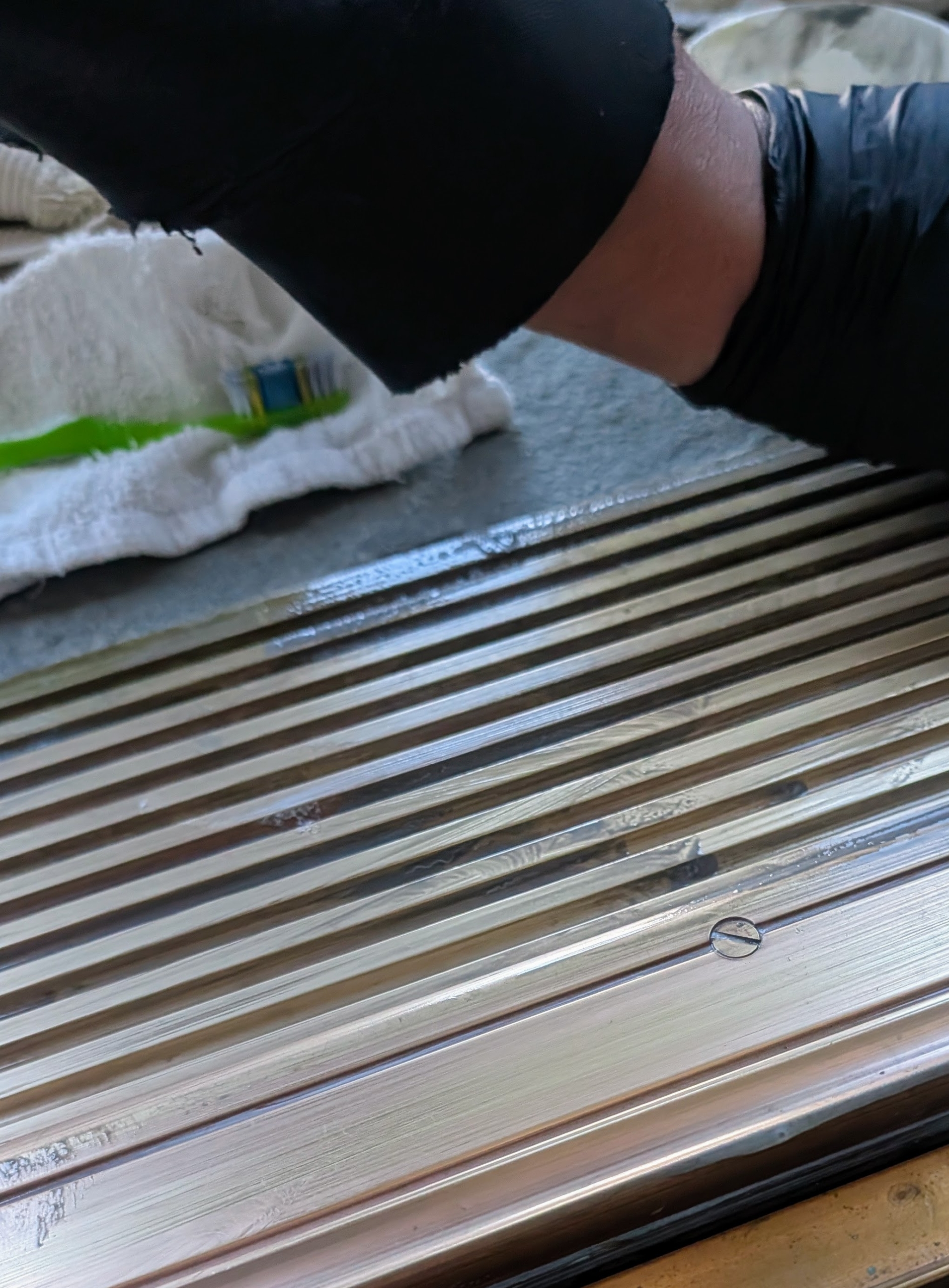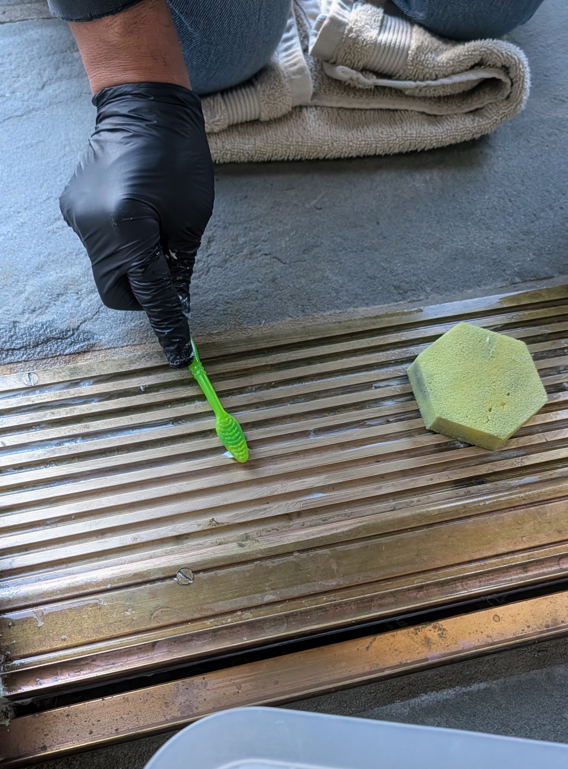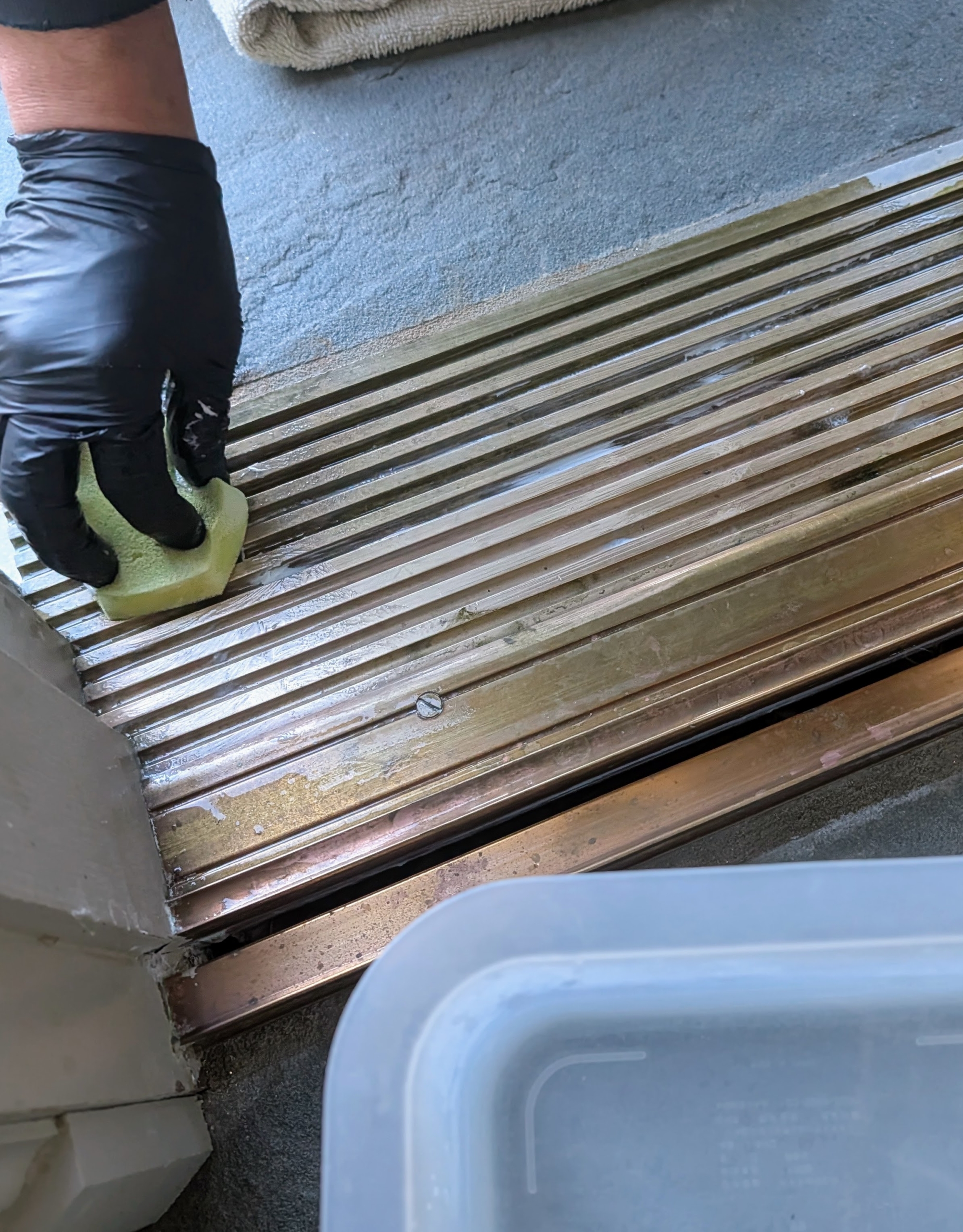 - Then he applies some of the Wright’s cleaning cream and gently wipes the dirt from in between the grooves of this threshold.