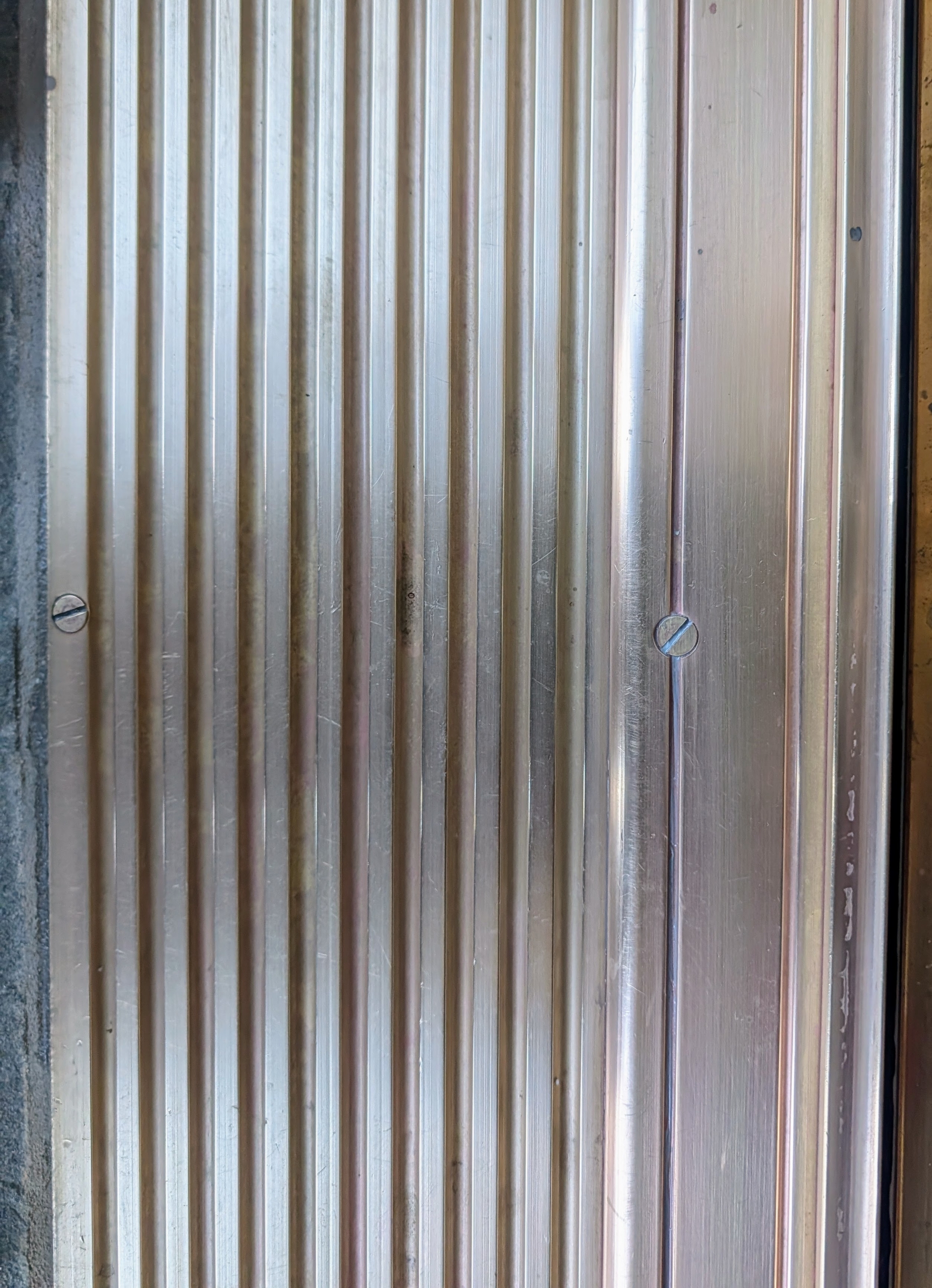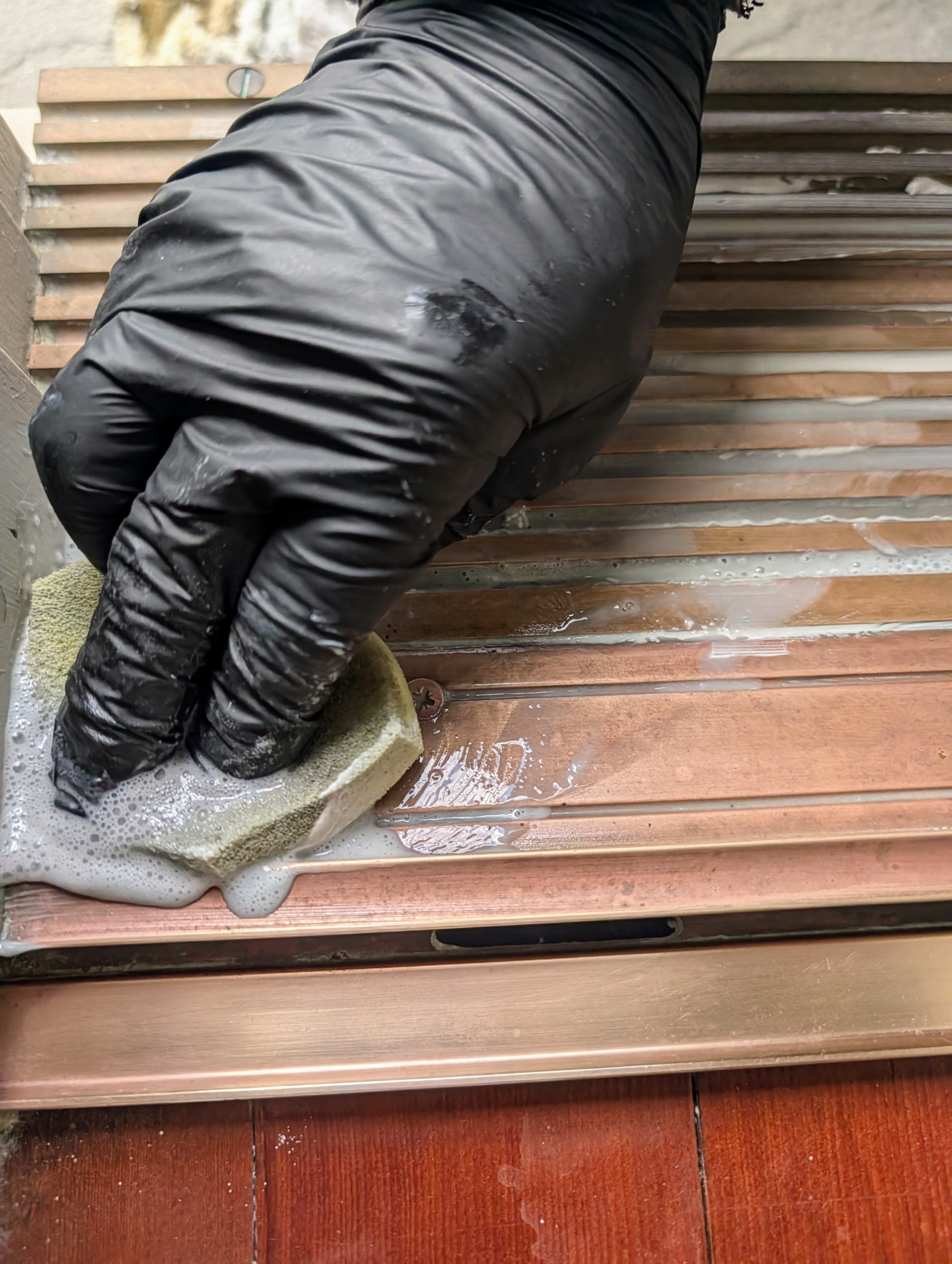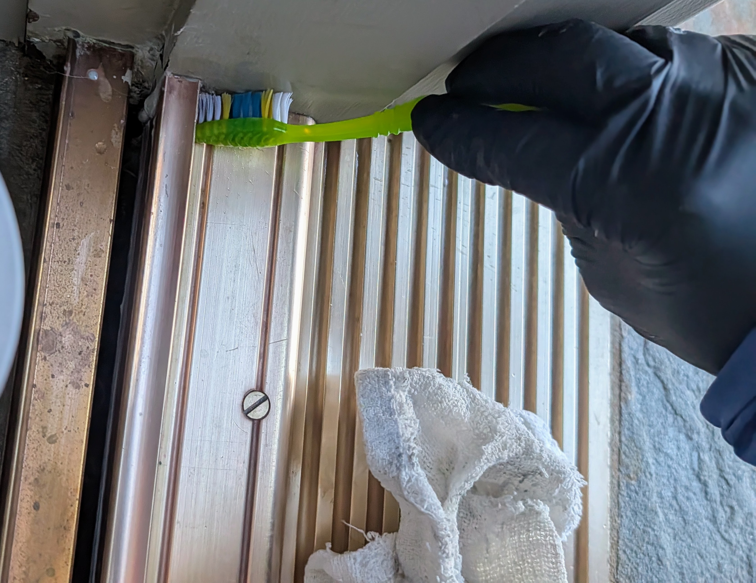 - Carlos uses the brush to gently clean the edges, where the door frame meets the metal.