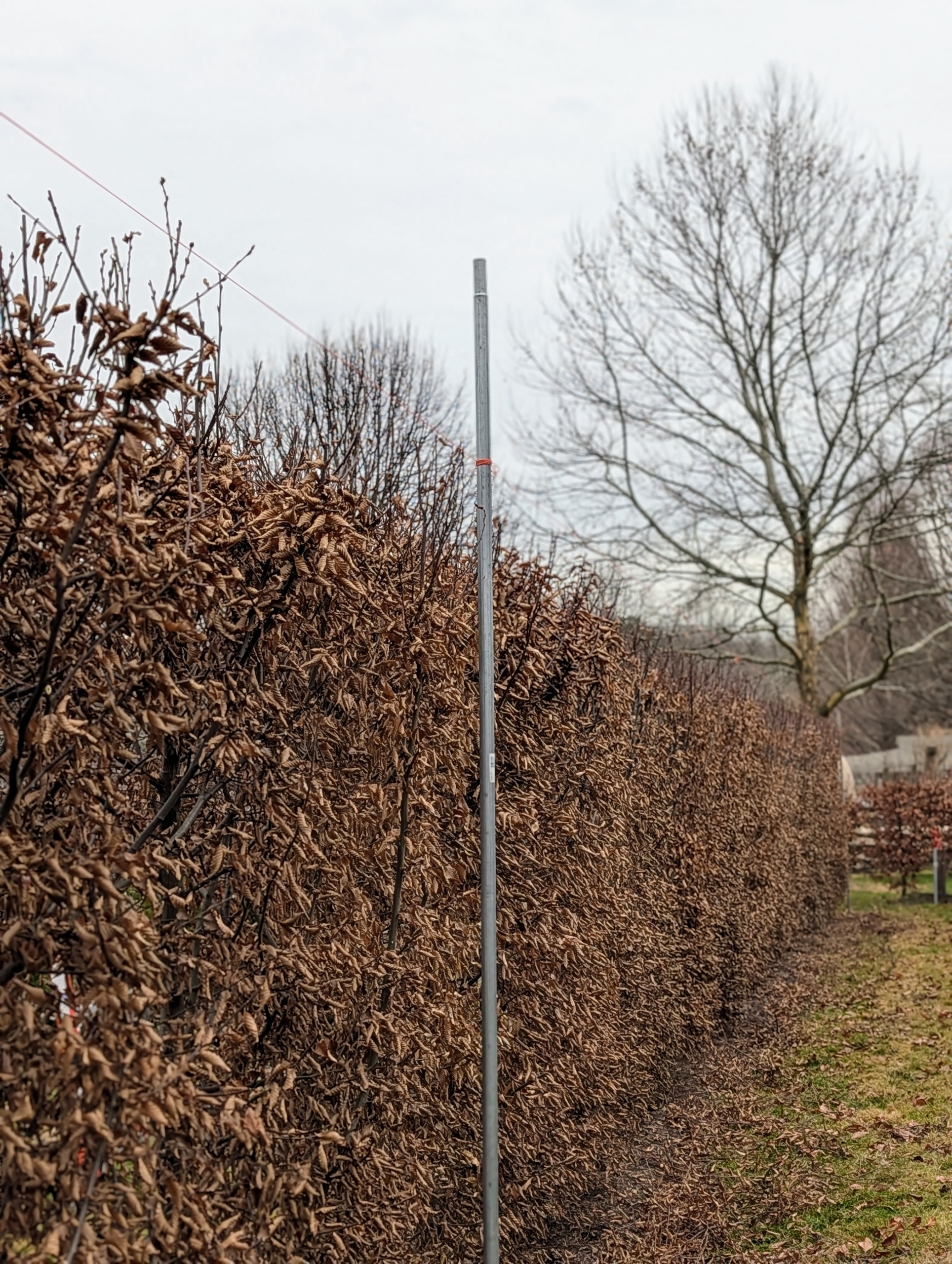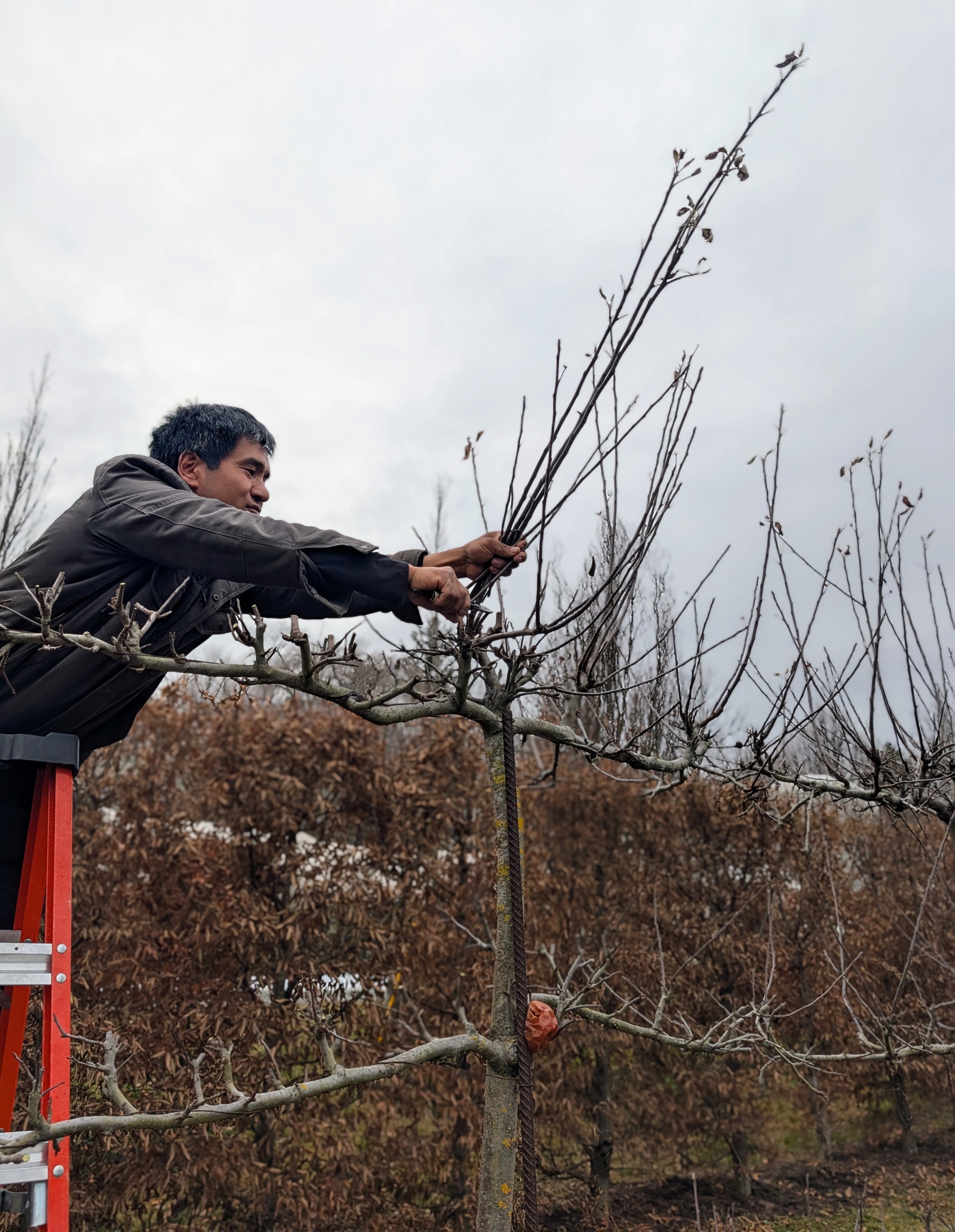 - One eld is tied to a sturdy yet temporary stake and then stretched down the row, to another pole. Good, thoughtful preparation is crucial to any pruning job.