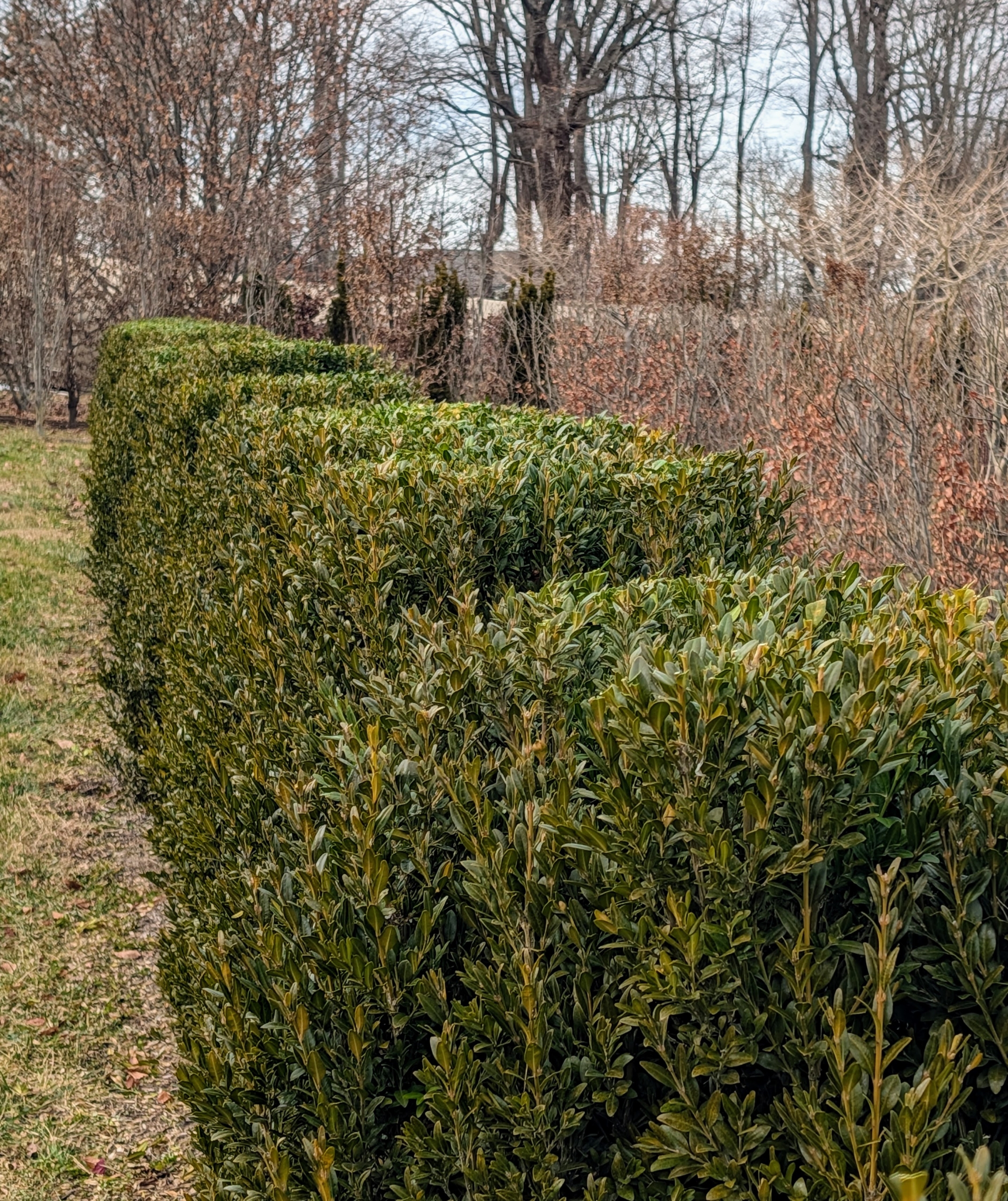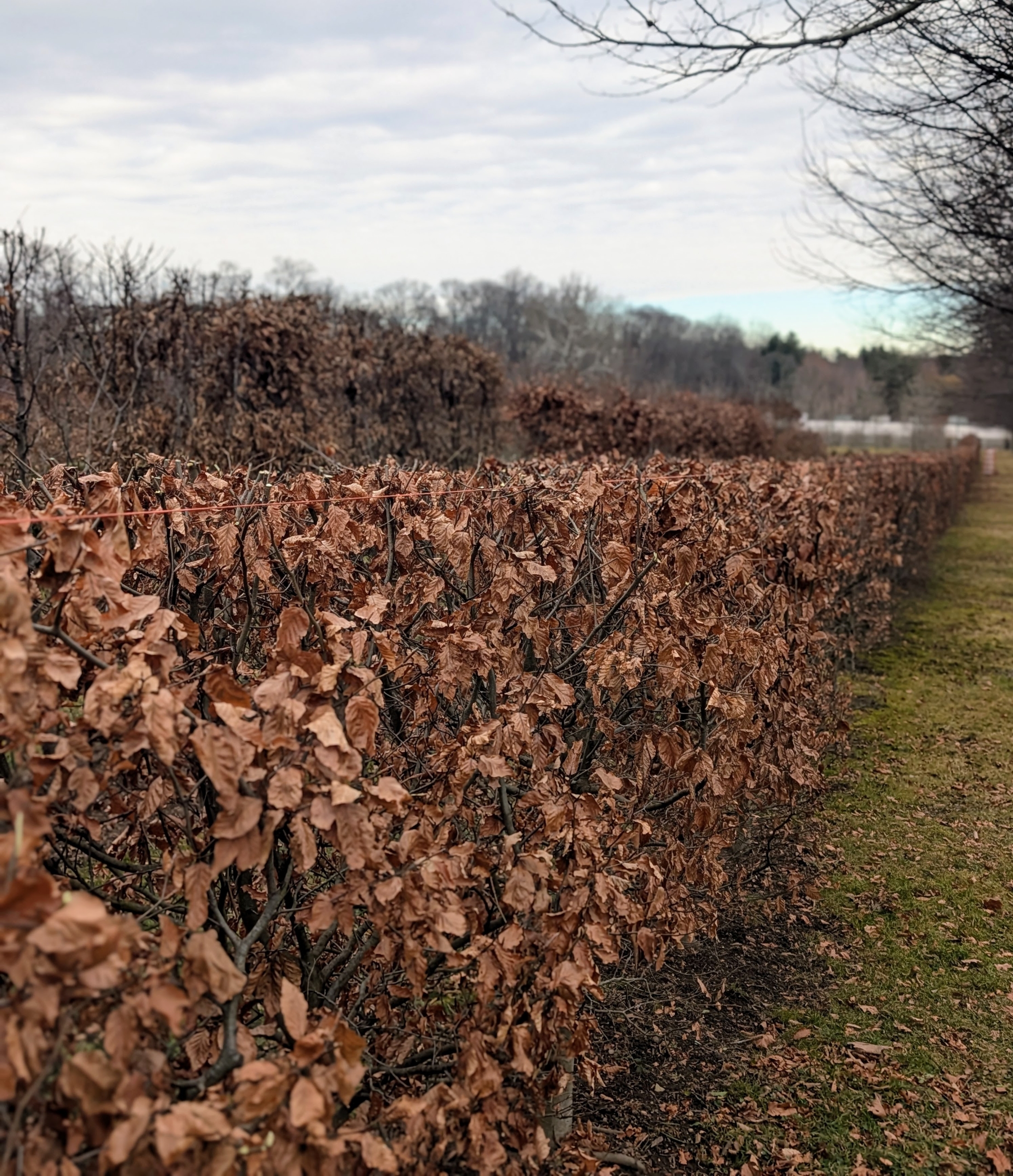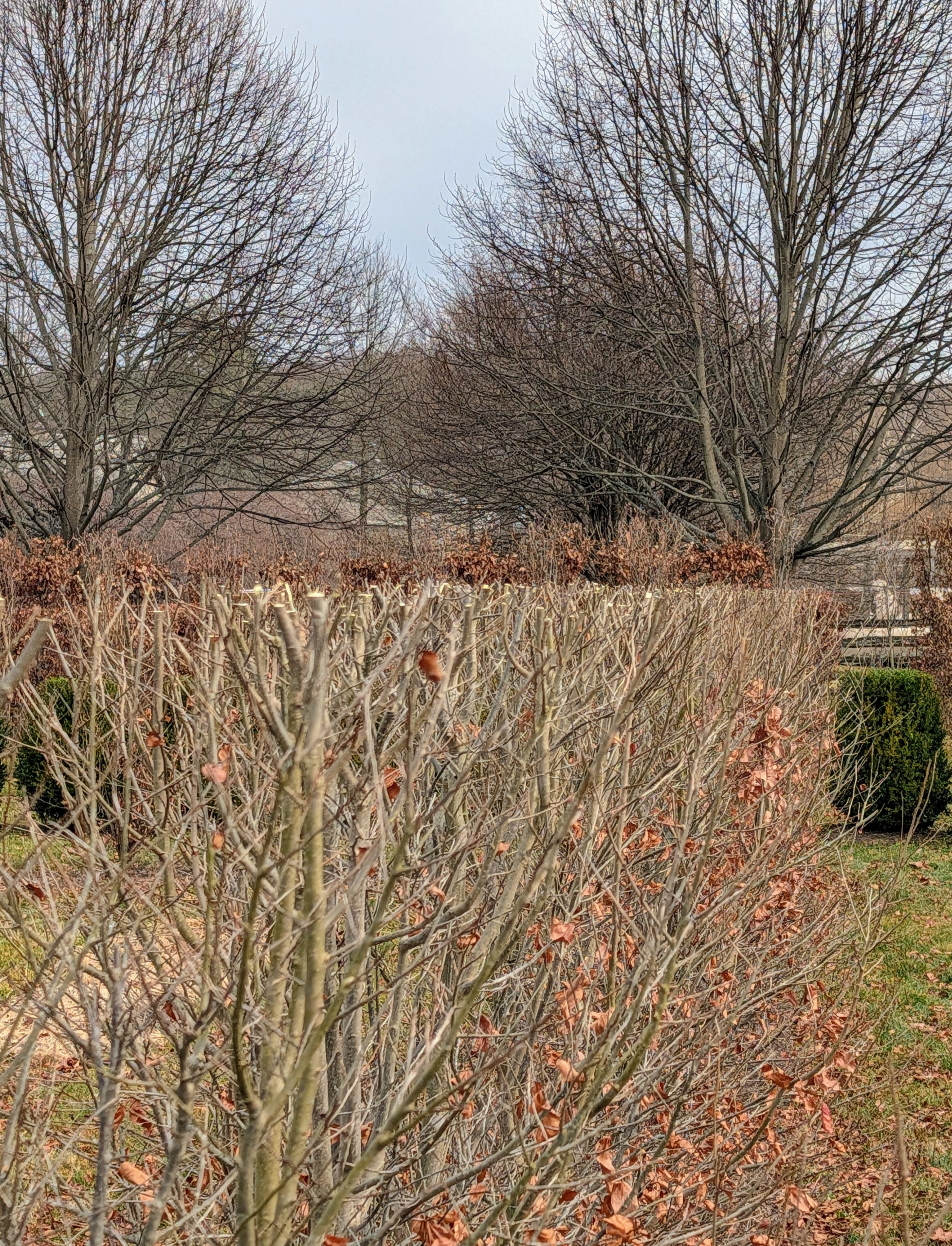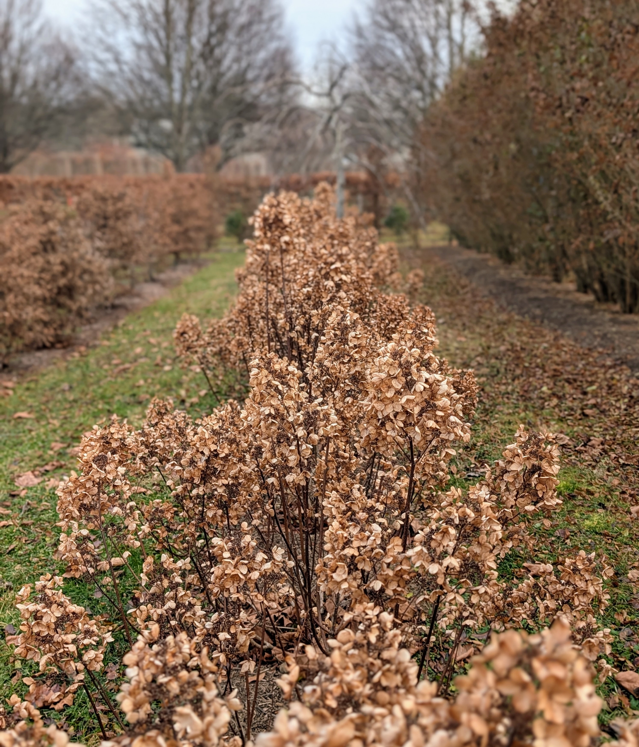 - Here is a row of hydrangeas, still with their dried flower heads intact. I planted a variety of different hedges, espaliers, trees, and shrubs in this maze – hundreds of specimens that add texture and interest, and all according to a detailed map I created specifically for the area.