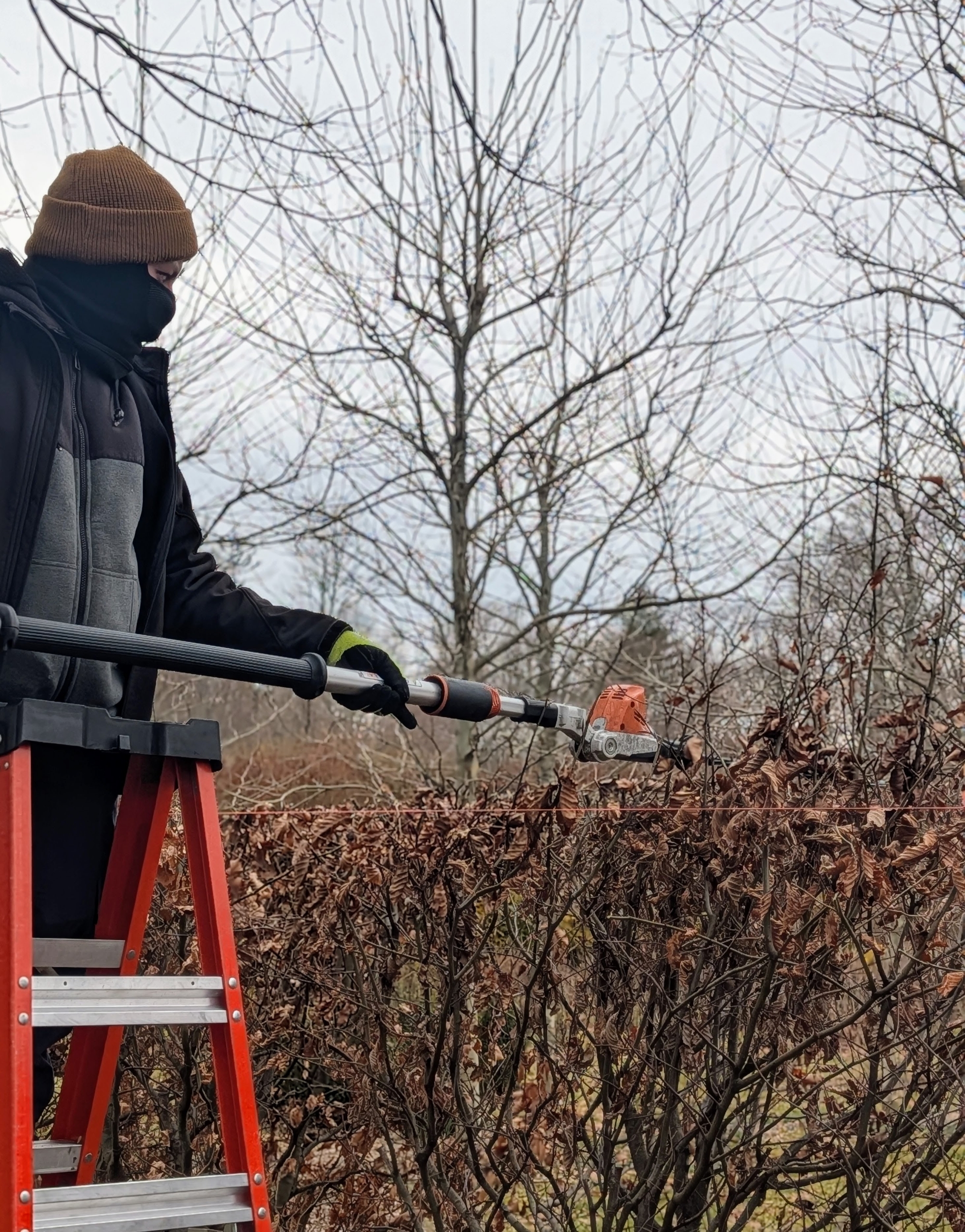 - When needed, the developing hedges are trimmed. Alex prunes the tops of the European beech that grow along the outermost edge of the maze. He makes sure they are all cut to the exact height by using the STIHL HLA 86 Powered Extended-Reach Hedge Trimmer.