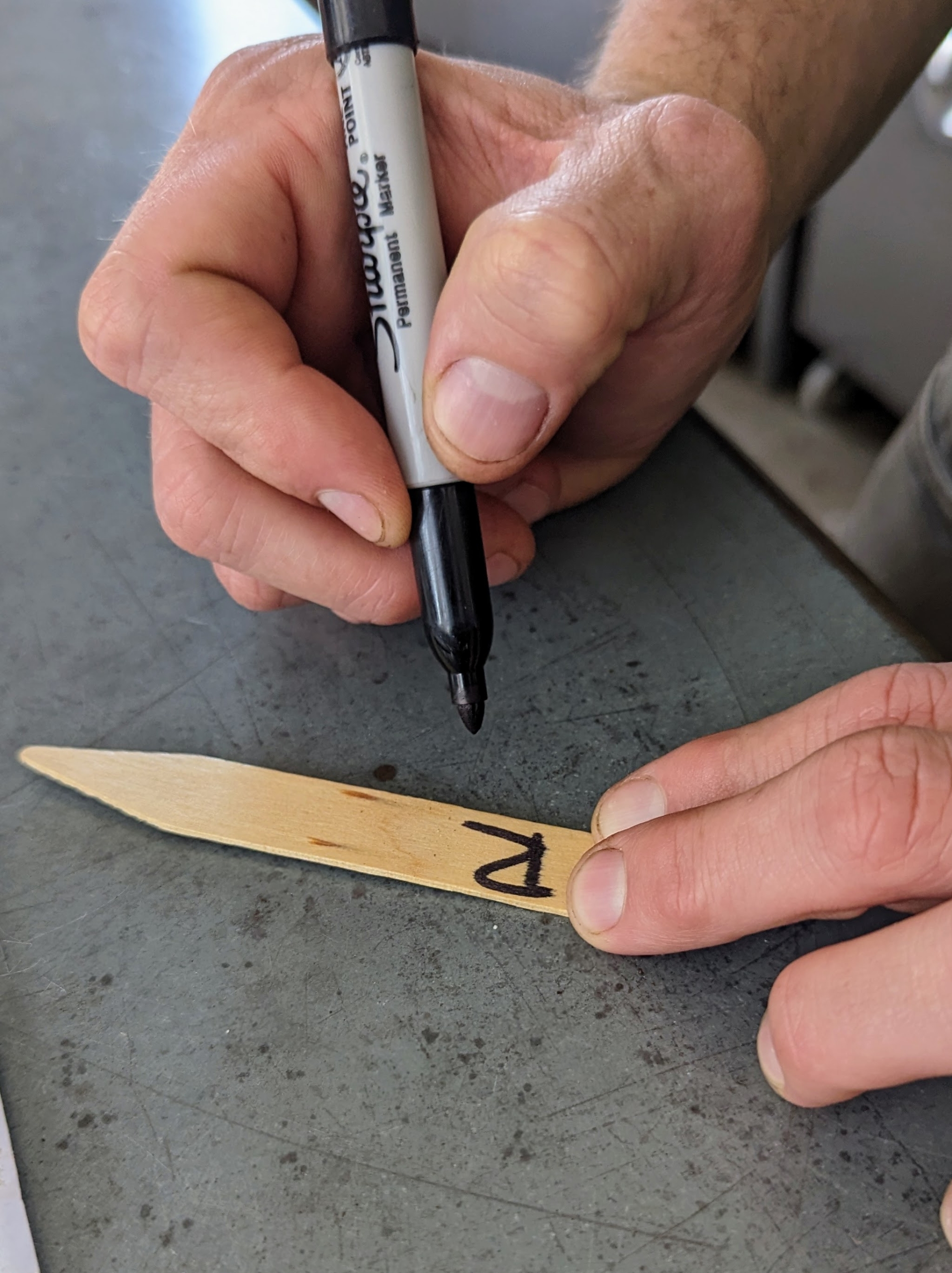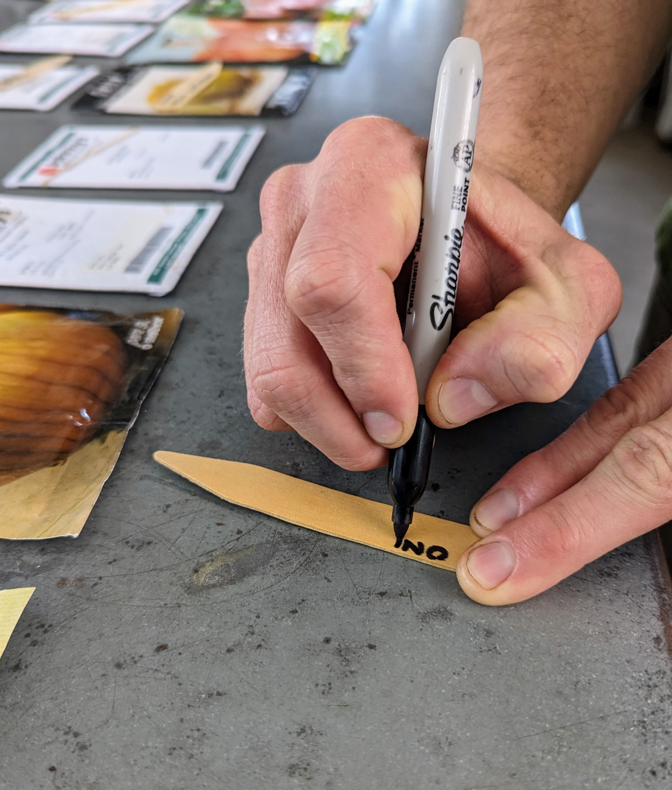 - On one side of the marker Ryan writes the vegetable variety so we can keep track of what grows well and what doesn’t.