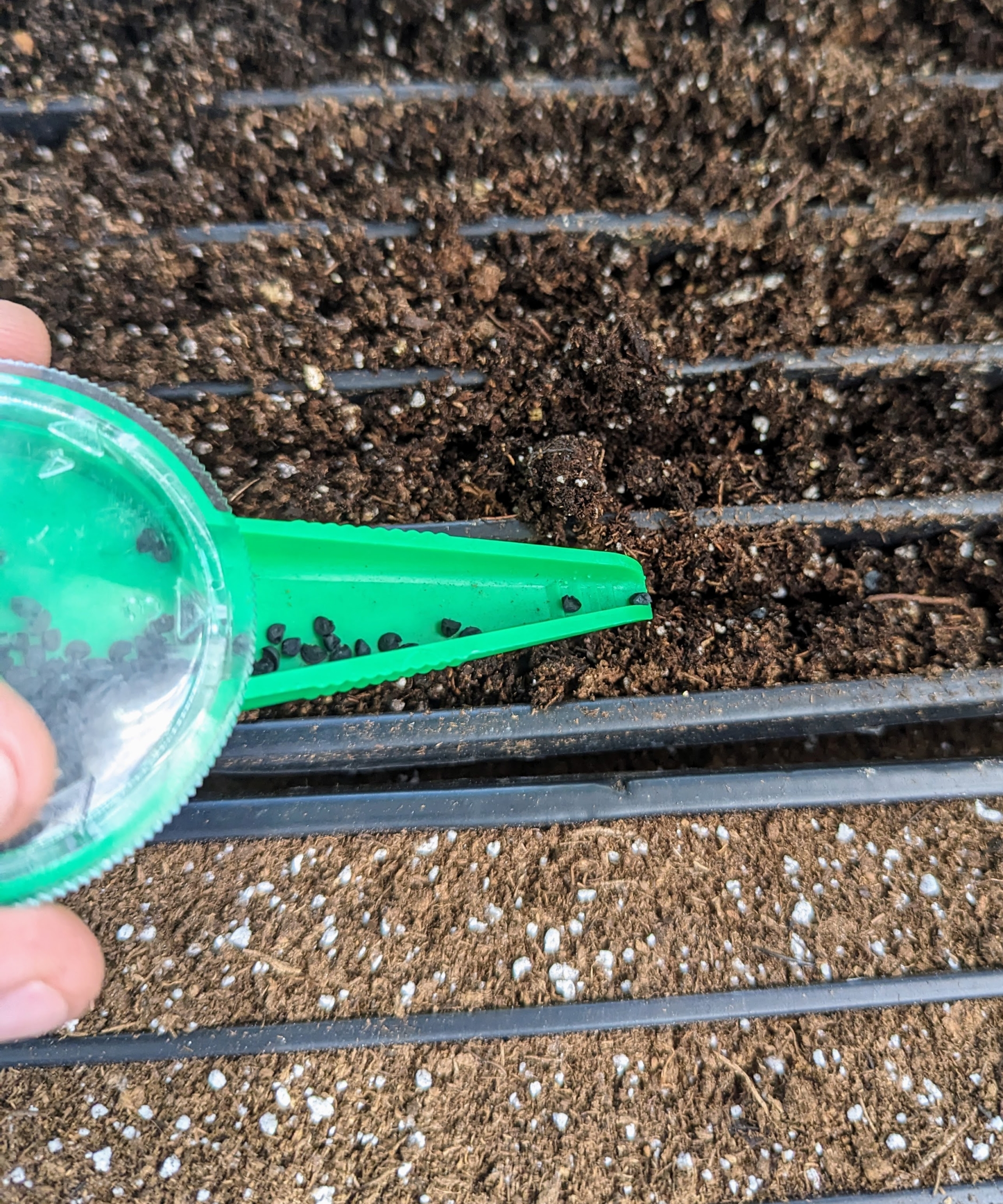 - Johnny’s Selected Seeds offers a Hand Seed Sower to help drop the seeds into the trays.
