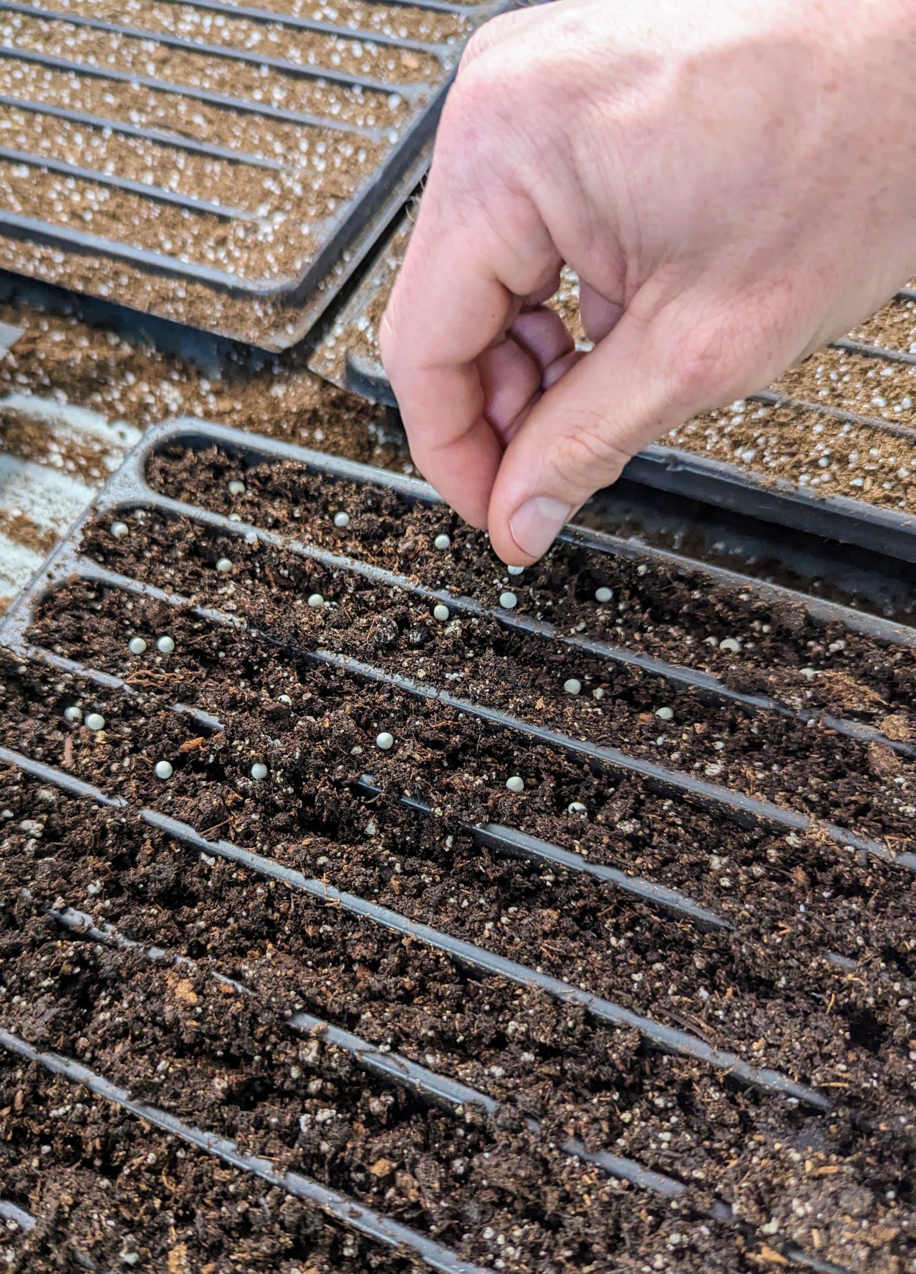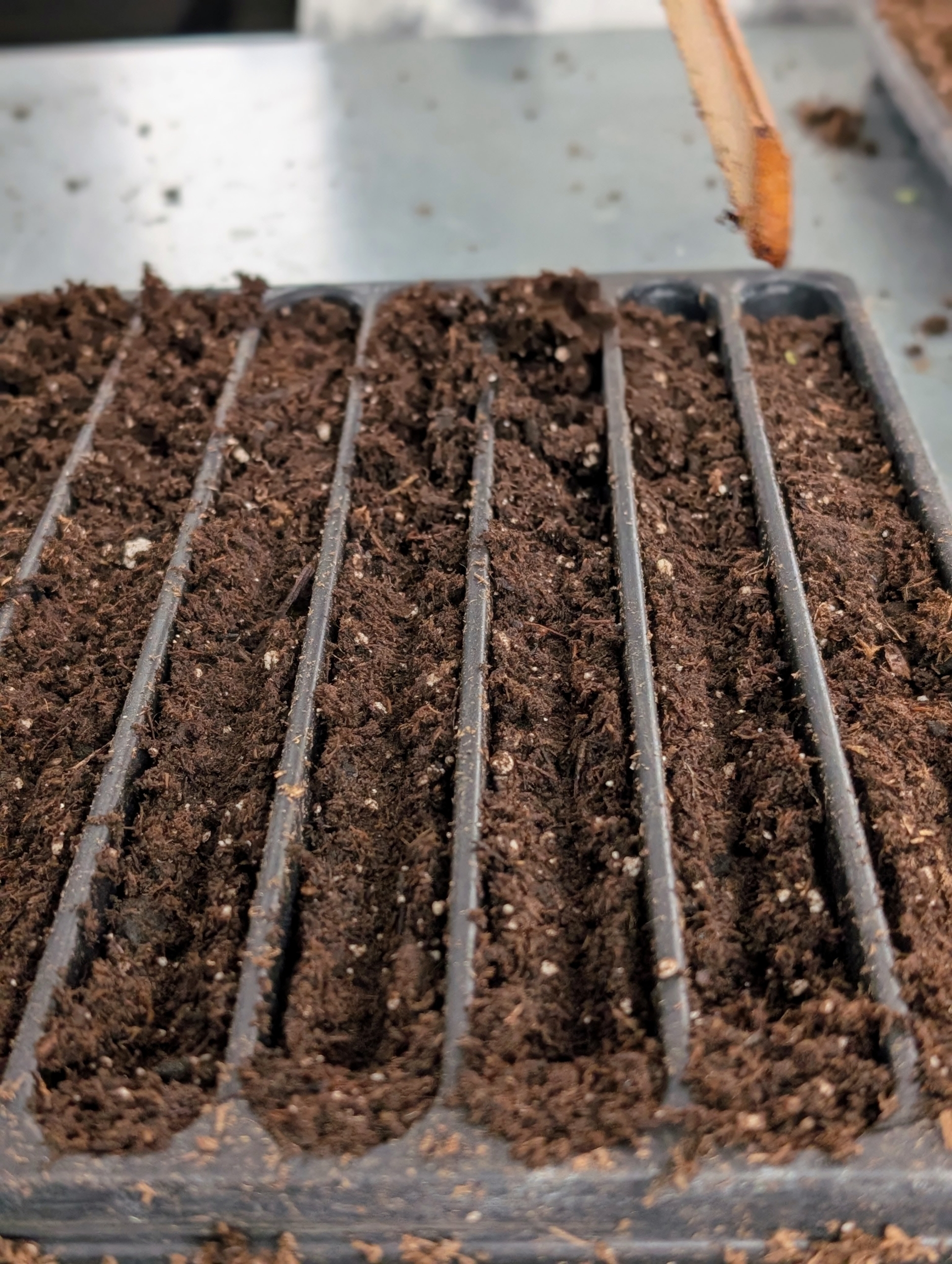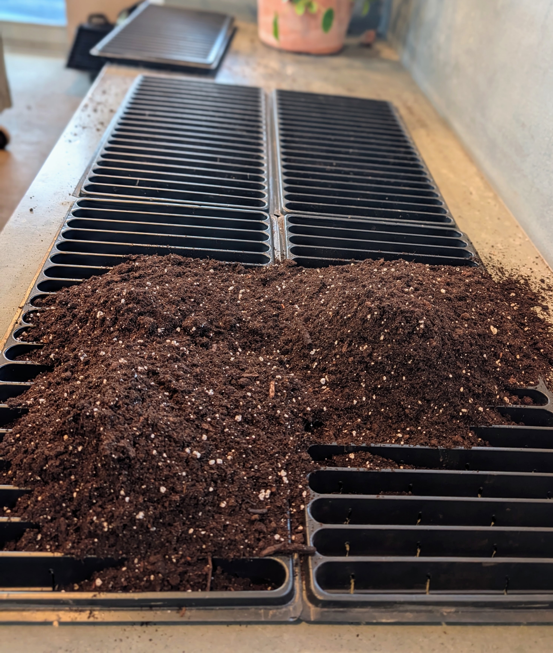 - Ryan also adds another thin layer of soil mix to this tray and tamps down lightly.