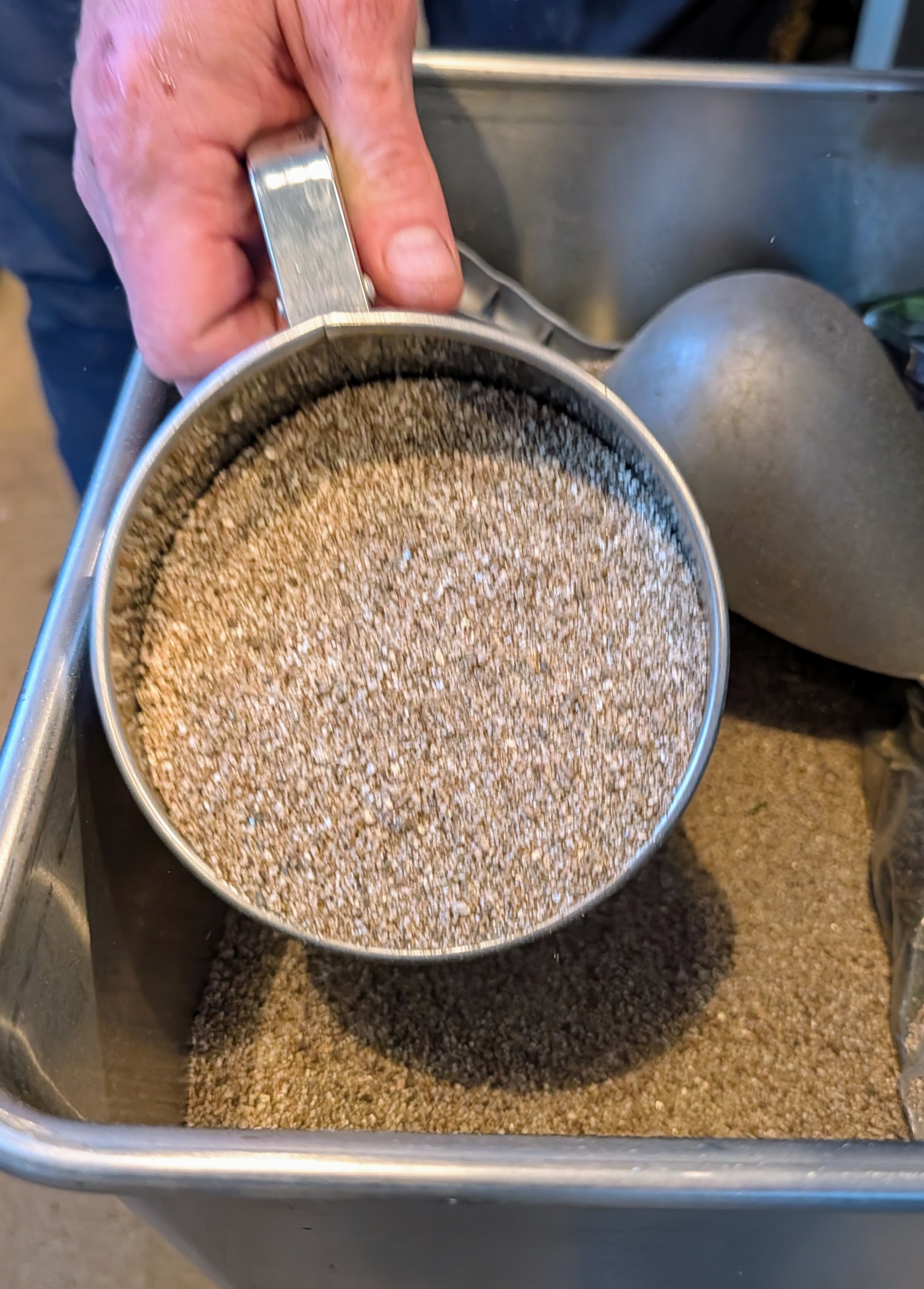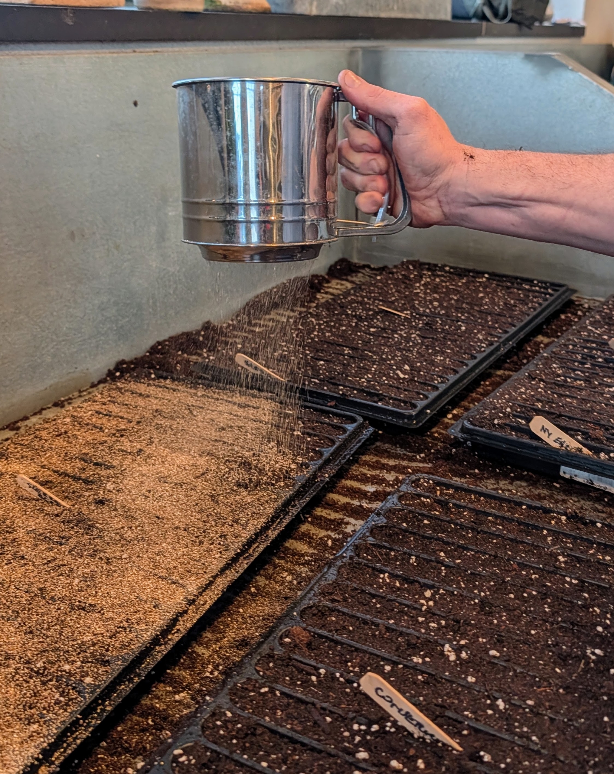 - And then Ryan uses a kitchen flour sifter to drop a thin layer of fine vermiculite on the seeds. Vermiculite is a lightweight mineral that holds water, but prevents water logging.