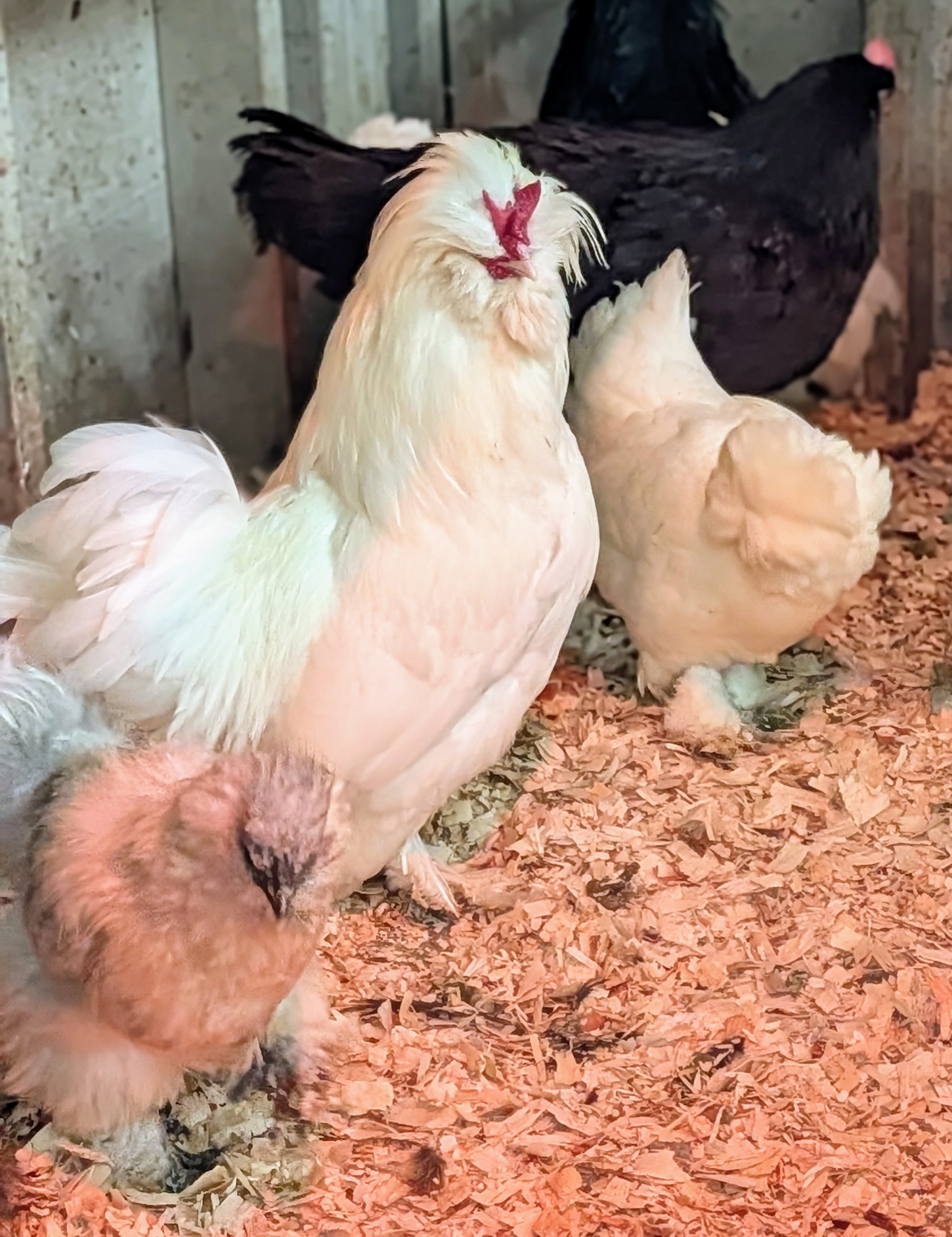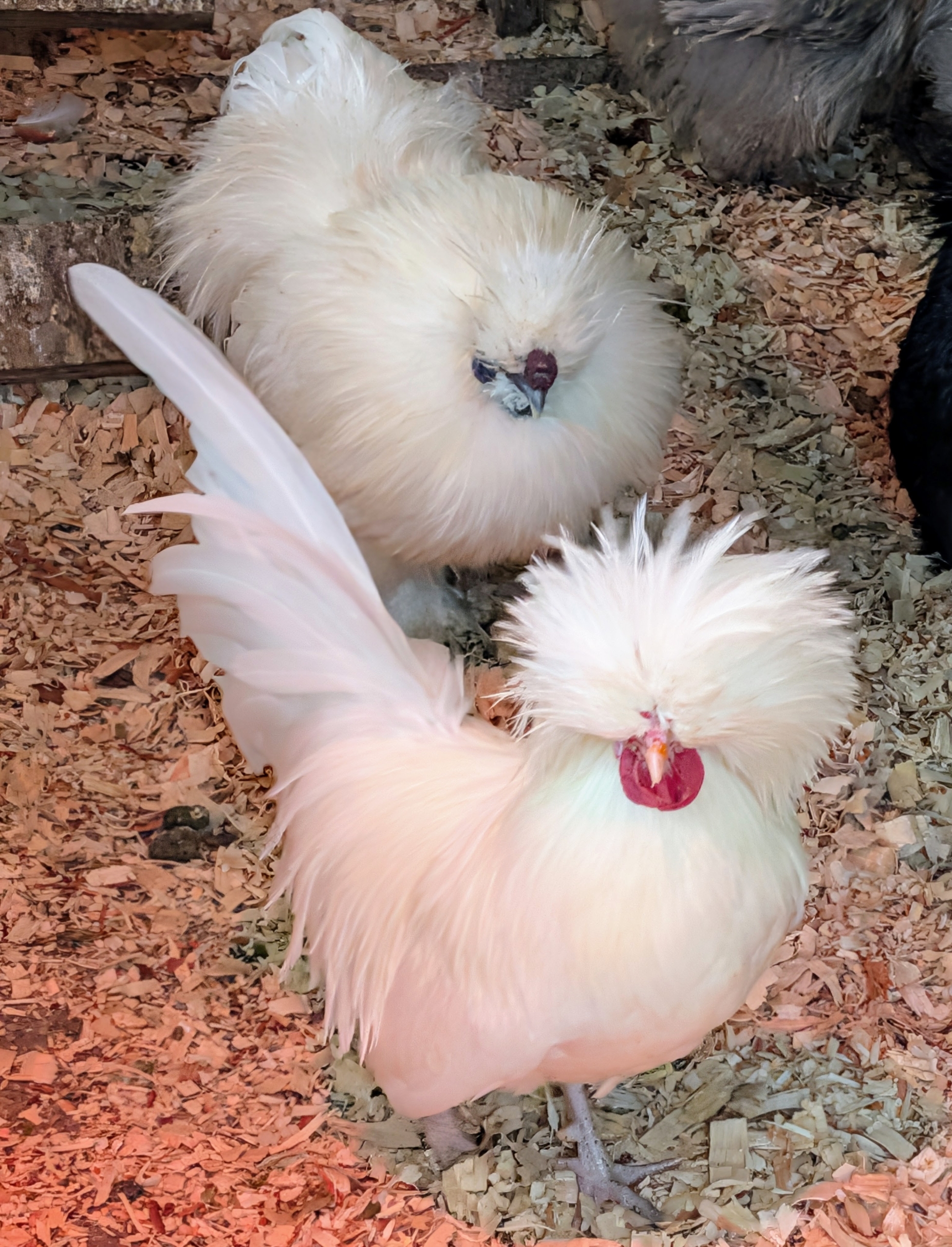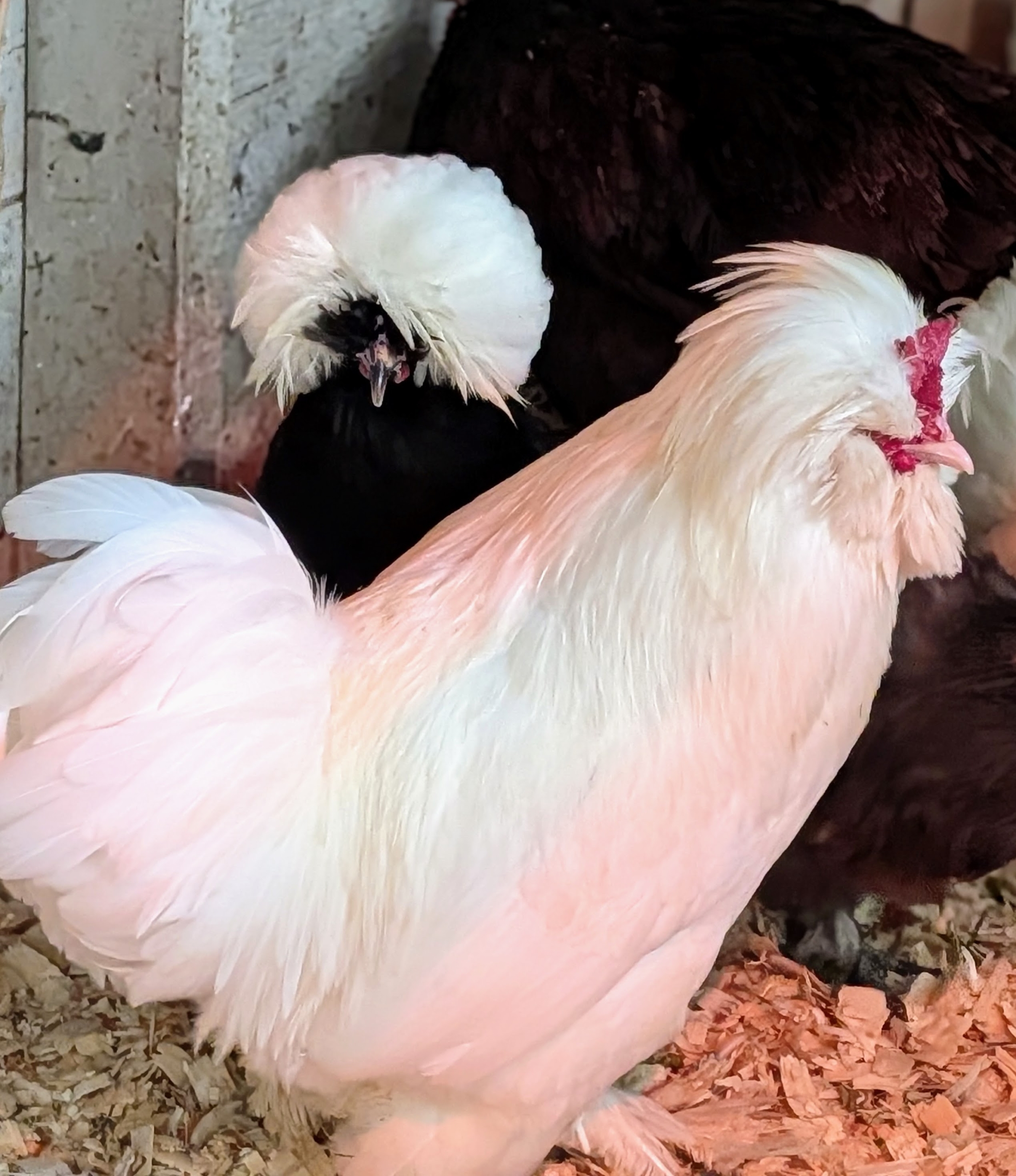 - Here is the white Polish rooster in front of a white Silkie rooster.