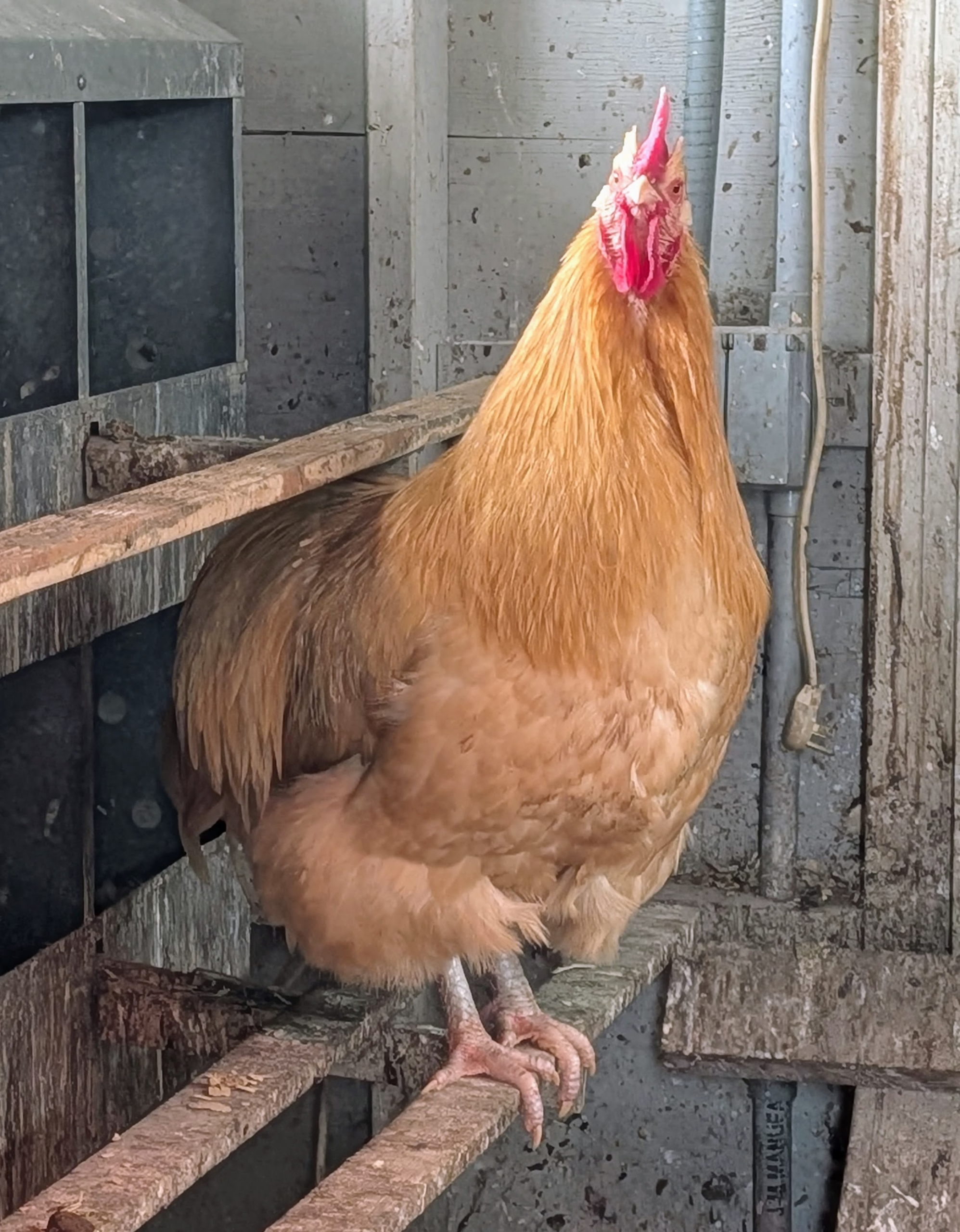 - This large rooster is a Buff Orpington. Its color is often described as gold. They were introduced from England in the 1800s and are very popular among poultry fanciers here in the US.
