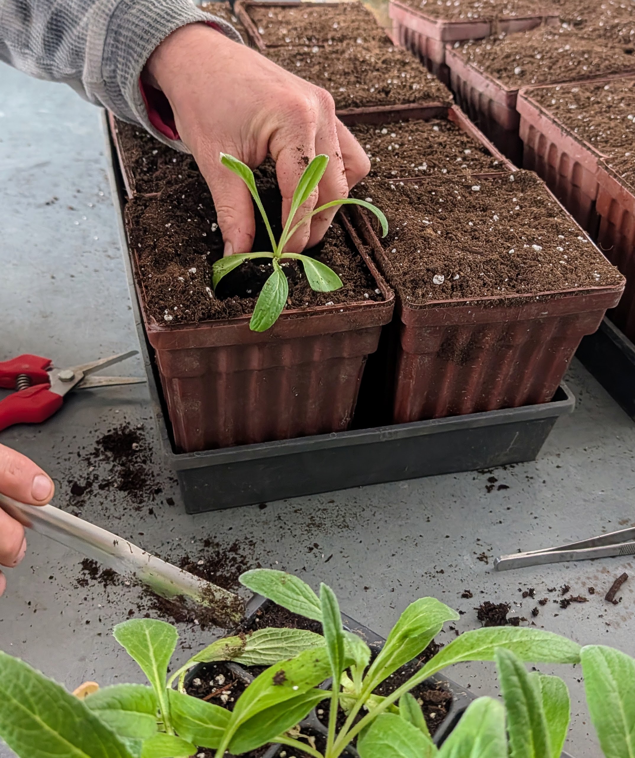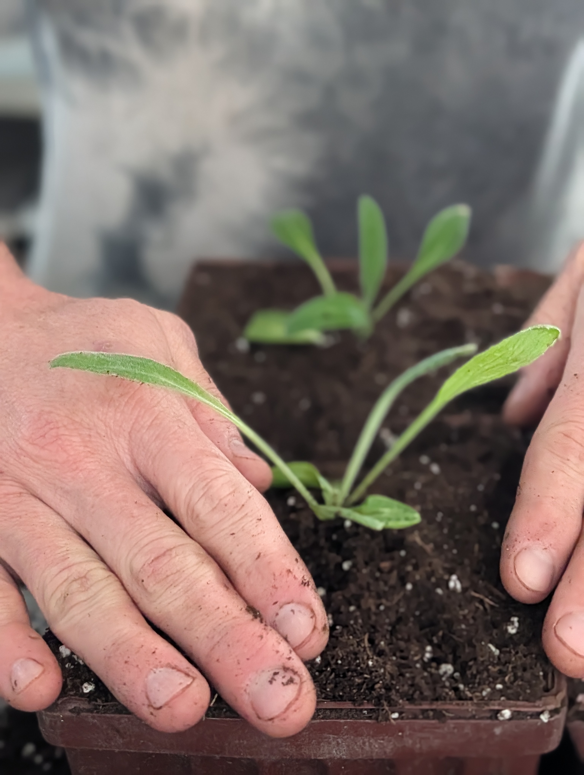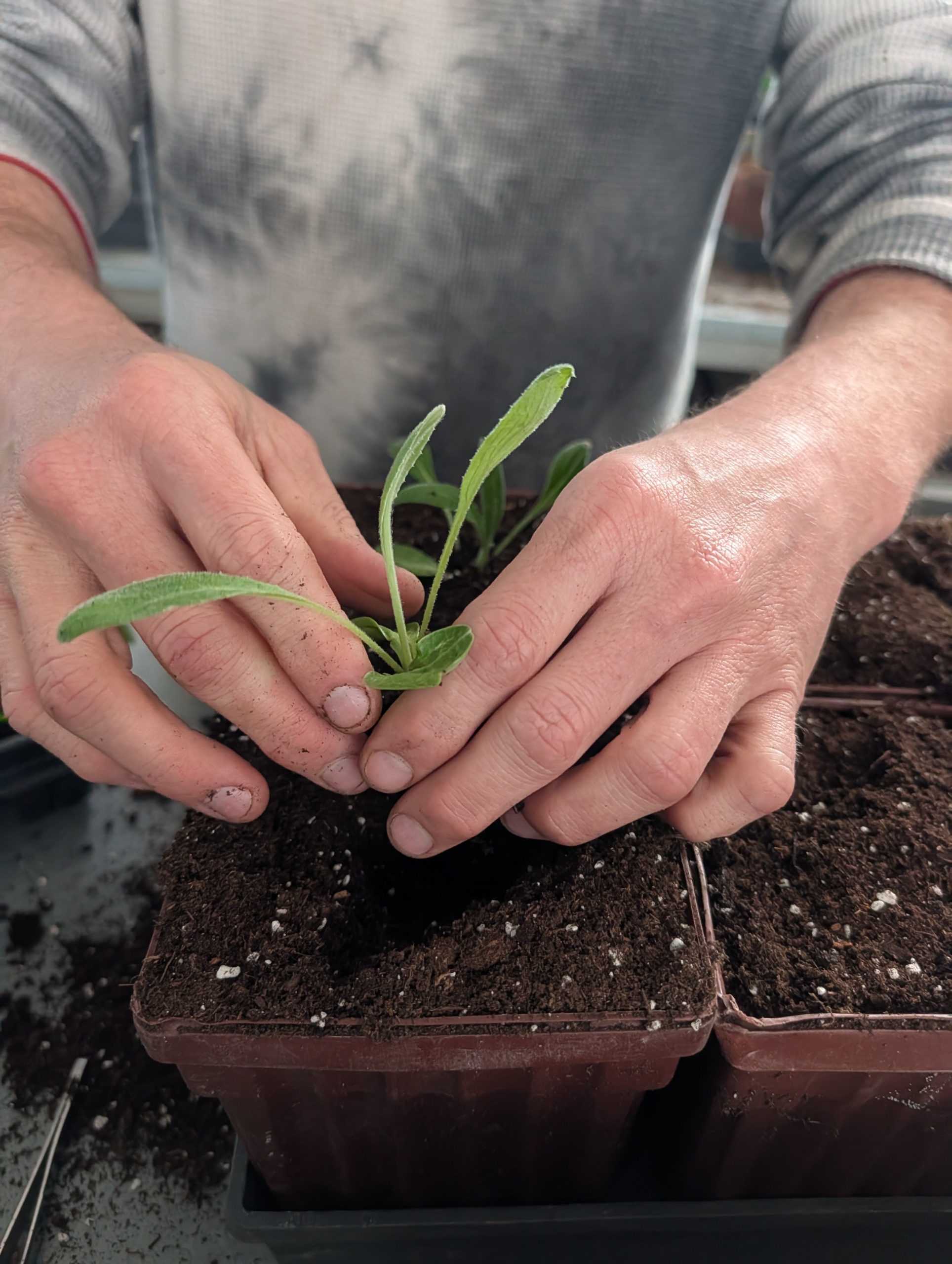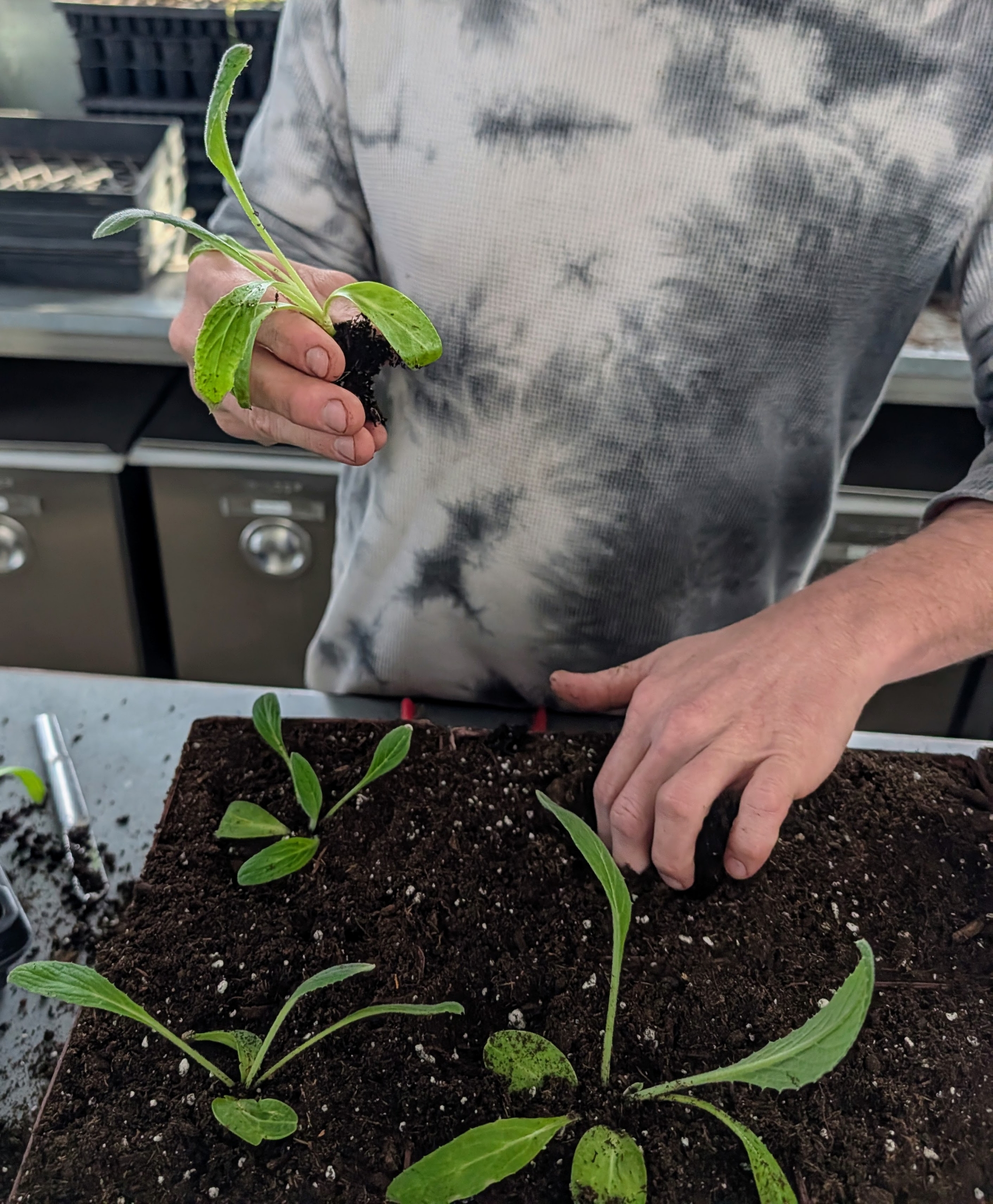 - Once the seedling is in its hole at the same depth it was in the seed tray, Ryan positions it so it is straight and secure.