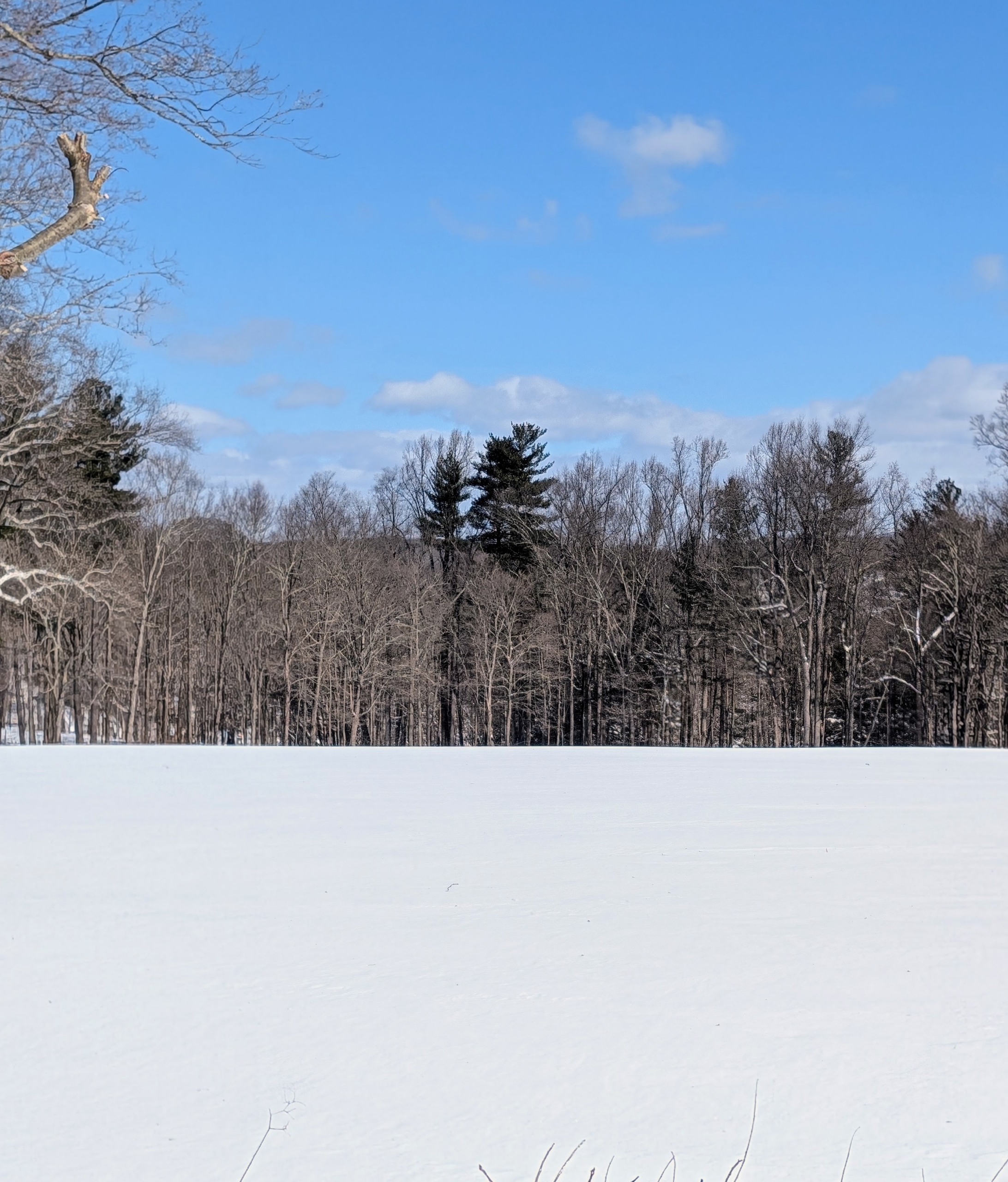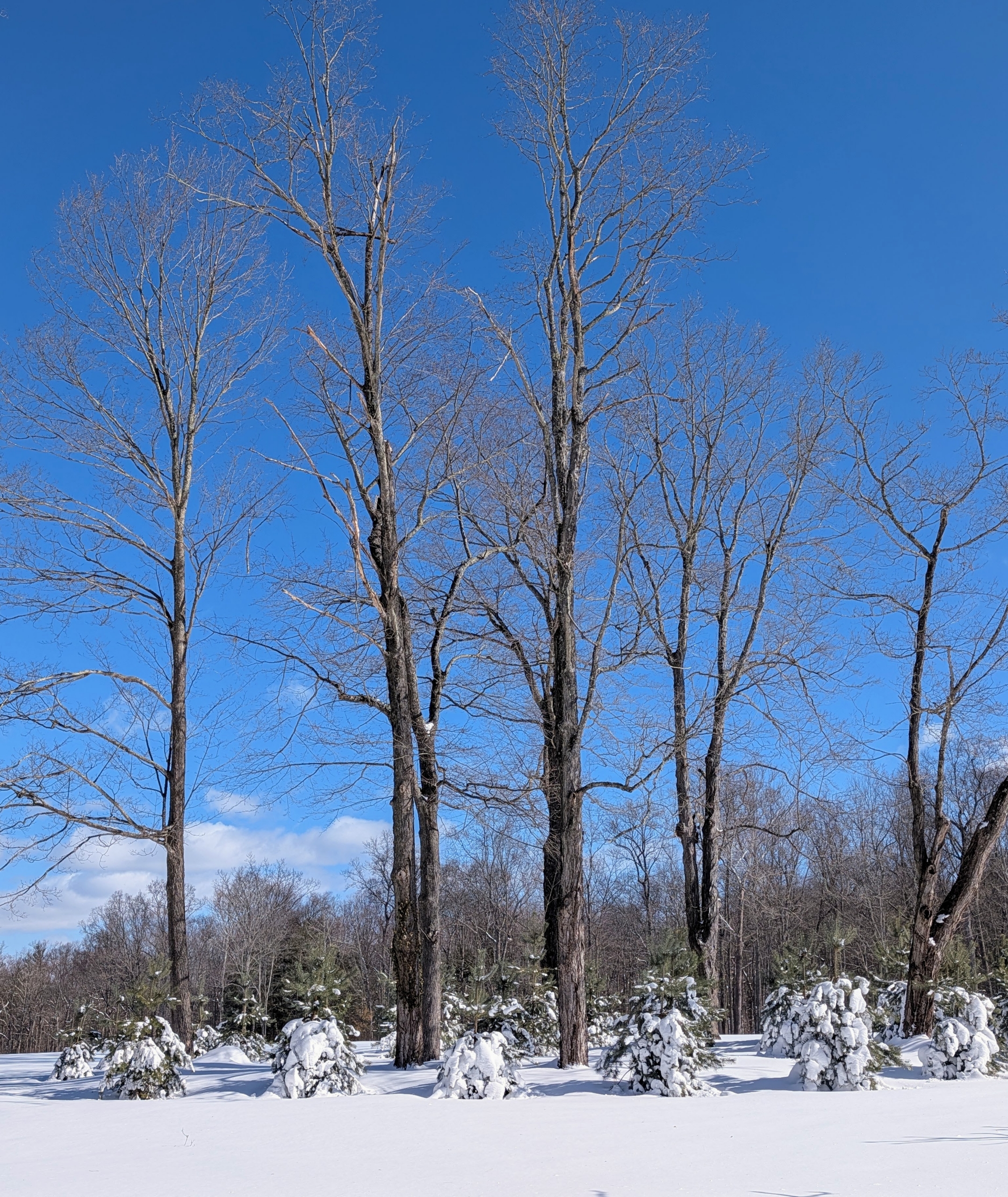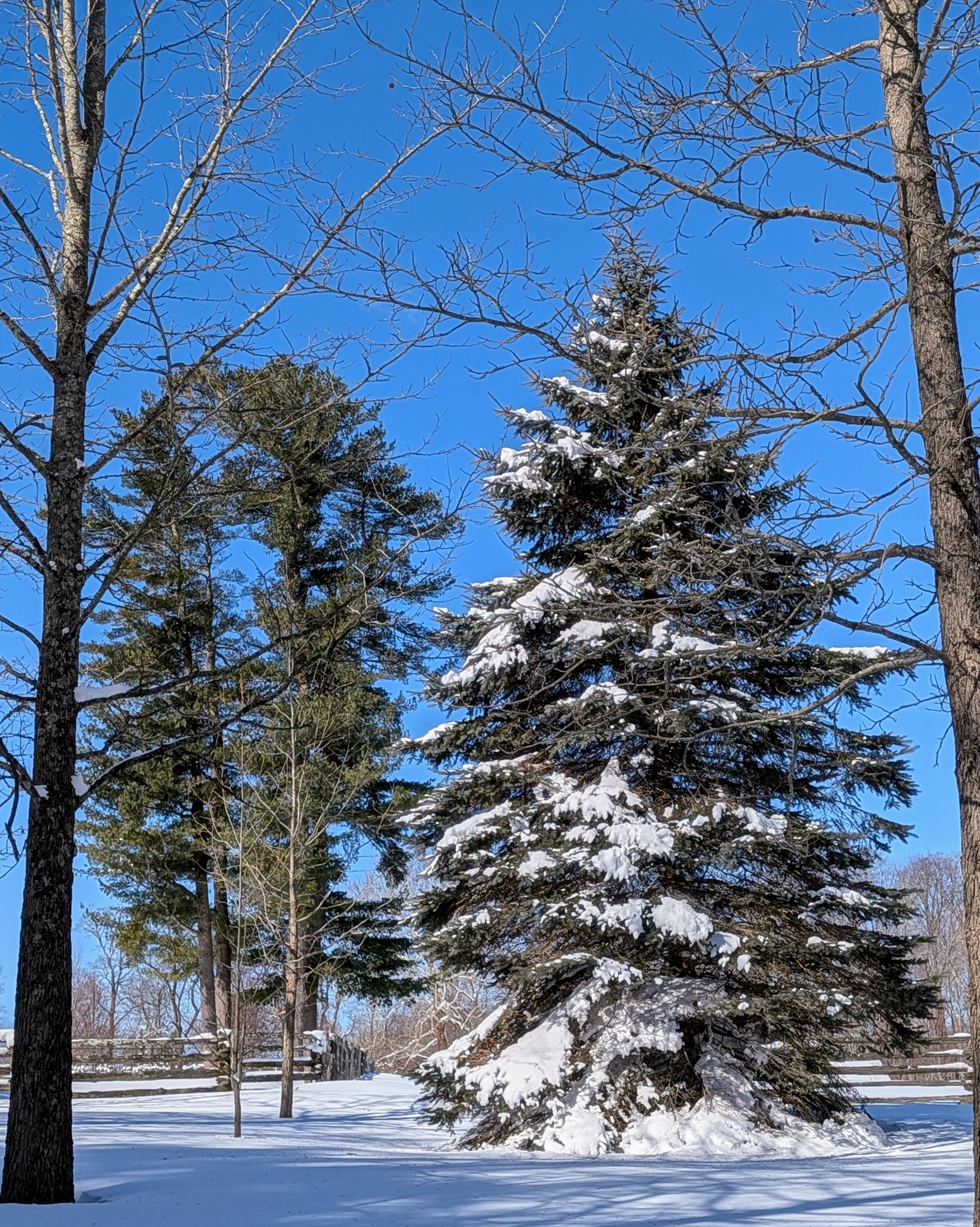 - While the bare deciduous trees stand tall in my middle field, young evergreens collect lots of snow on their branches below.