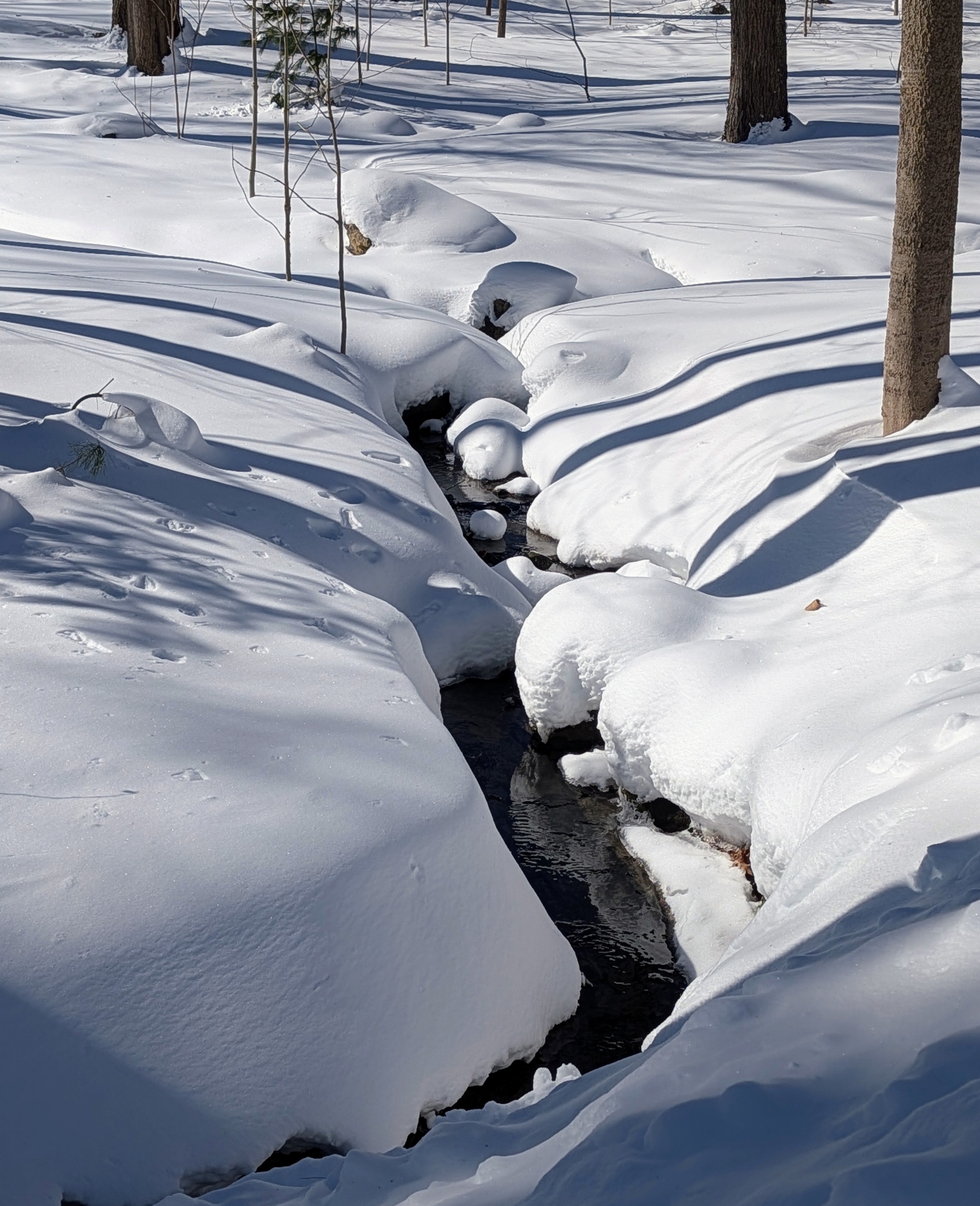 - Streams are full and look black against the white snow.