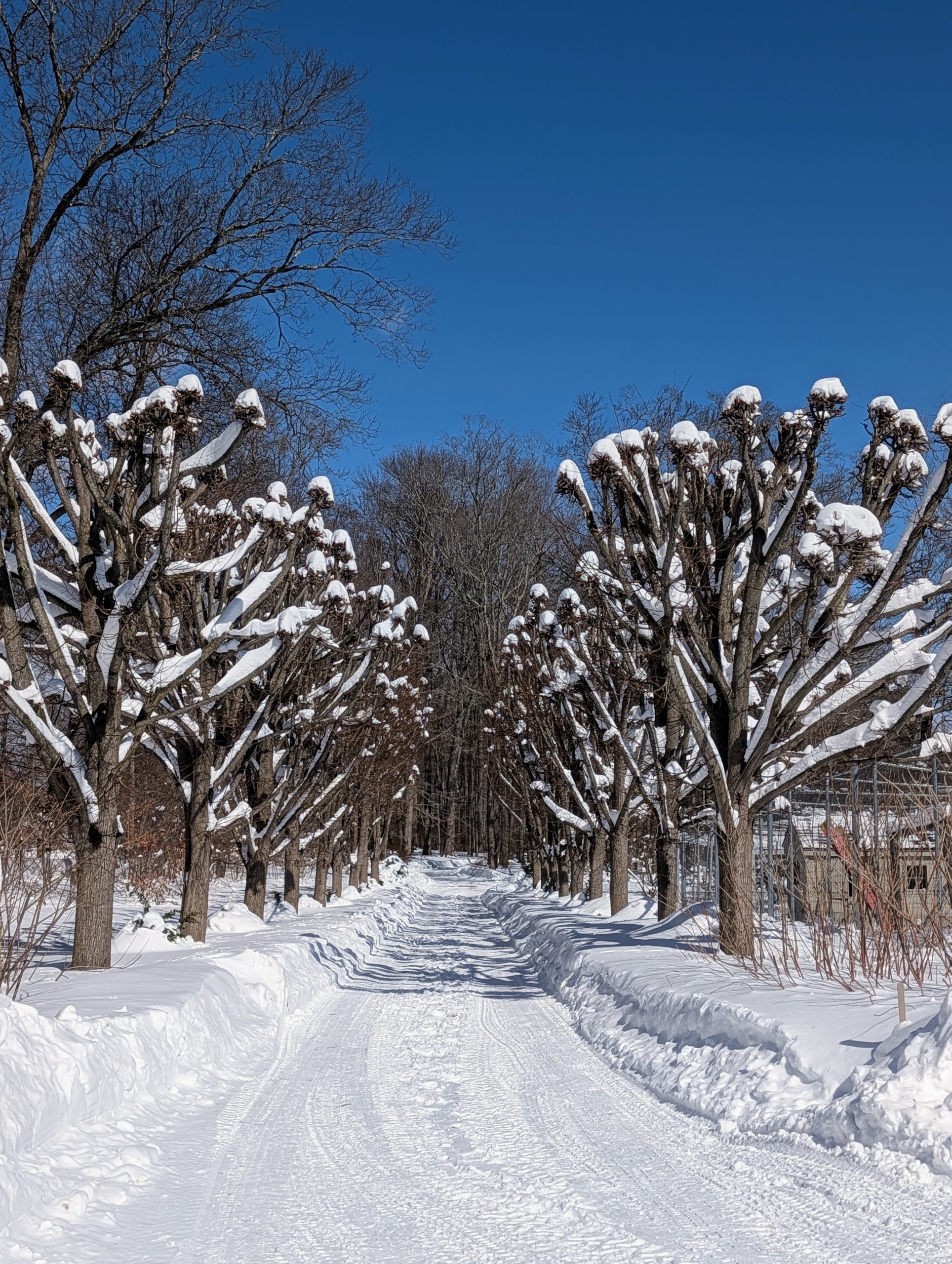 - The snow stuck to so many of the tree branches. These are my pollarded lindens outside the stable.