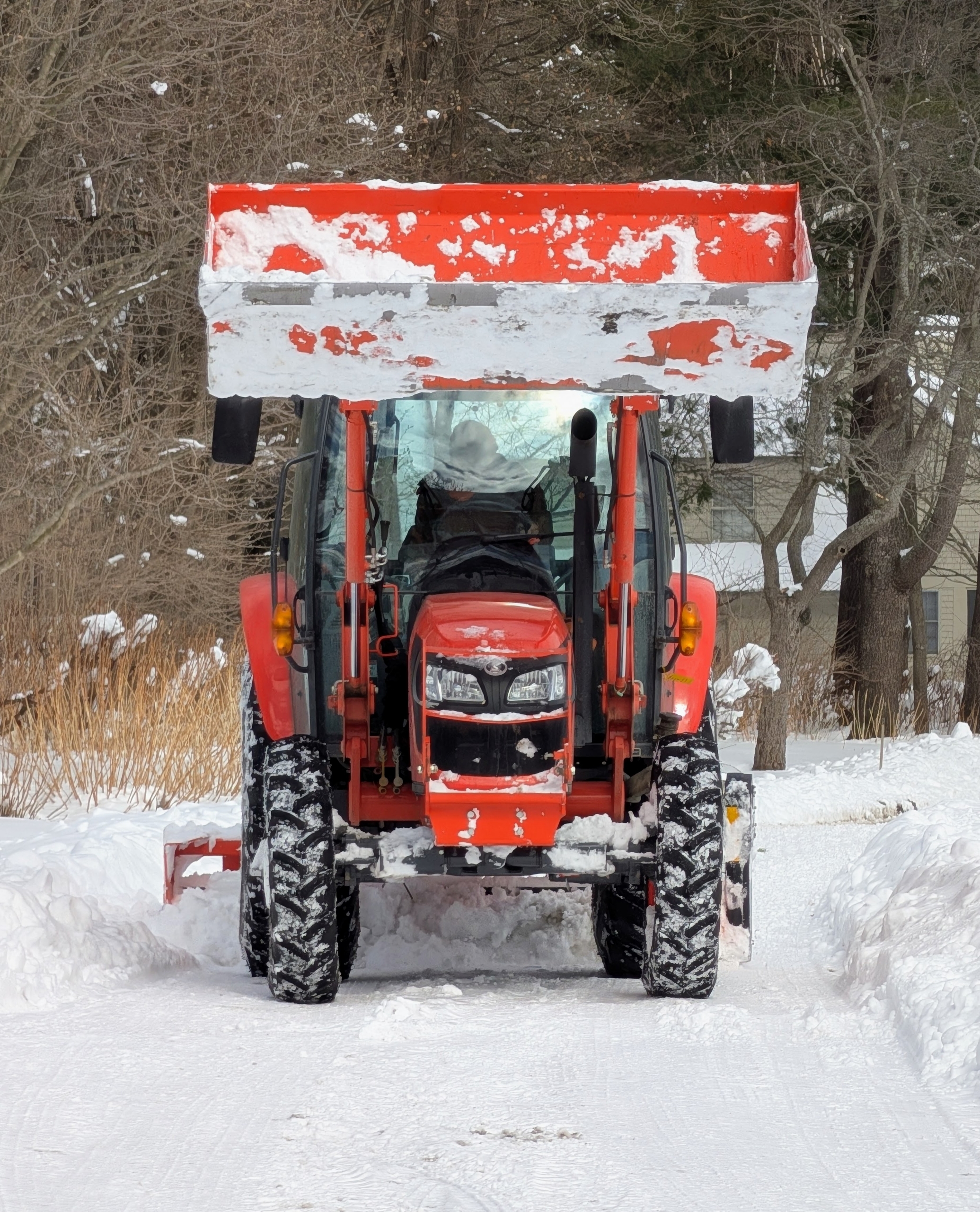- And here’s Pete in my trusted Kubota tractor. A Land Pride PR1690 Power Rake is attached to the back and used to rake the snow on the carriage roads and break up any ice. It’s snowing again this morning with more in the forecast. Be careful.
