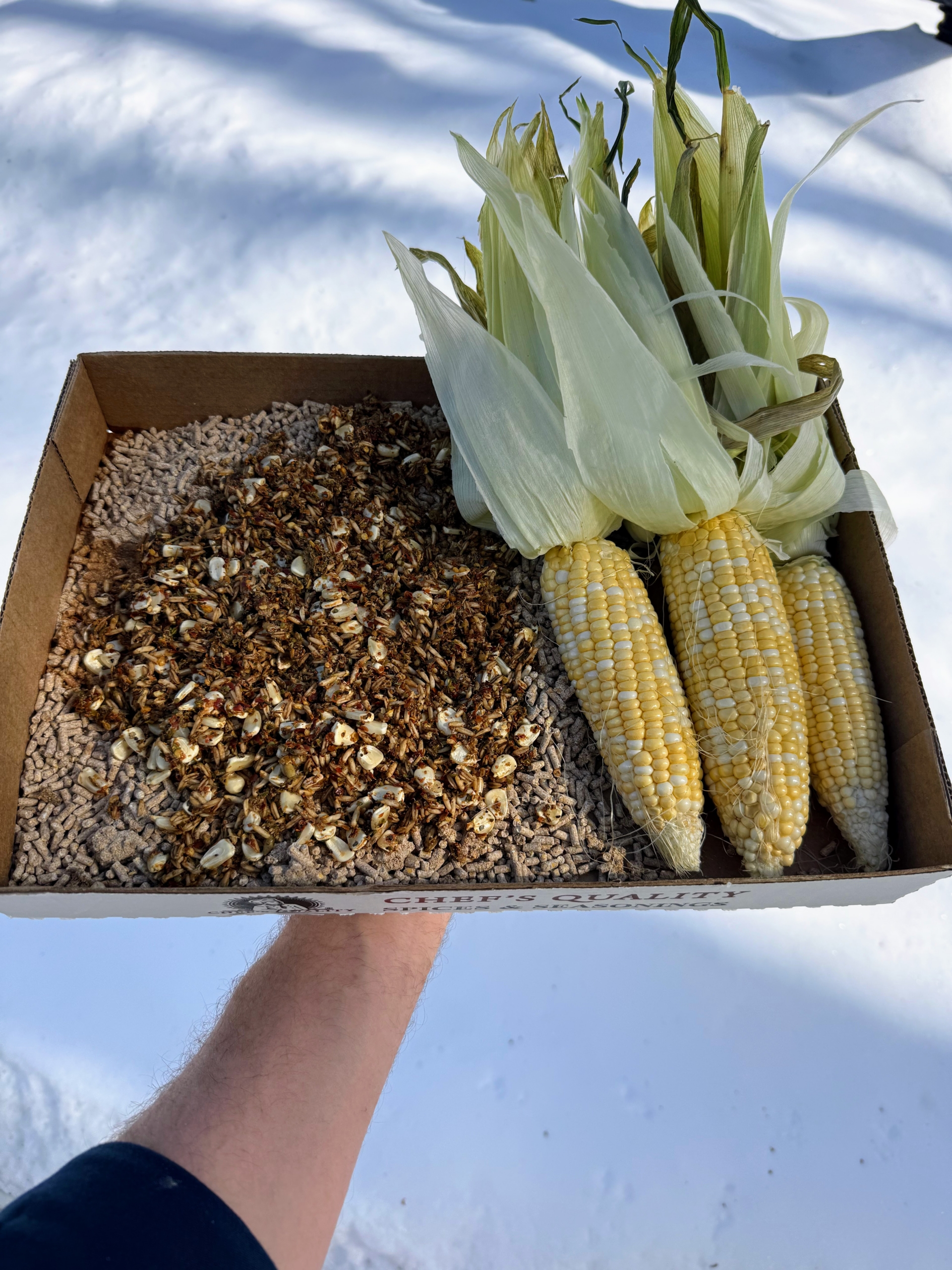 - Gregory gets his corn from a restaurant depot. Corn provides energy through its high carbohydrate content. When chickens consume it, they need to work harder to digest it. In turn, this increases their activity and generates added internal heat.