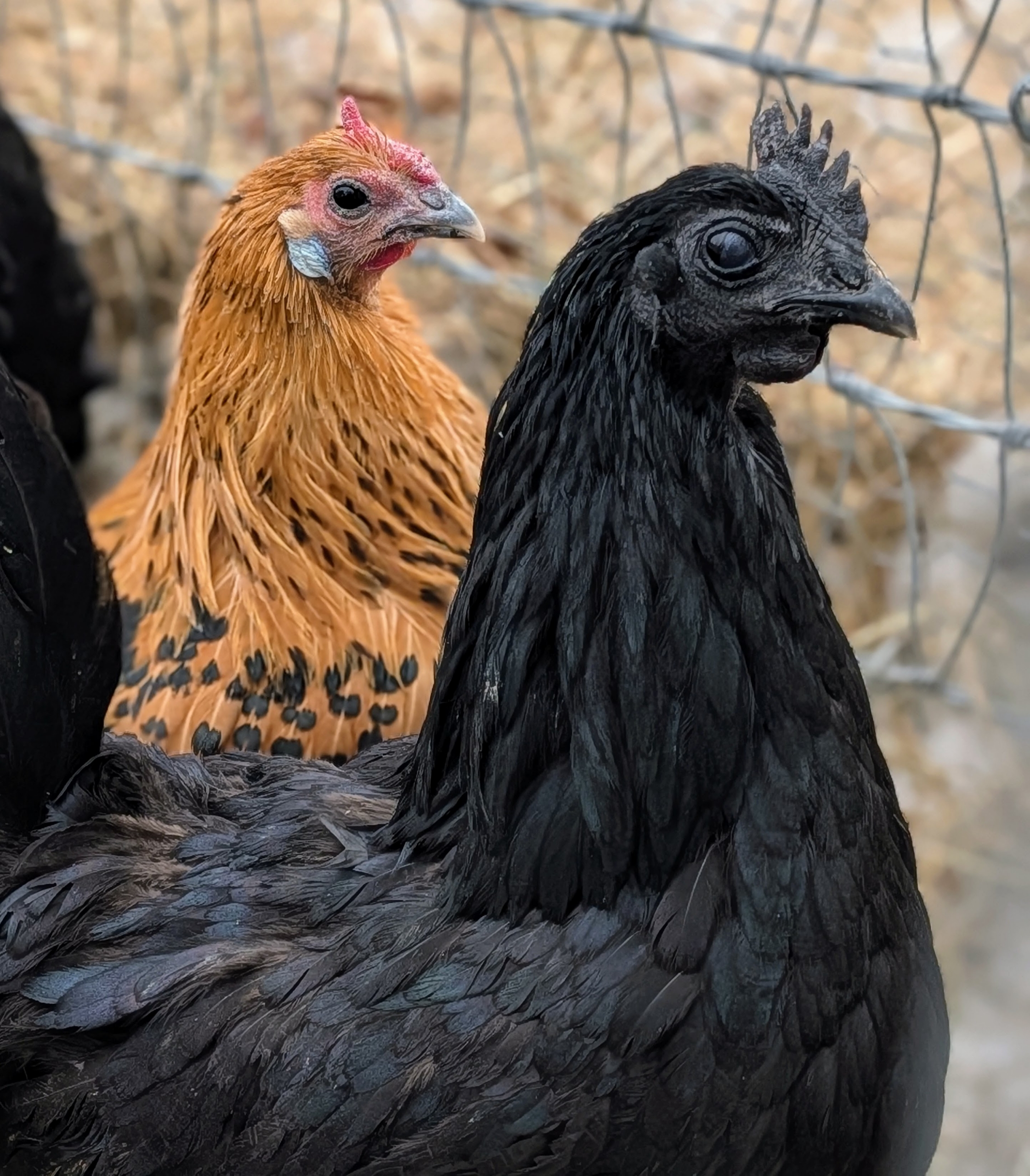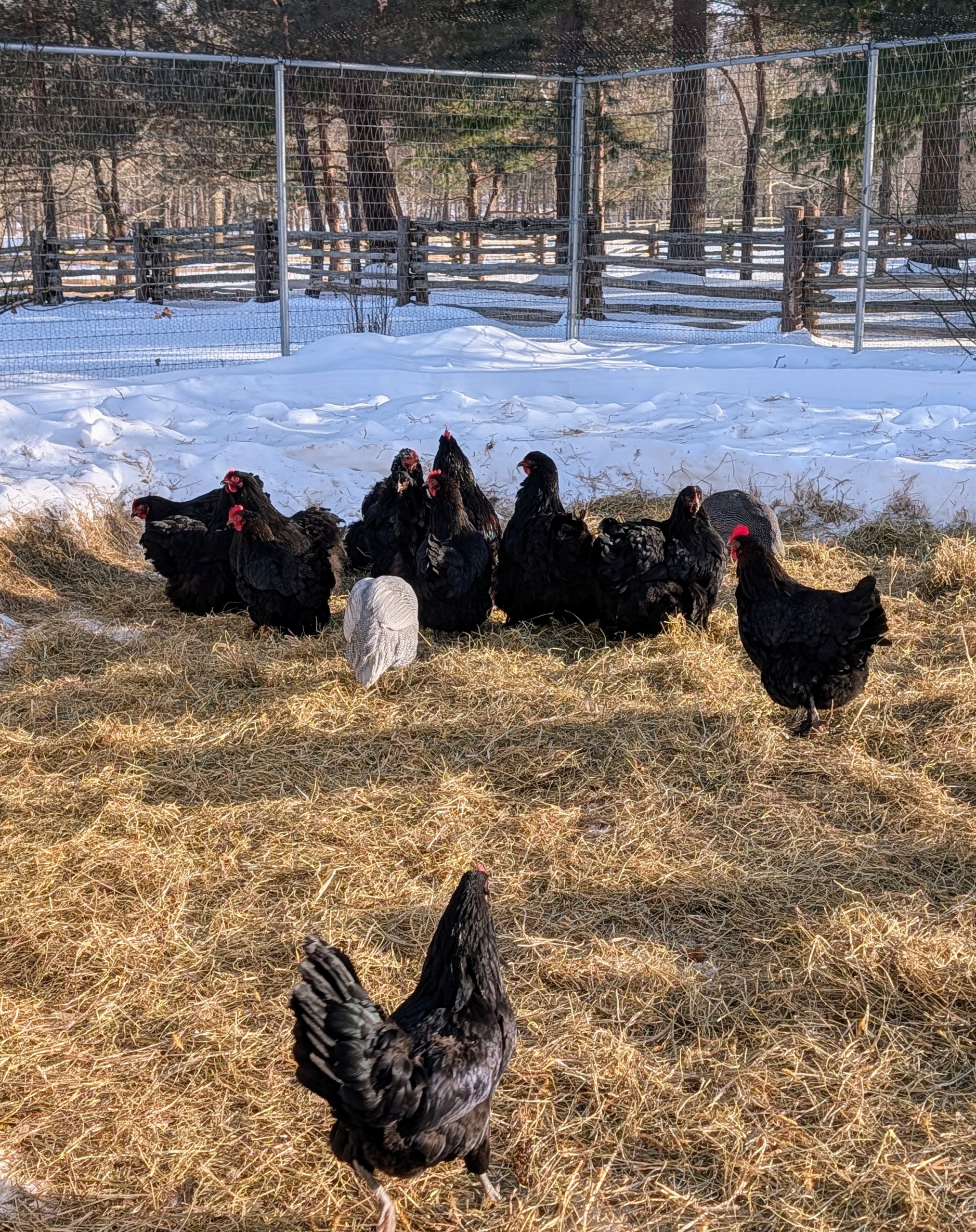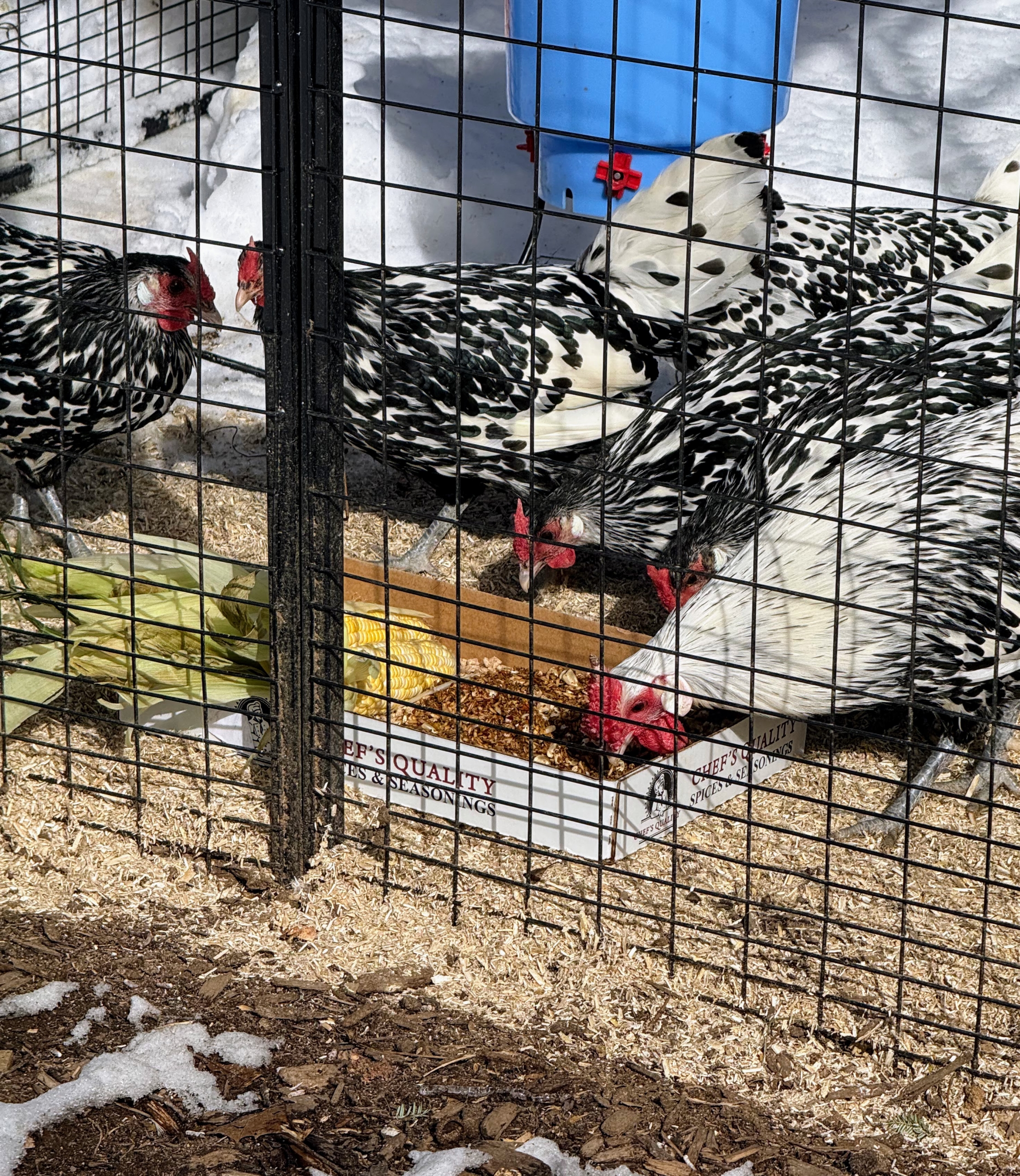 - But they are also free to roam in their enclosures during the day. I line areas with hay to cover snow and ice.