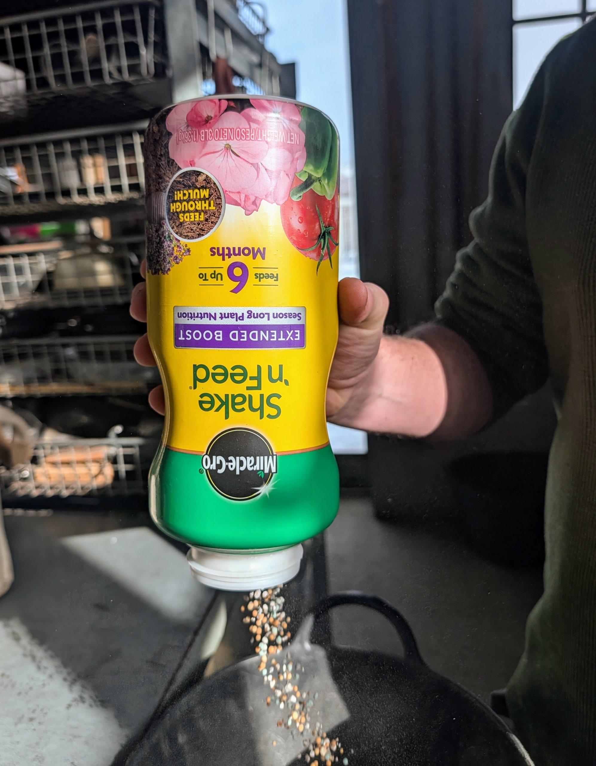- And don’t forget to feed. Ryan sprinkles a generous amount of Miracle-Gro Shake ‘n Feed Extended Boost, which feeds up to six months.
