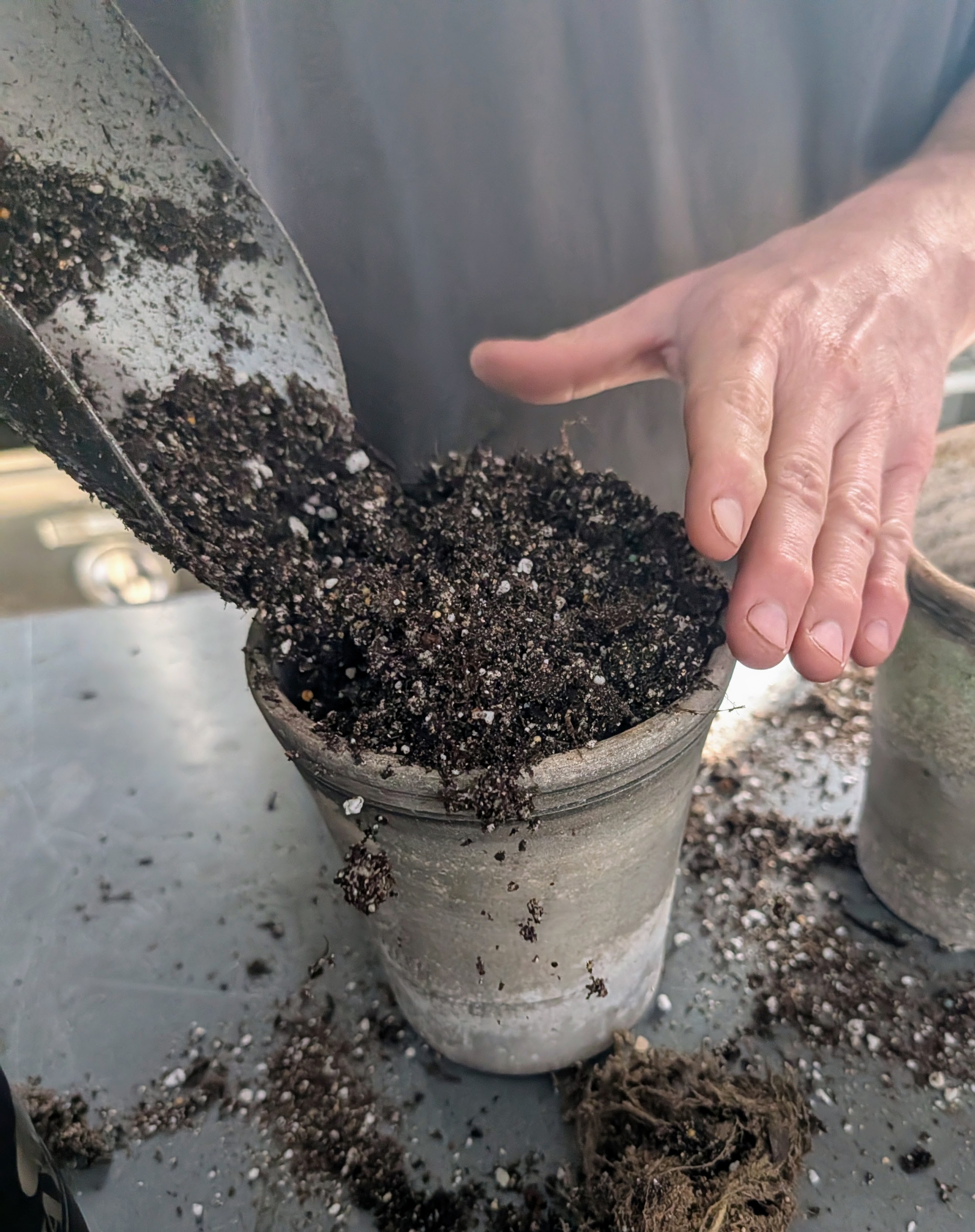 - Ryan moves several large scoops of potting mix into a bucket.