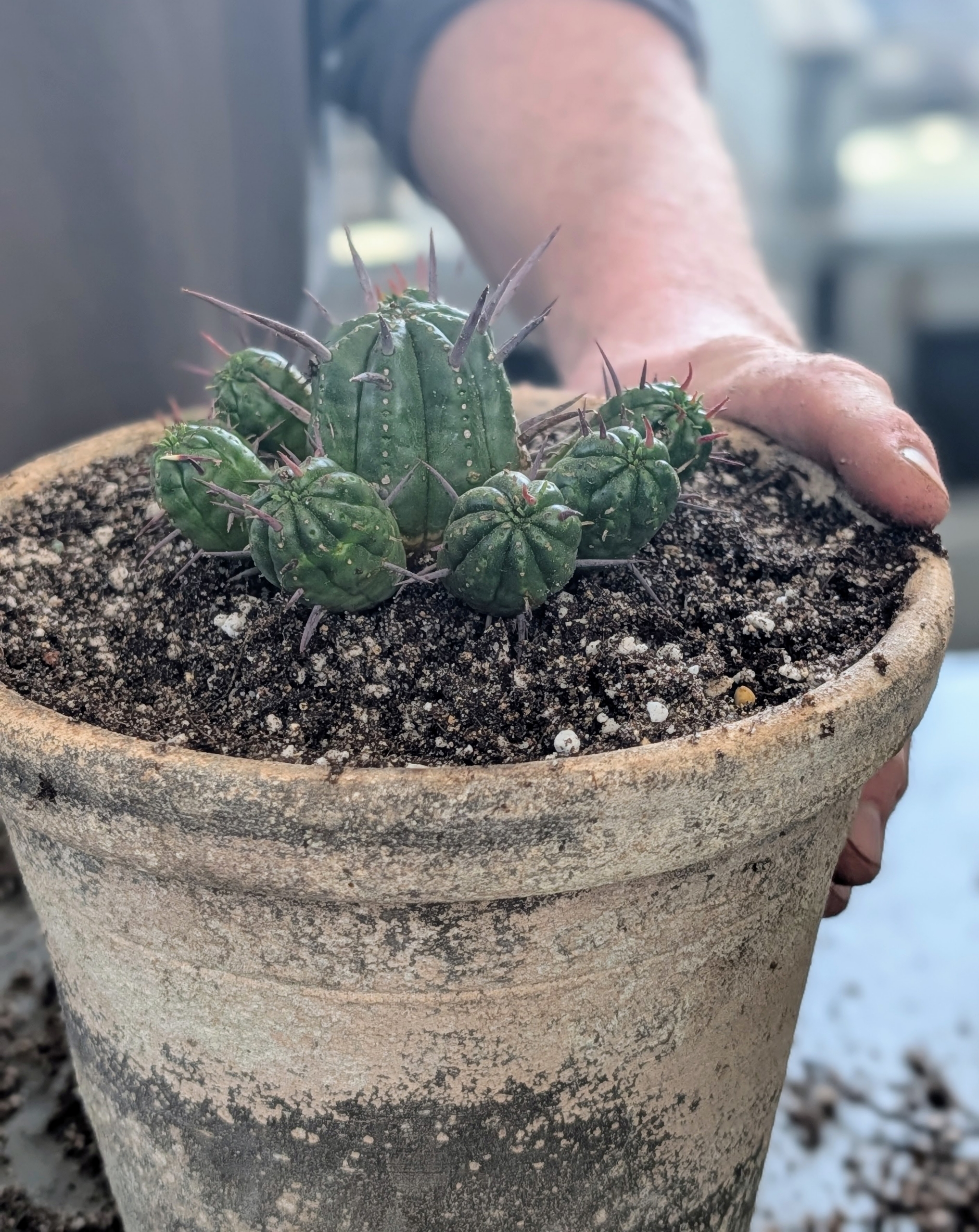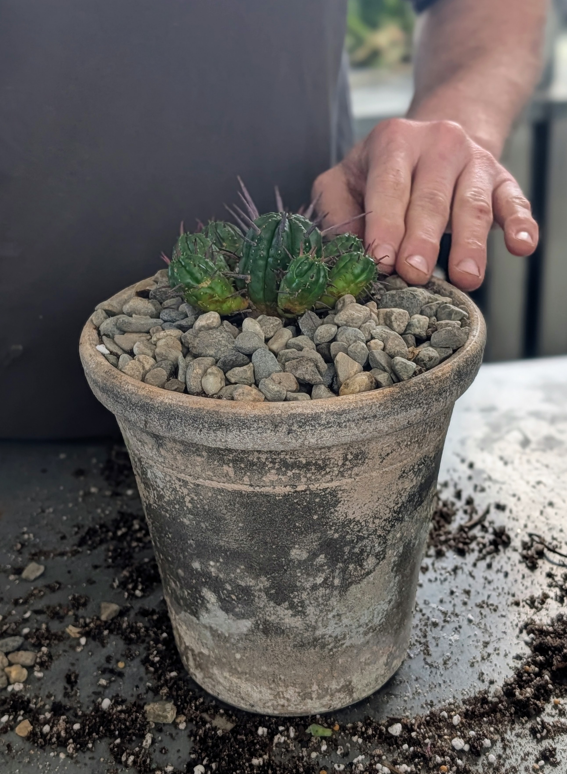 - Ryan chooses the appropriate size container for each specimen. I’ve been using Guy Wolff pots for many years – he makes every one of these by hand.