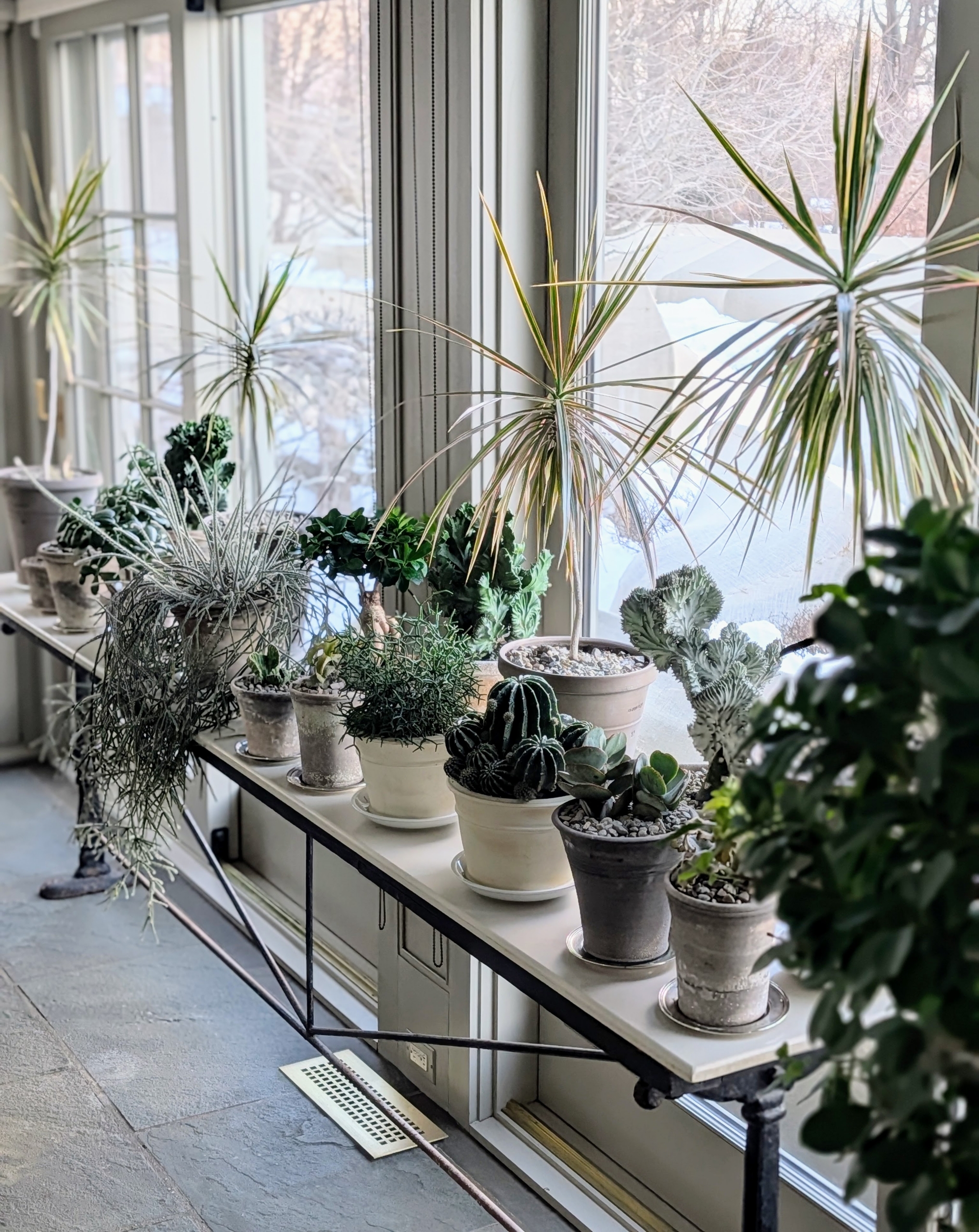 - And here they are now – joined with some other well-nurtured specimens. My porch is a lovely space for displaying potted plants. The floor to ceiling windows allow lots of light. Most succulents need at least half a day to a full day of sunlight. They’ll do beautifully in this space and will be a joy to watch grow and thrive.