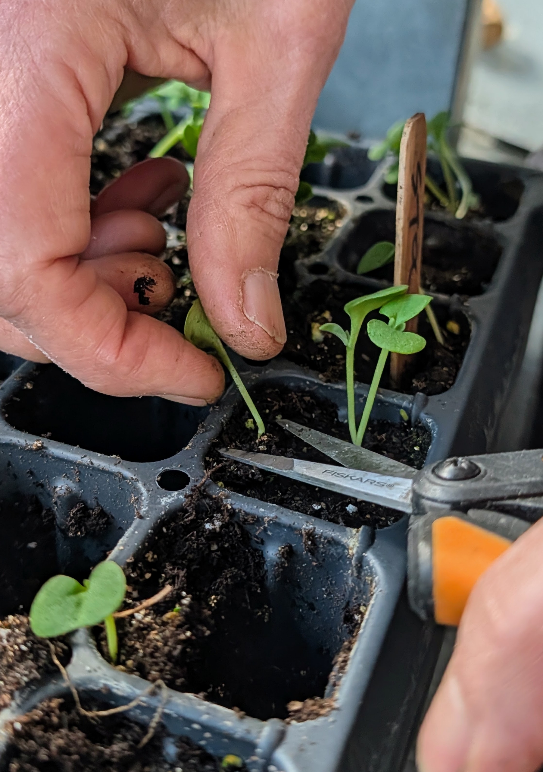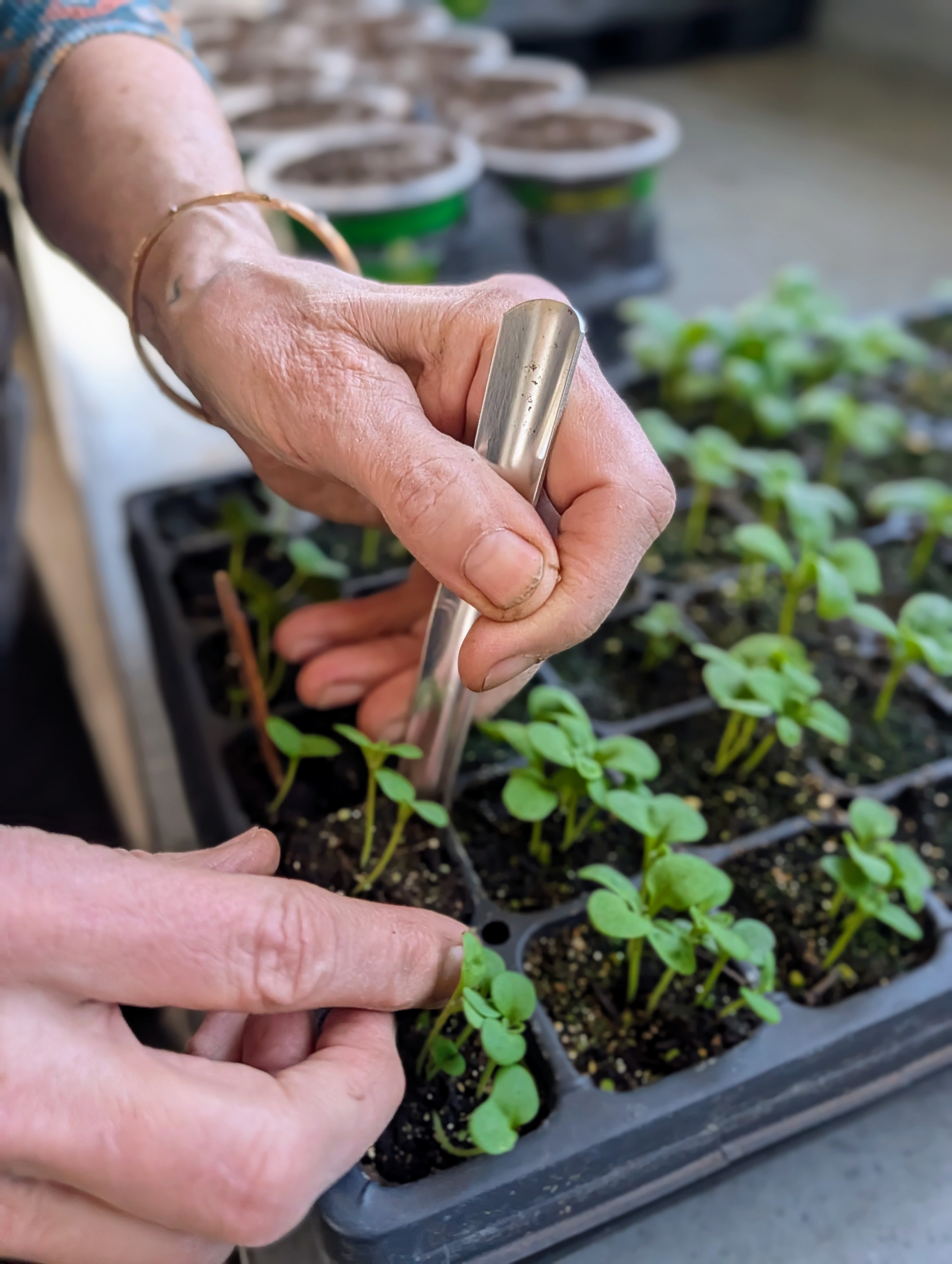 - When the seedlings are a couple inches tall and have reached their “true leaf” stage, which is when each seedling has sprouted a second set of leaves, it’s time for a process called selective thinning. Selective thinning prevents overcrowding, so seedlings don’t have competition for soil nutrients or room to grow. Wendy carefully loosens the soil around the seedling with the widger so it can be lifted.