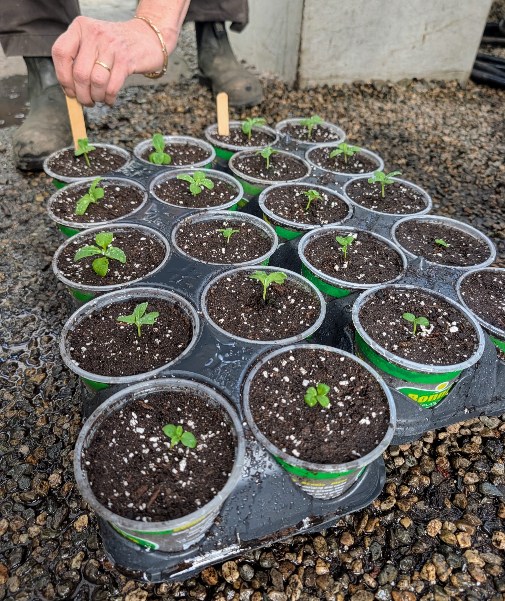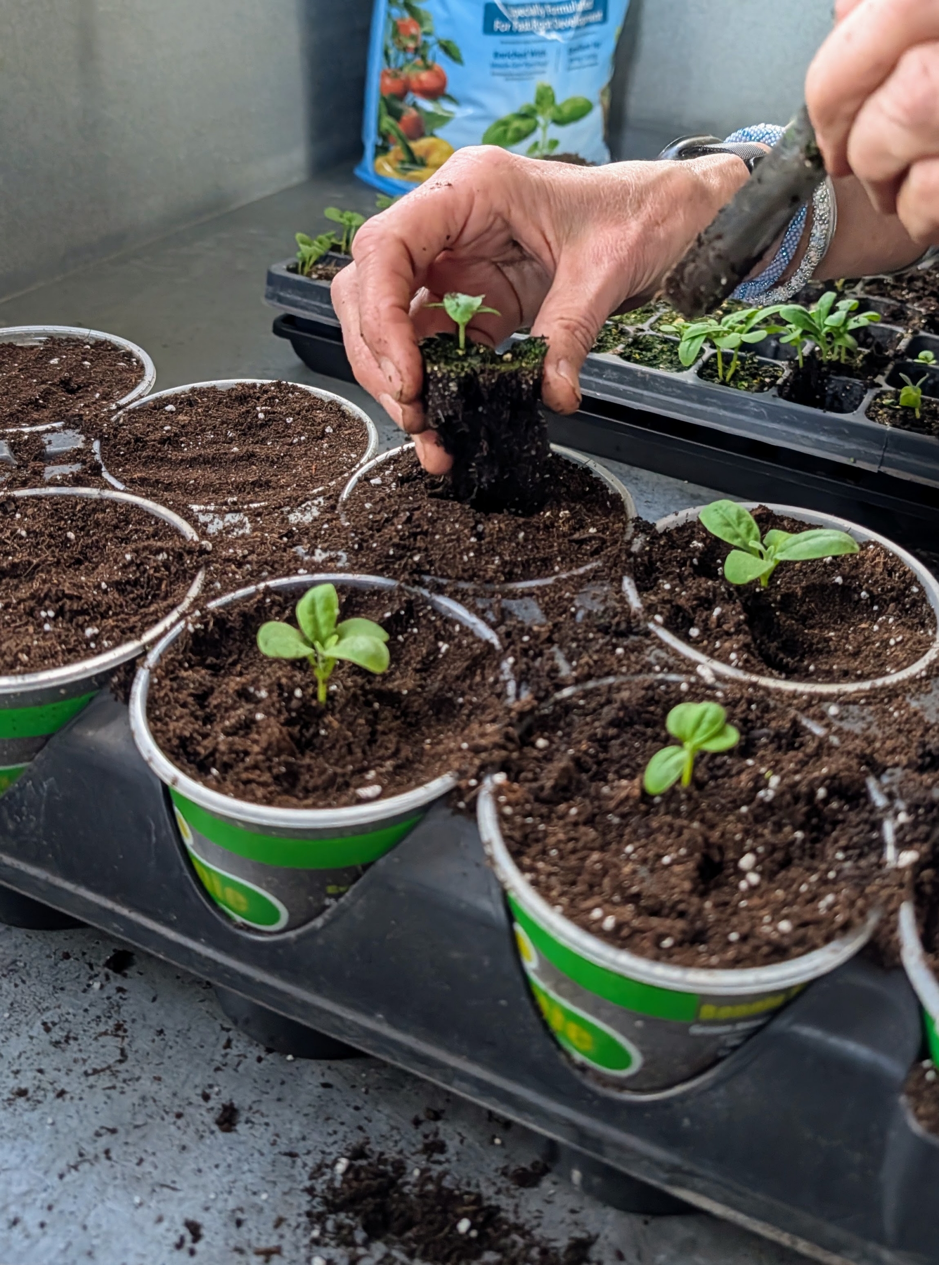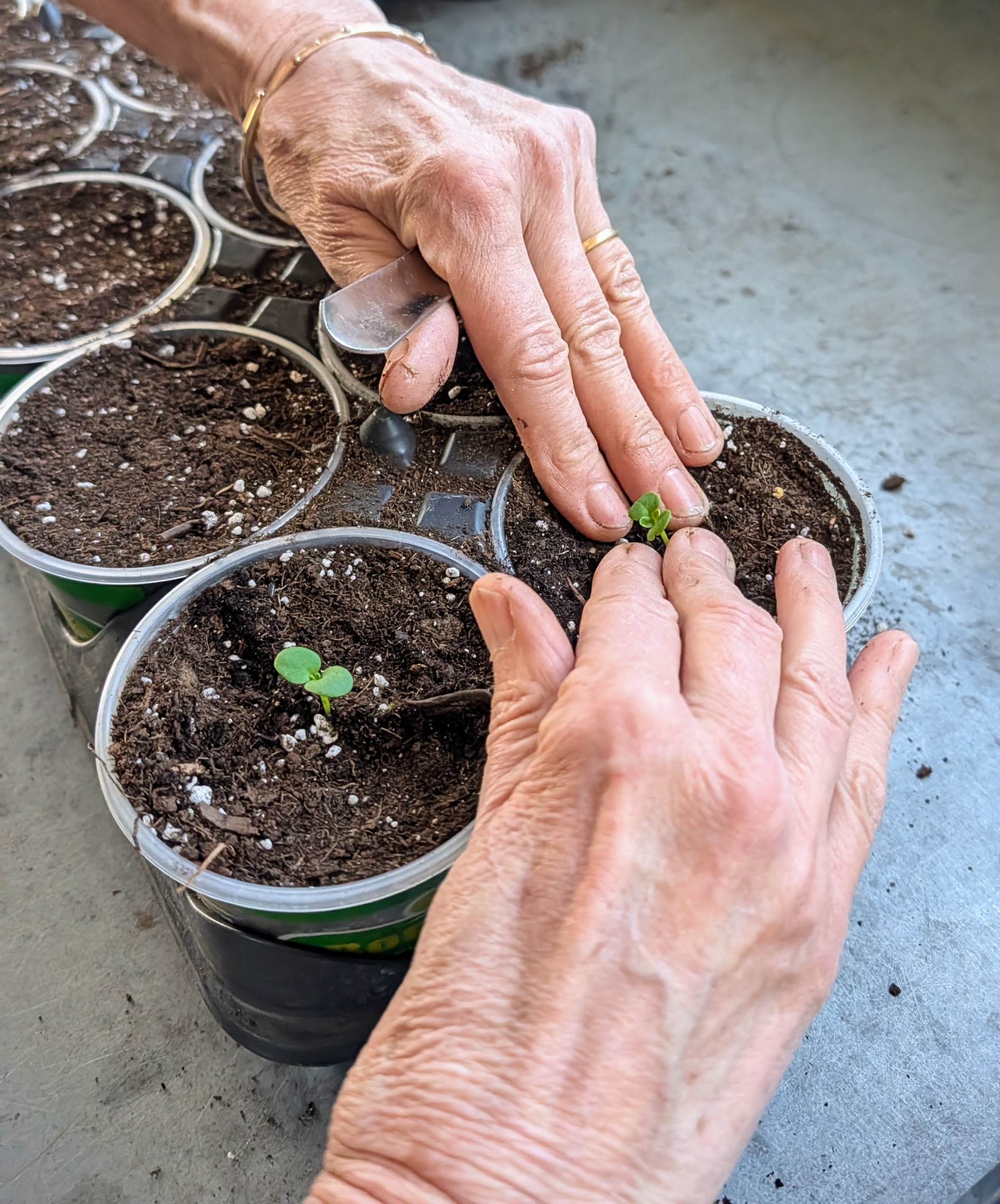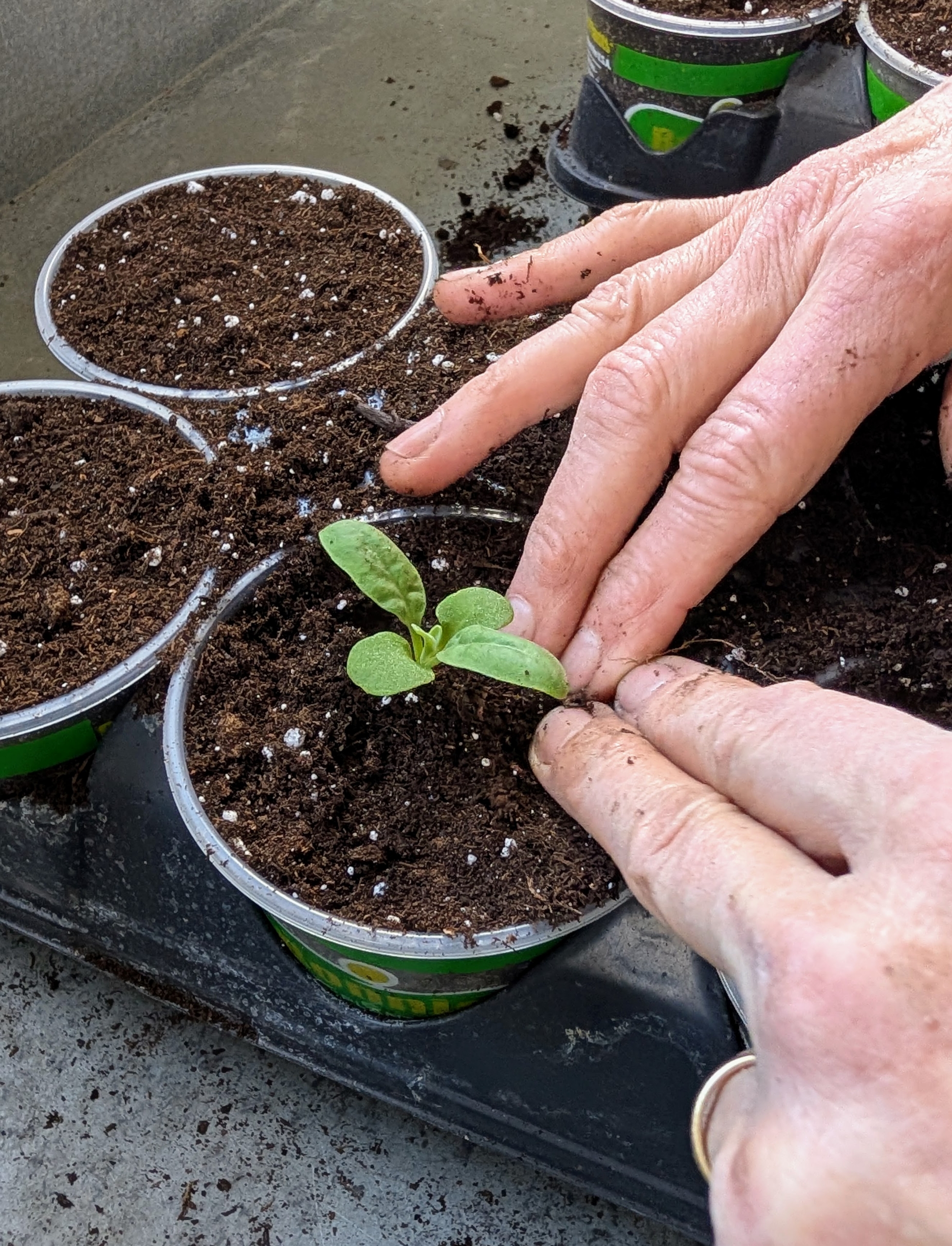 - The seedling is planted as deep as it was in its previous tray cell. Wendy gently firms up the surrounding soil, so the seedling is supported and standing straight in the center of the pot.