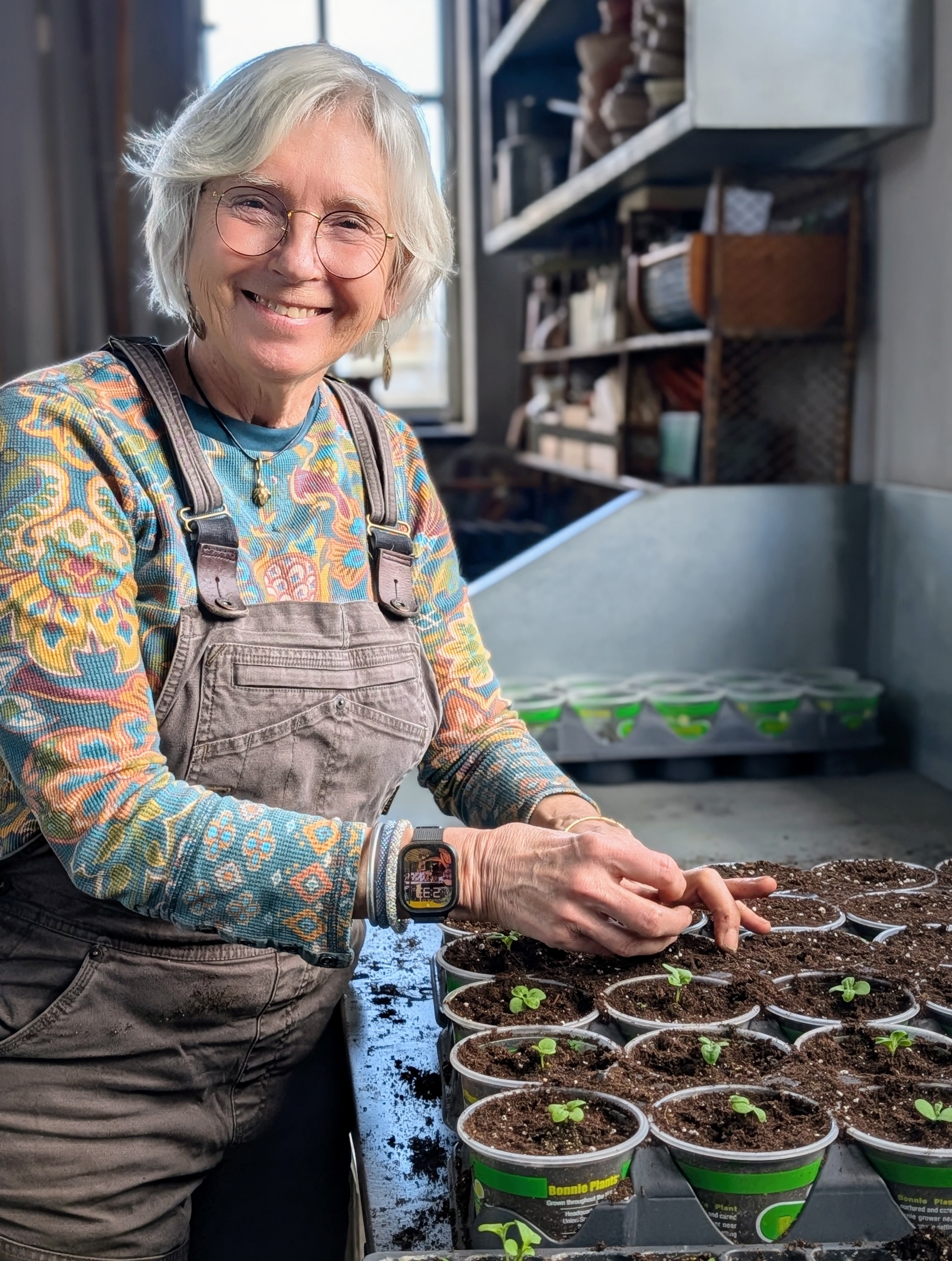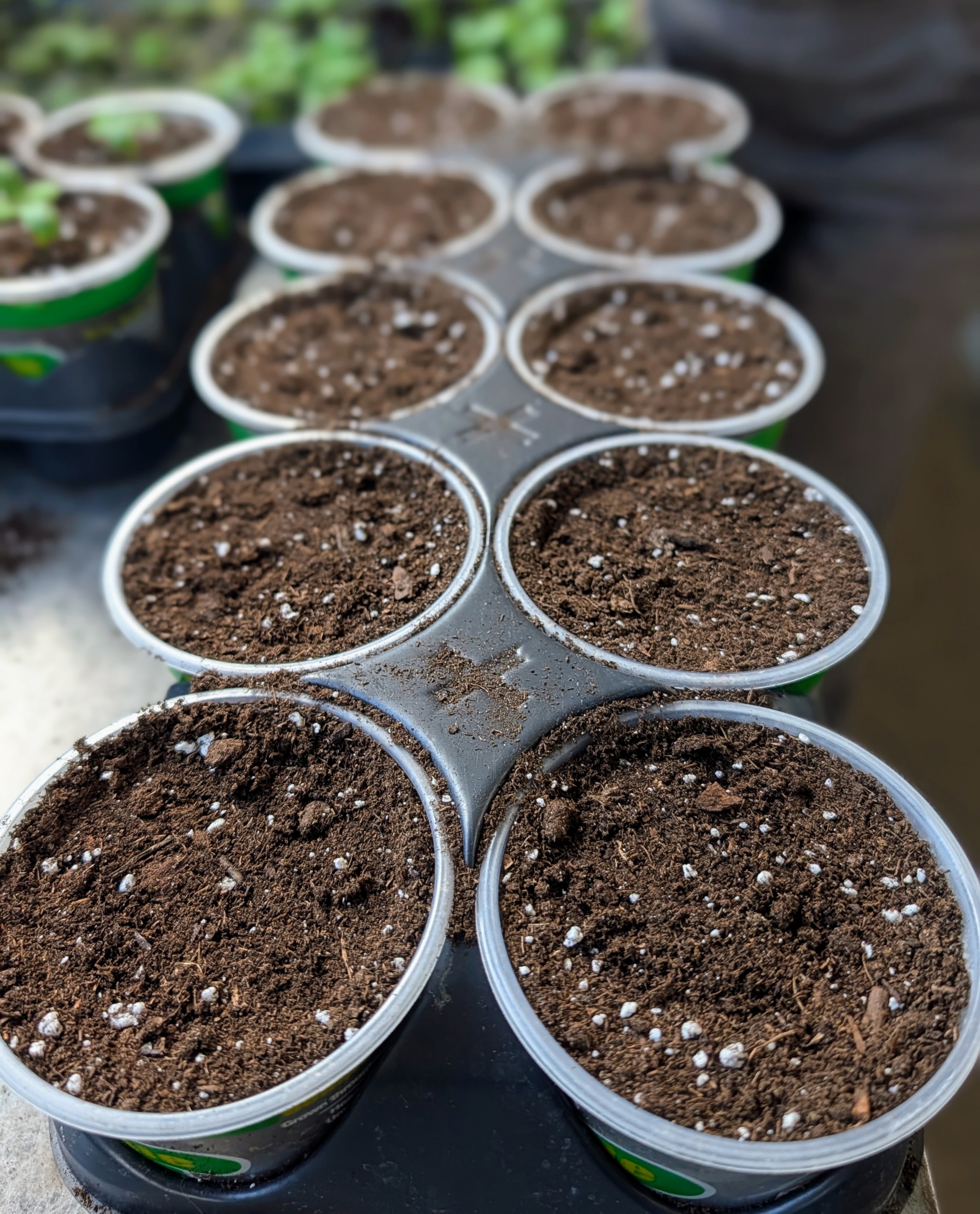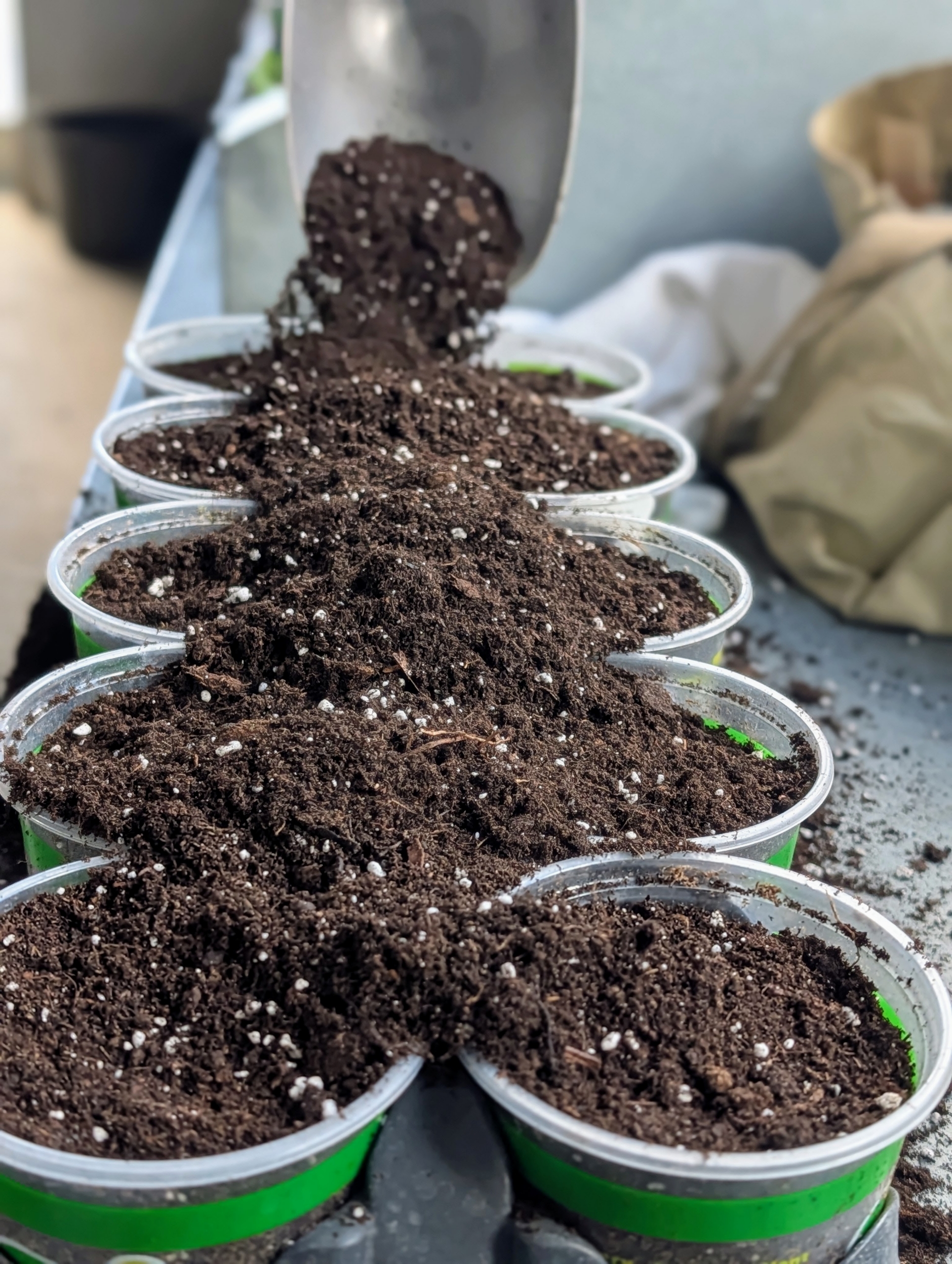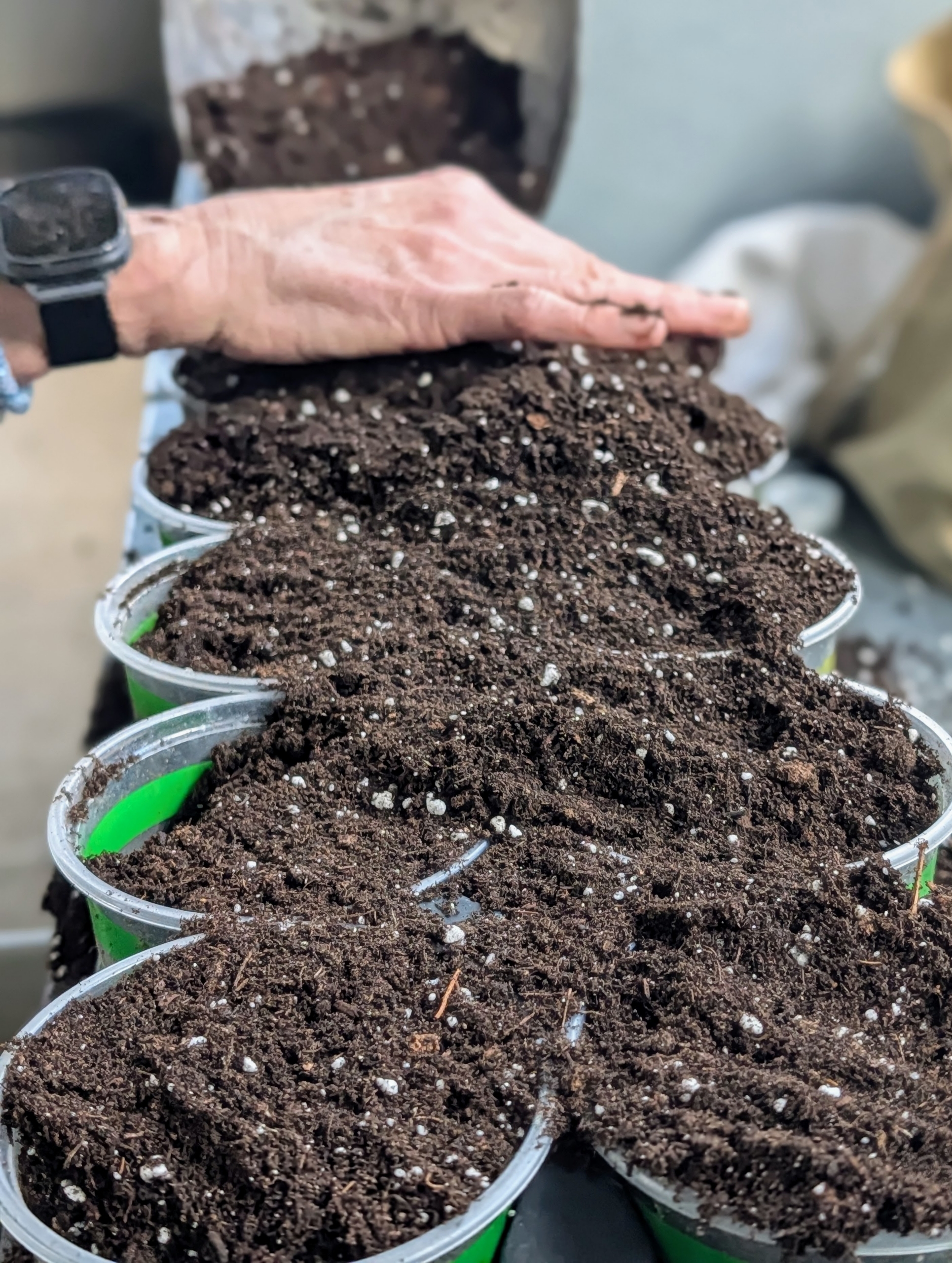- Wendy fills the pots with mix and then levels off the soil to the rim.