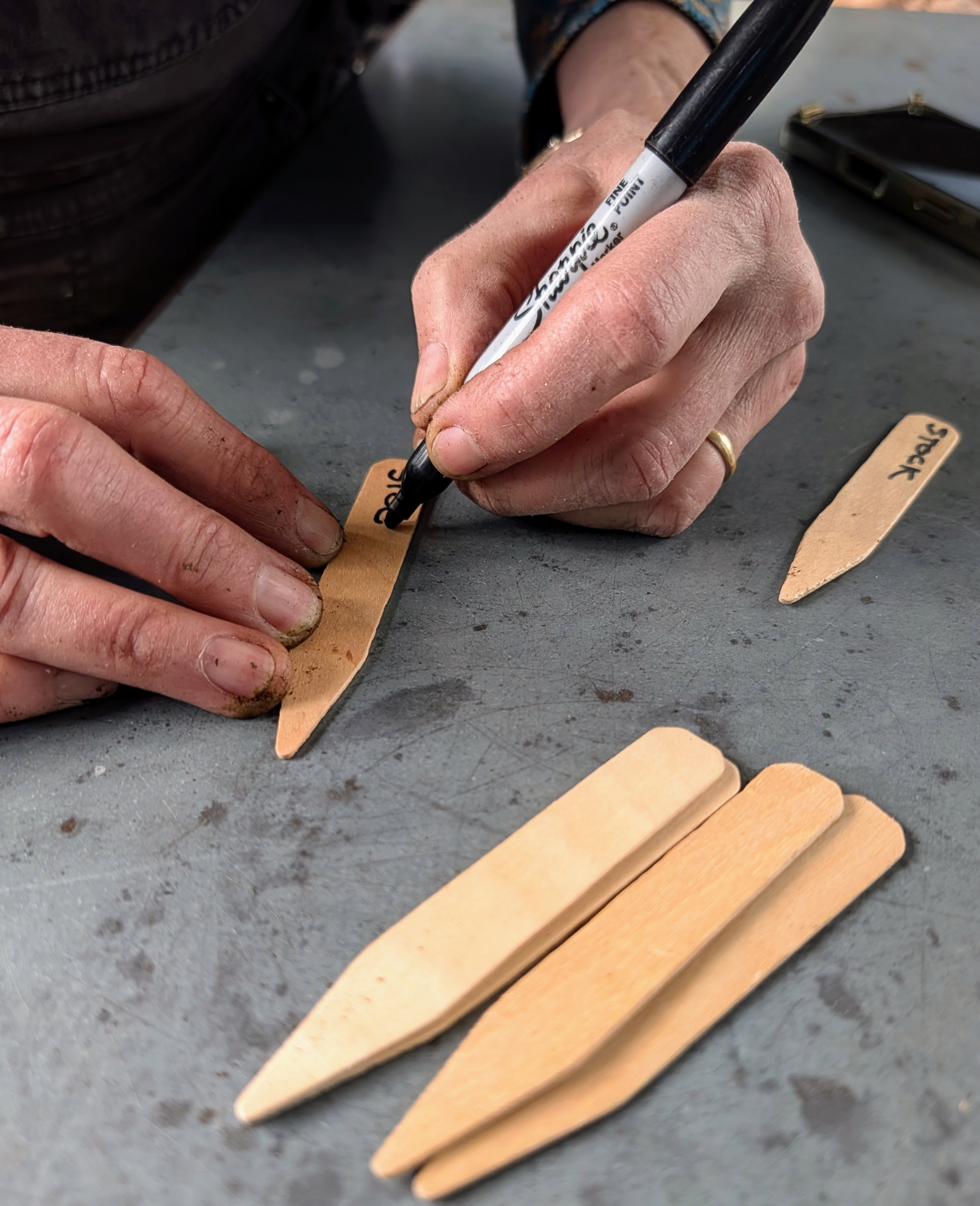 - Wendy places the markers identifying the seedlings in the containers – seedlings must be labeled throughout the growing process until they are planted outdoors. This allows us to know what they are, how various varieties grow, and which ones we should plant again next season.