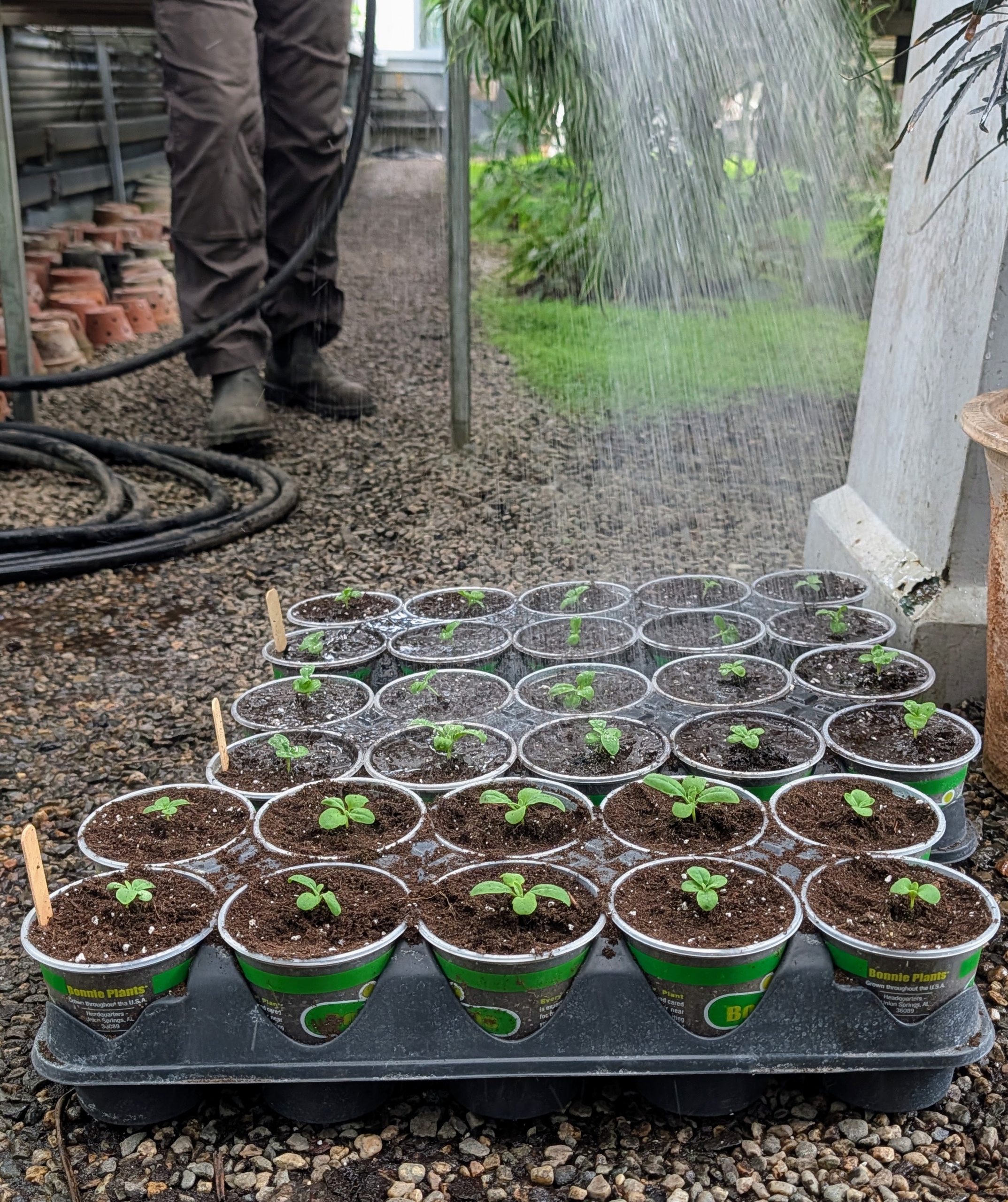 While here, Wendy is helping to groom all the indoor plants in my main greenhouse. She is also tending all the young seedlings that were started over the last few weeks. She is going through each tray, thinning out those that are weak, pricking out those that are growing too big, and then transplanting them into larger pots.