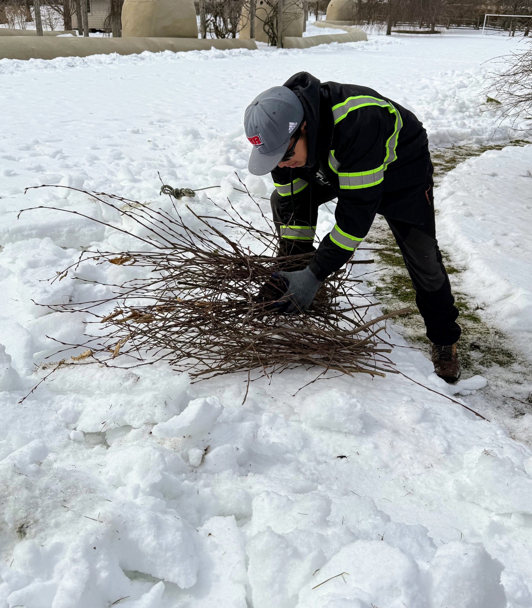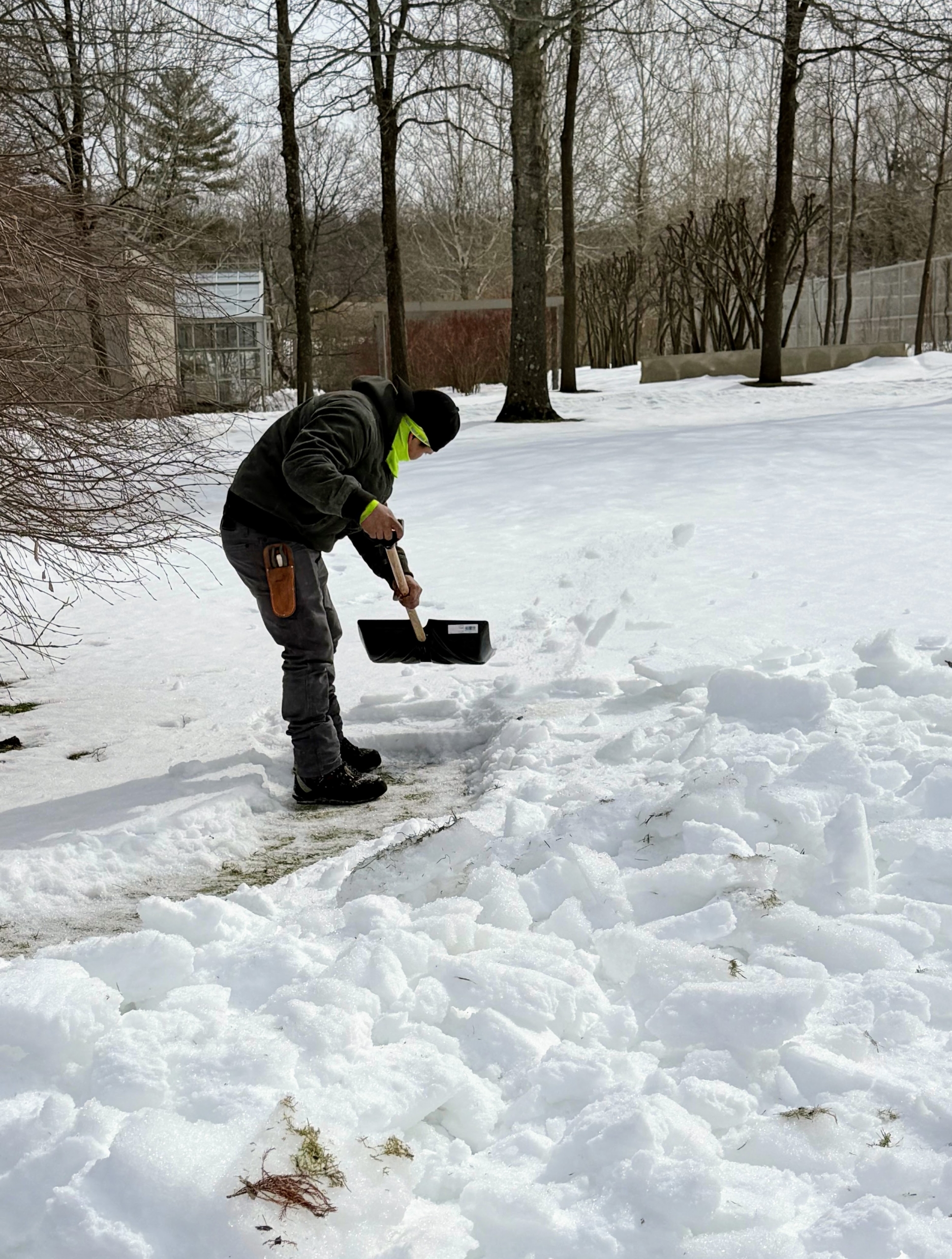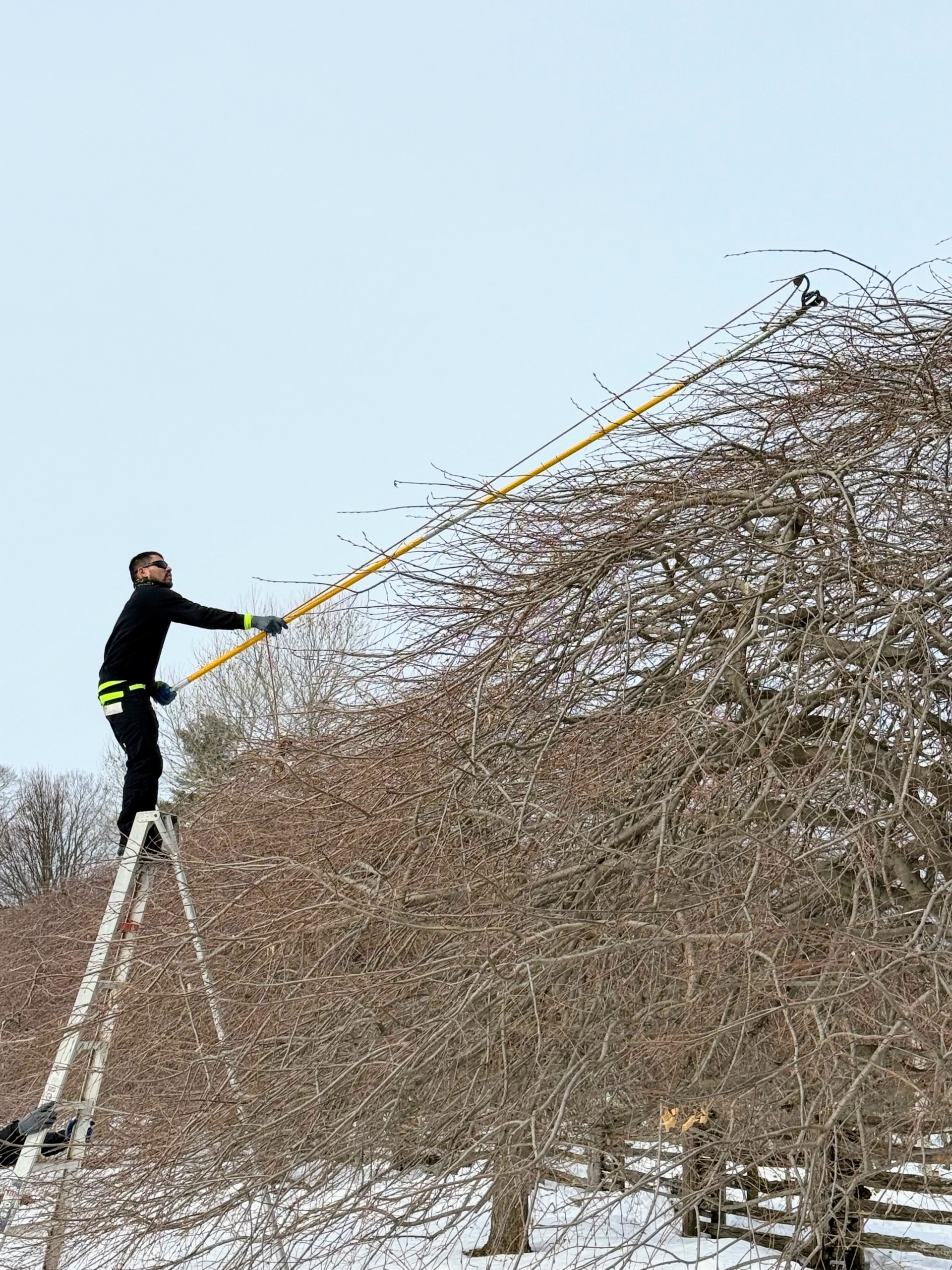 - With all the snow on the ground, it is also necessary to shovel a path, so the crew can work on each tree and safely set up their ladders. We’ve had a very snowy season.