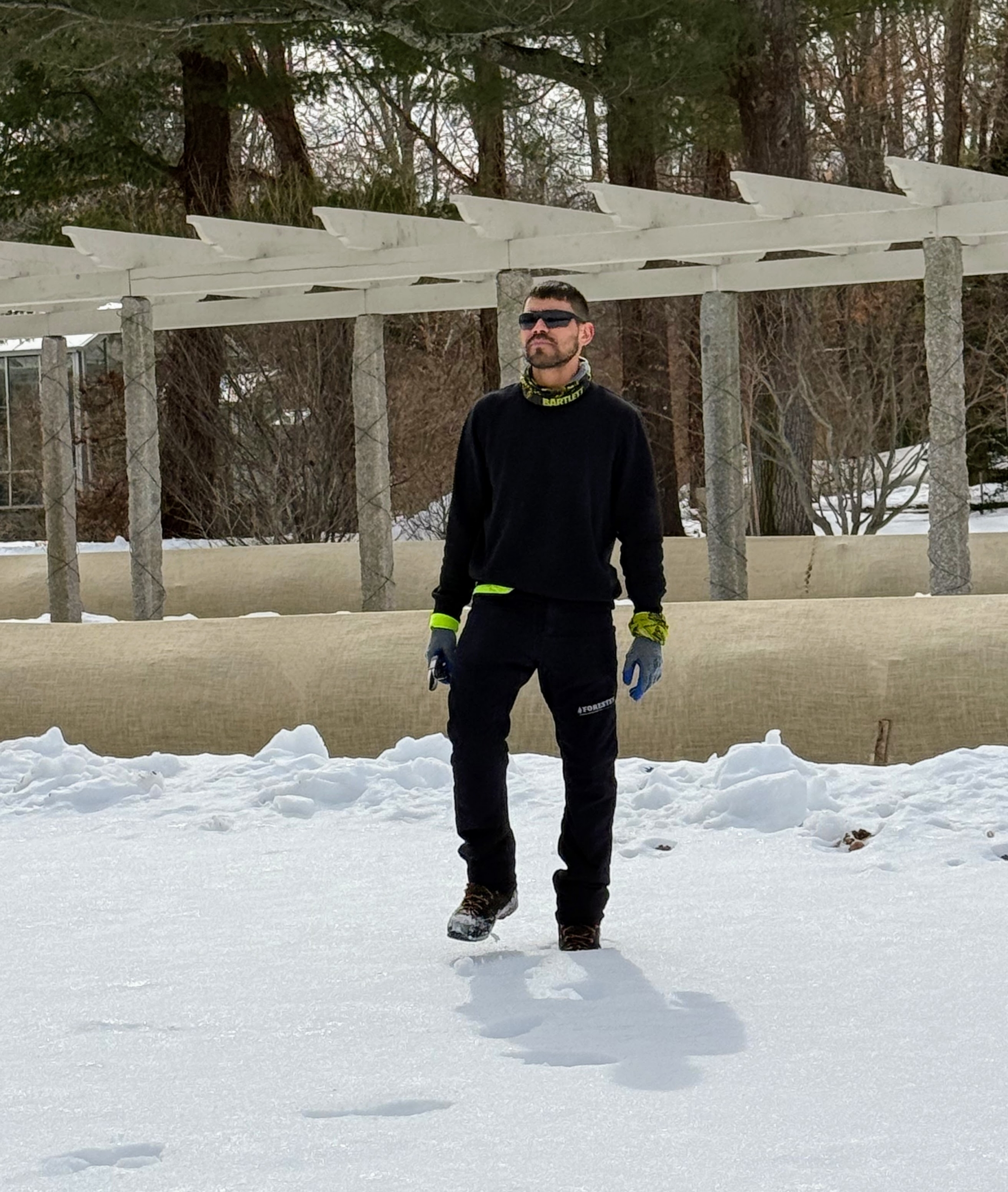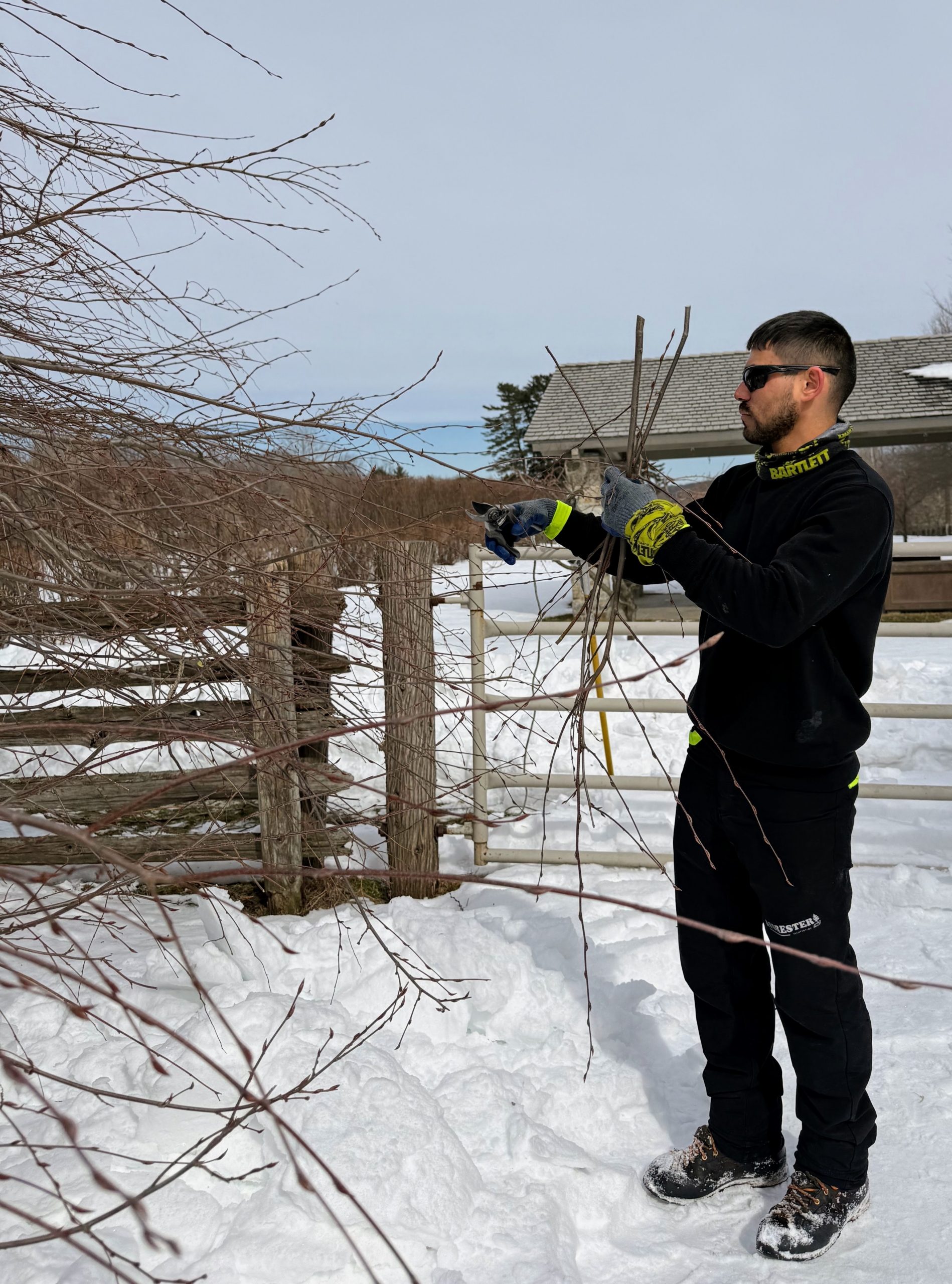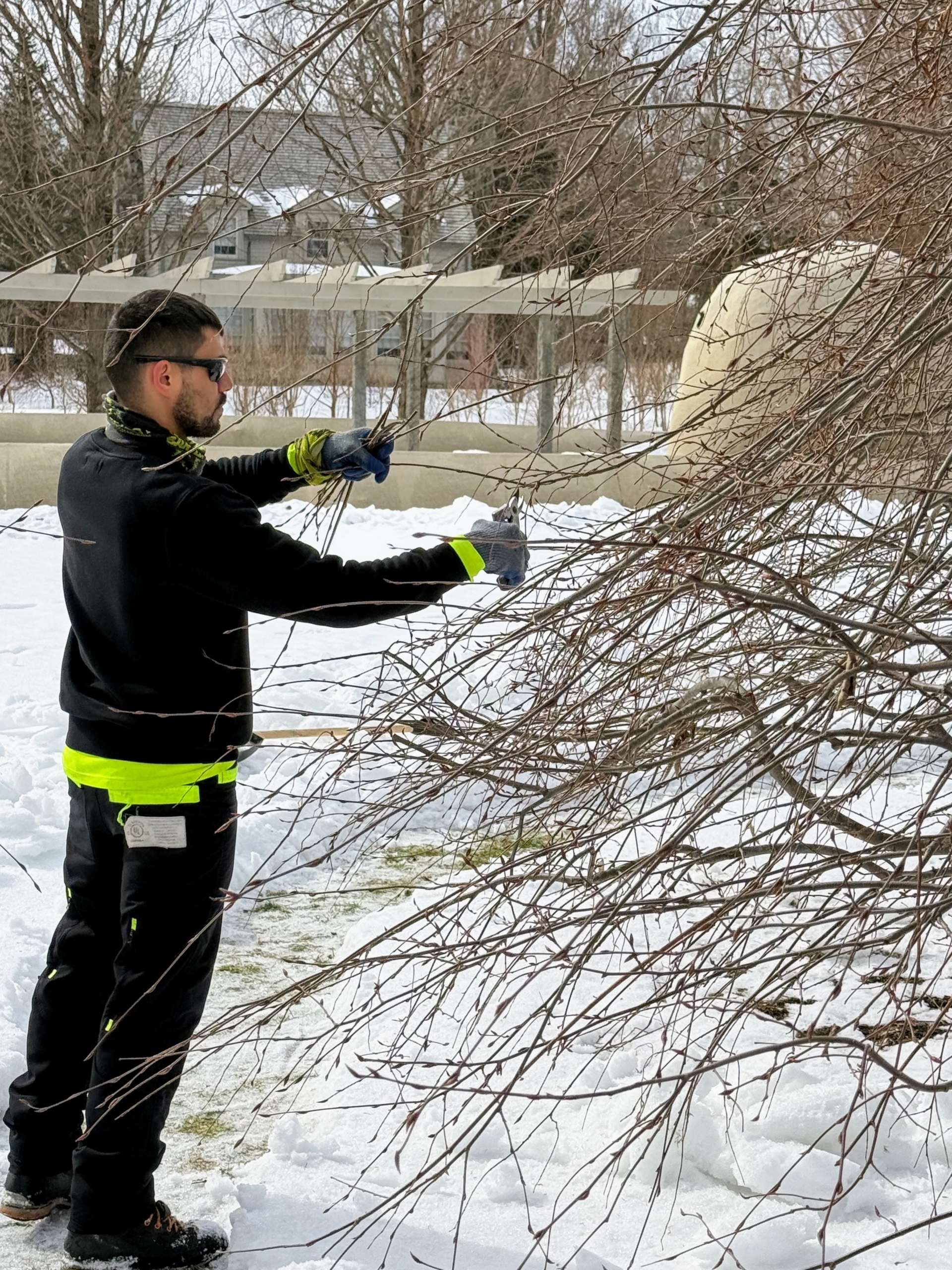- With all the snow on the ground, it is also necessary to shovel a path, so the crew can work on each tree and safely set up their ladders. We’ve had a very snowy season.