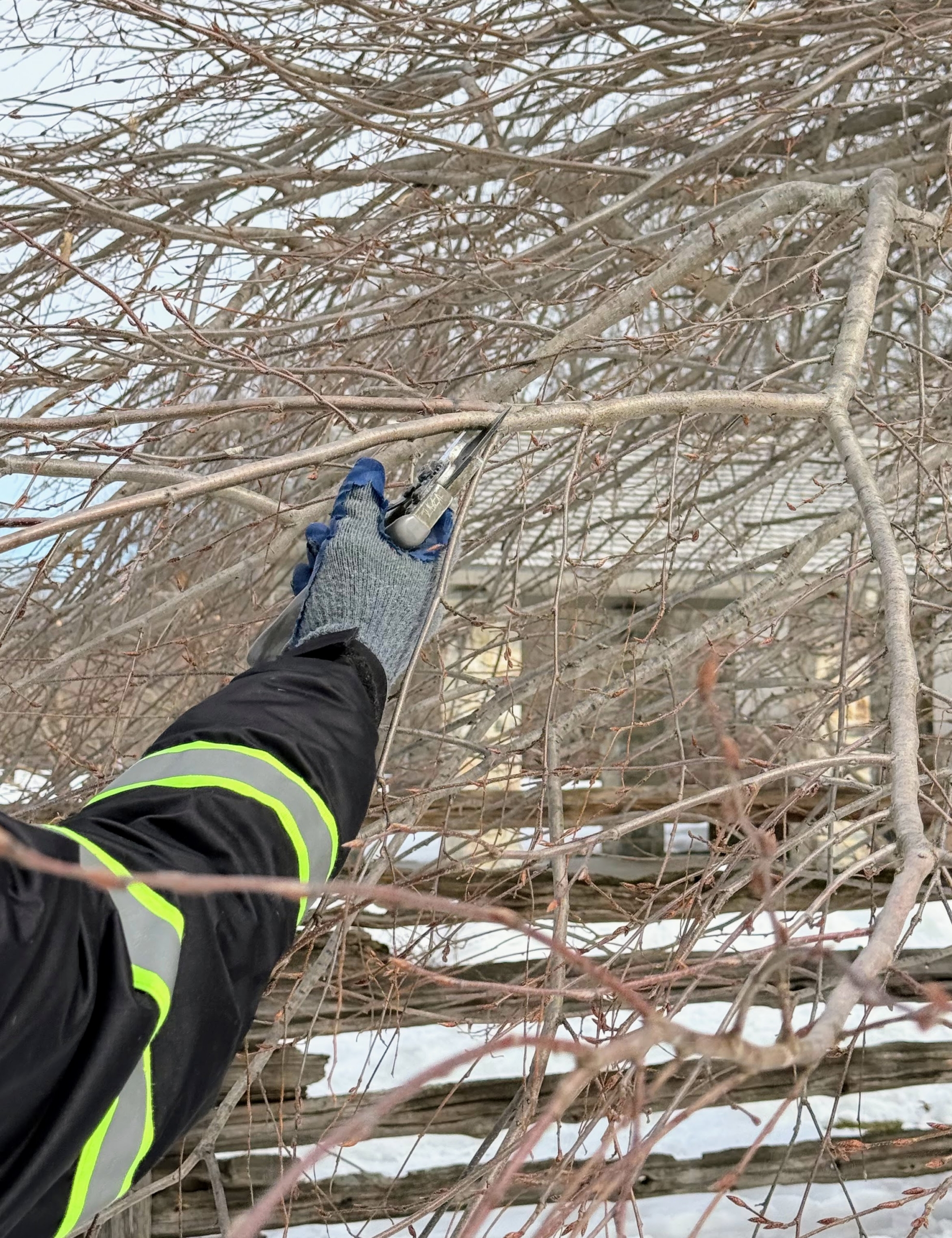 - Ray starts from the bottom, removing any branches that are touching the wood fence nearby.