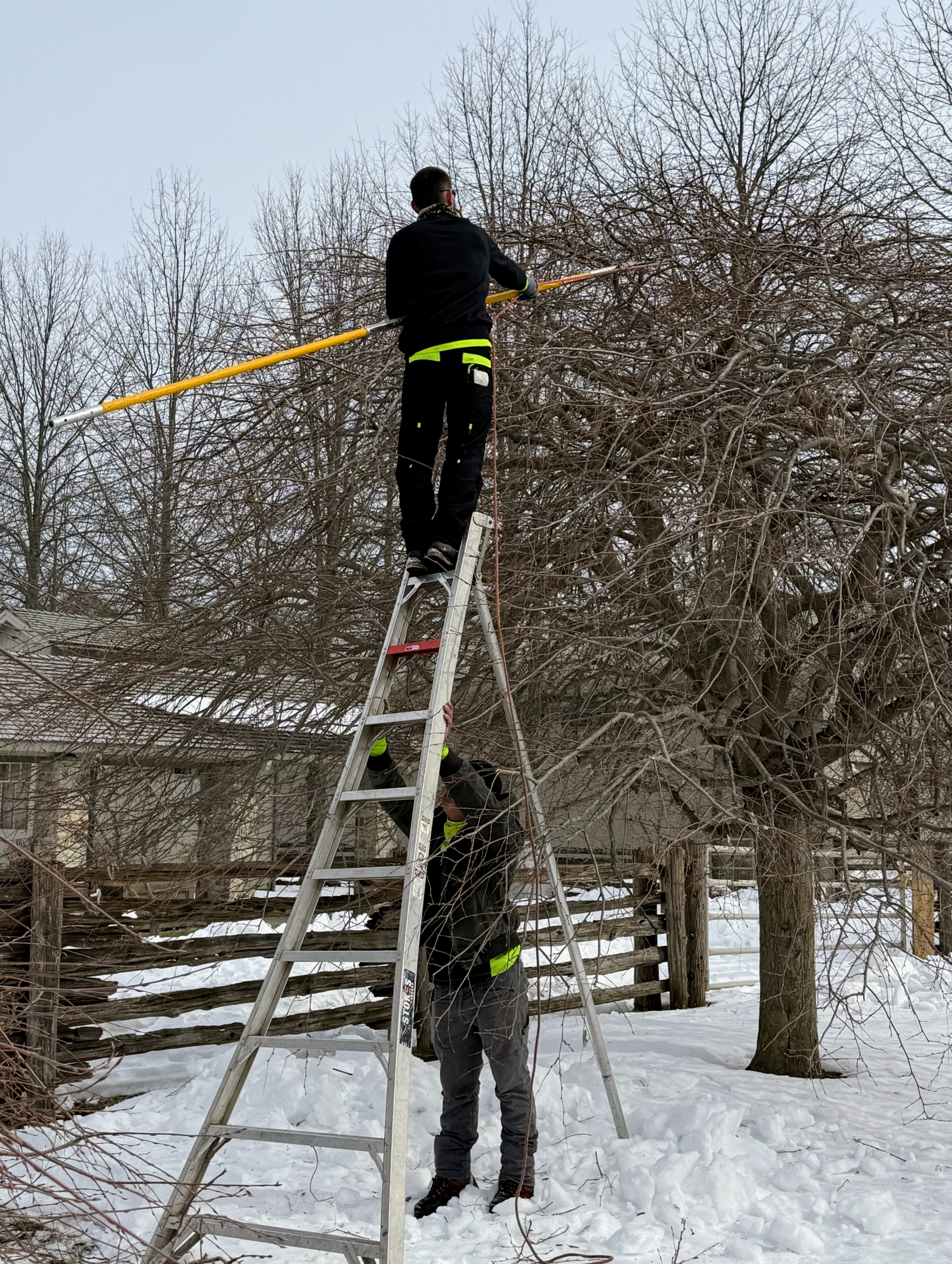 - Sometimes a ladder is still necessary. Here, Ray reaches branches at the very top center of the tree.