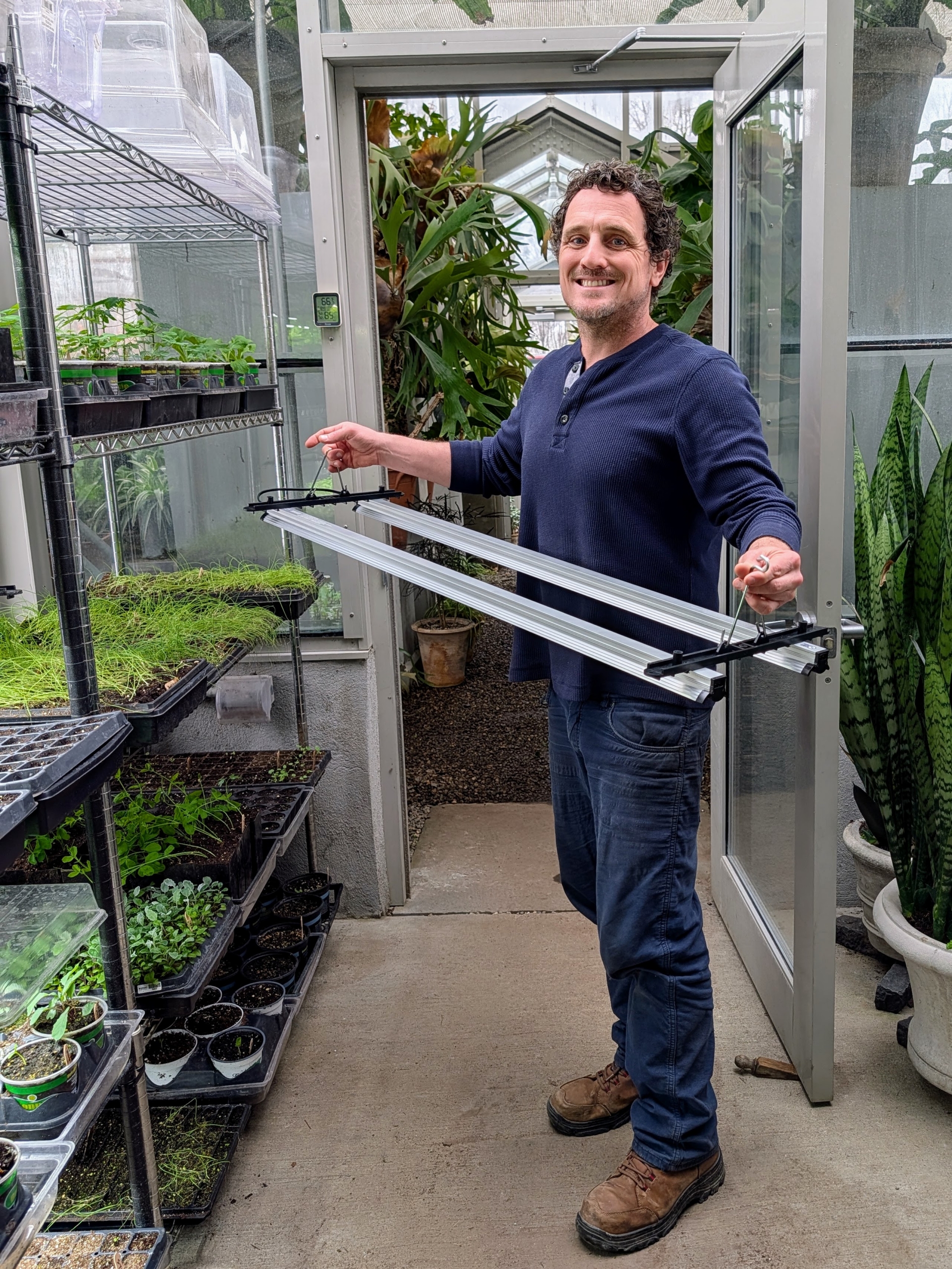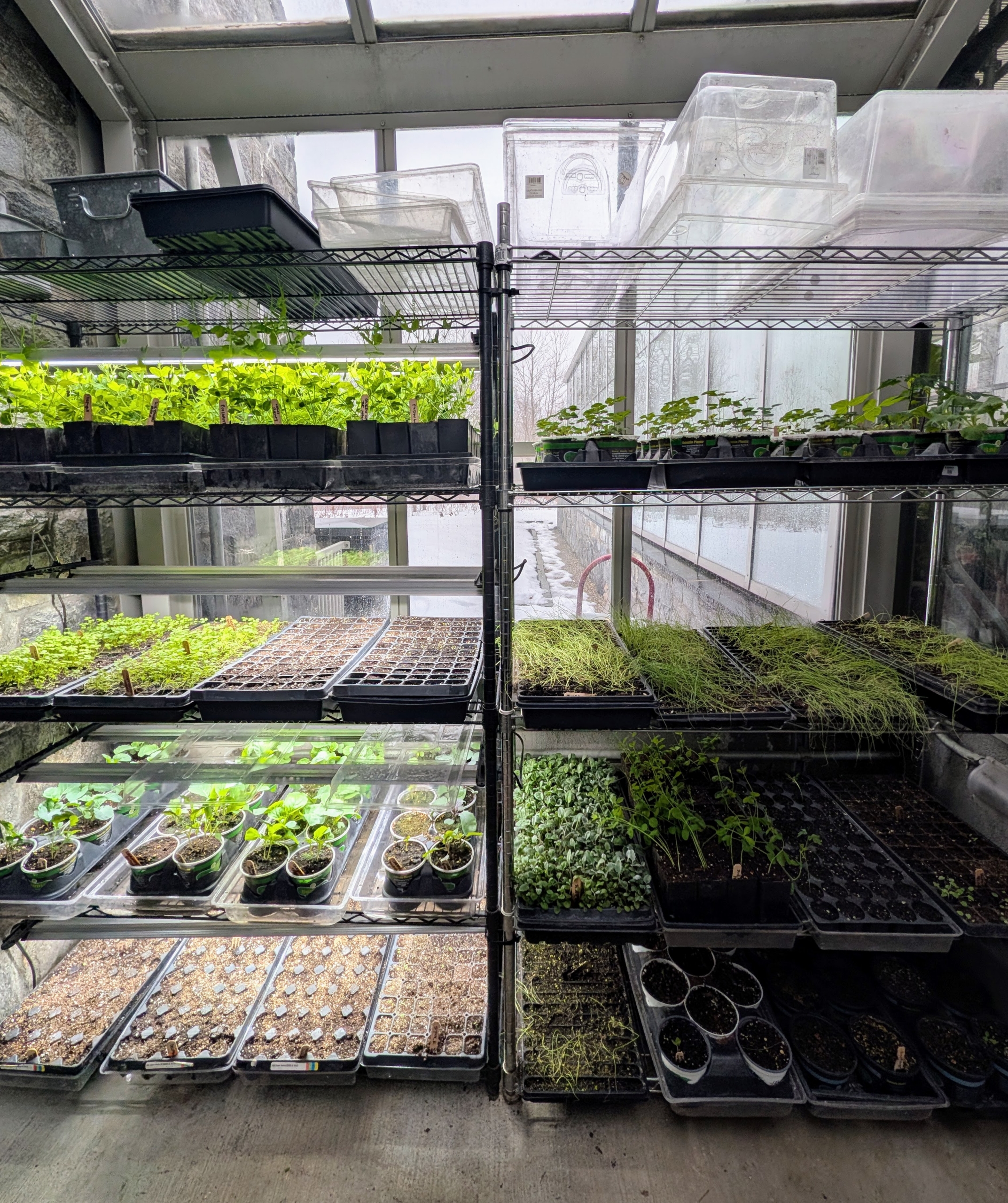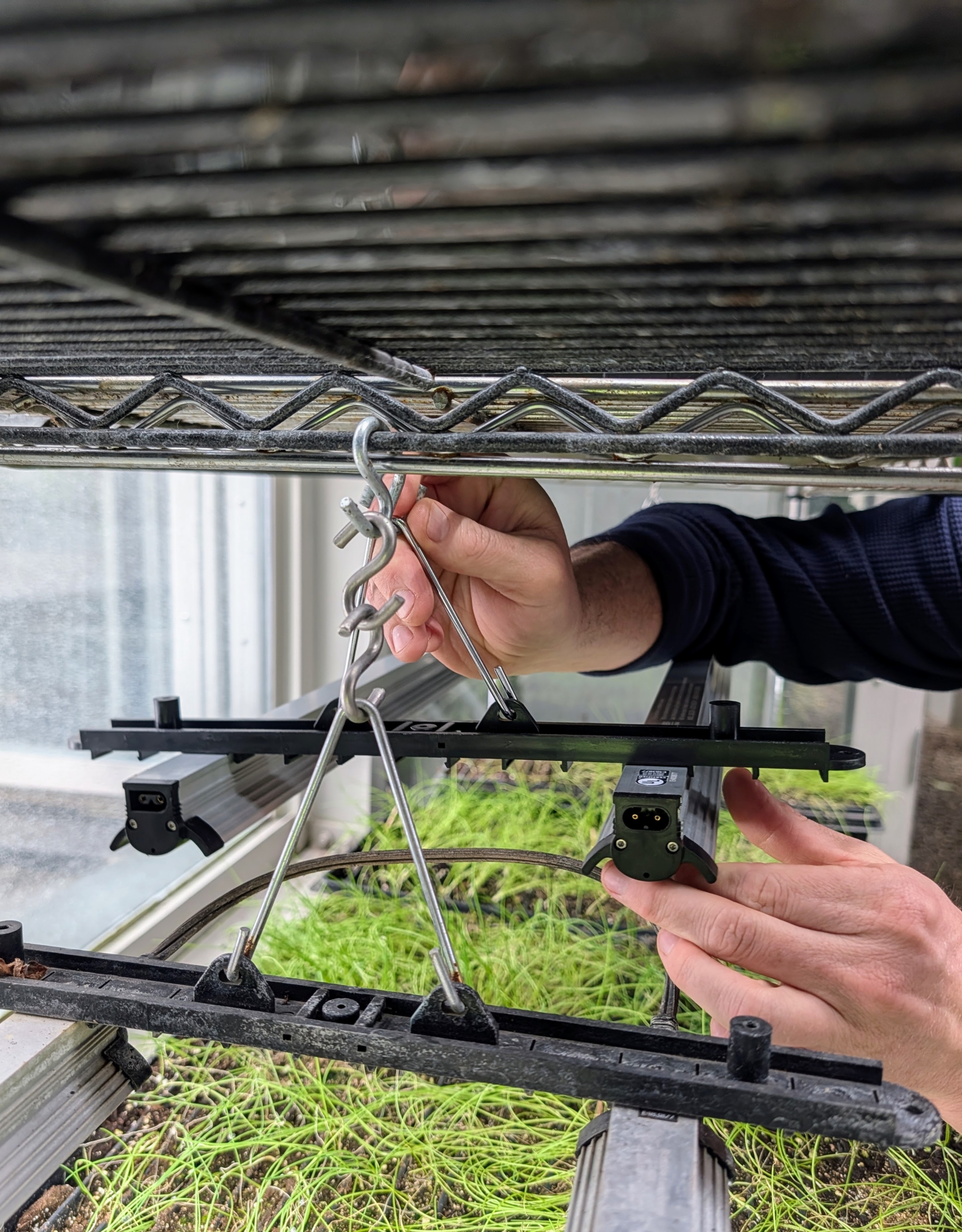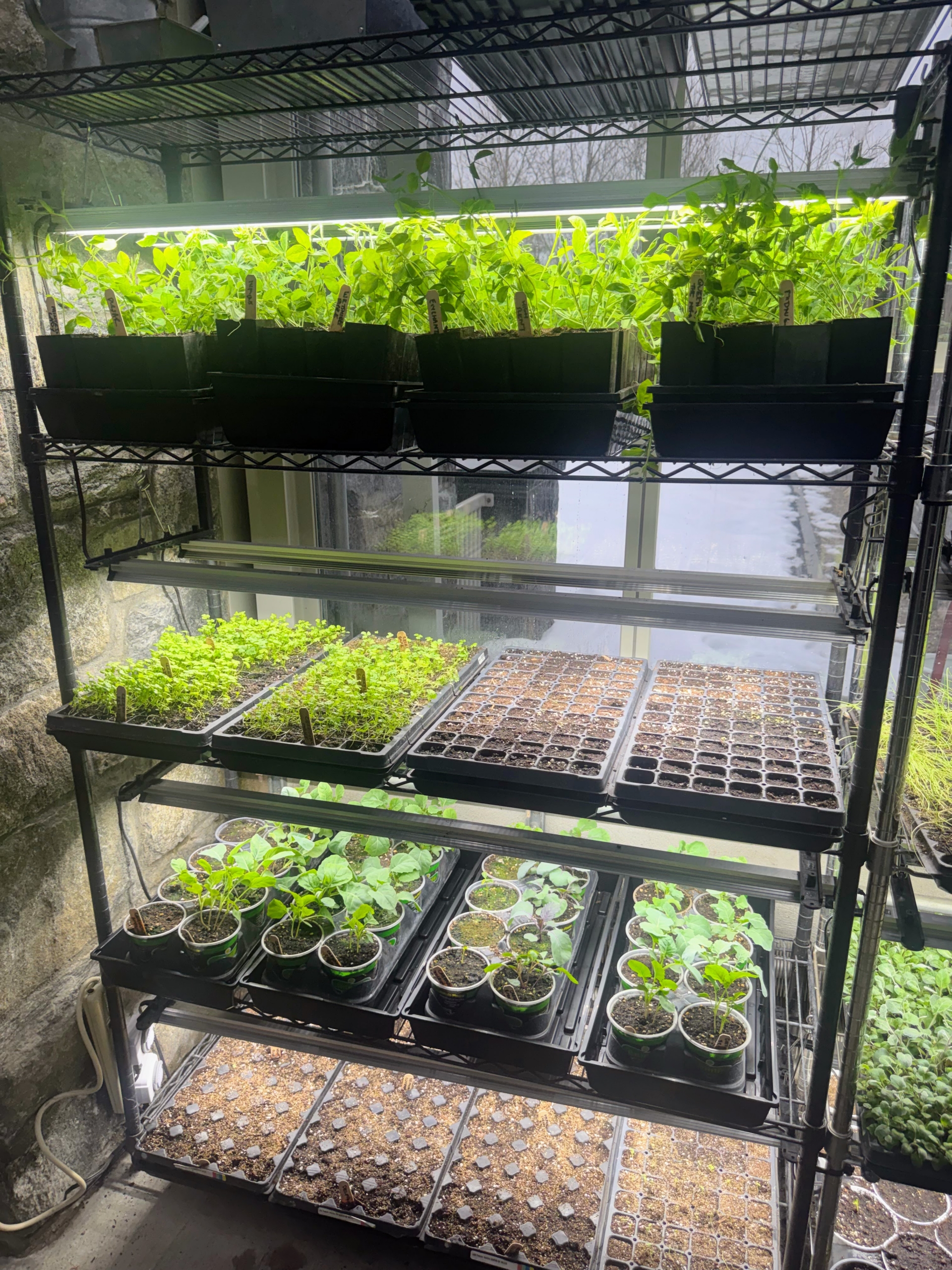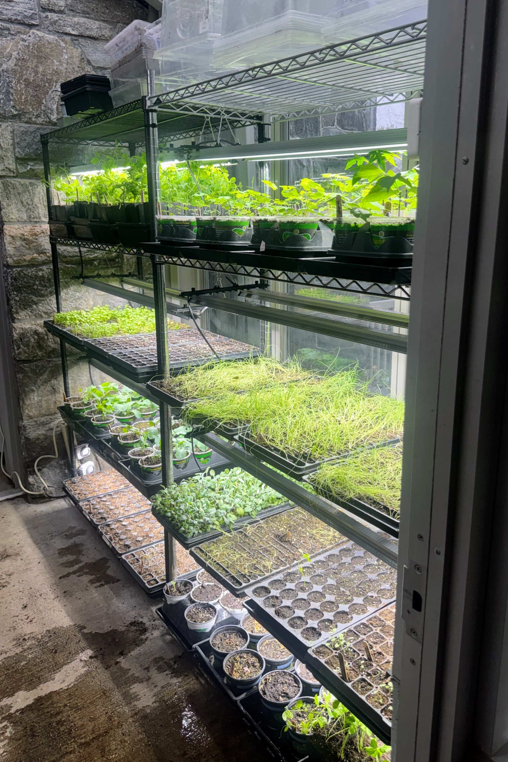 - The lights are being used for this vestibule between my head house and my greenhouse. Lights are already installed on the left rack. Notice how much more light is provided for the growing seedings.