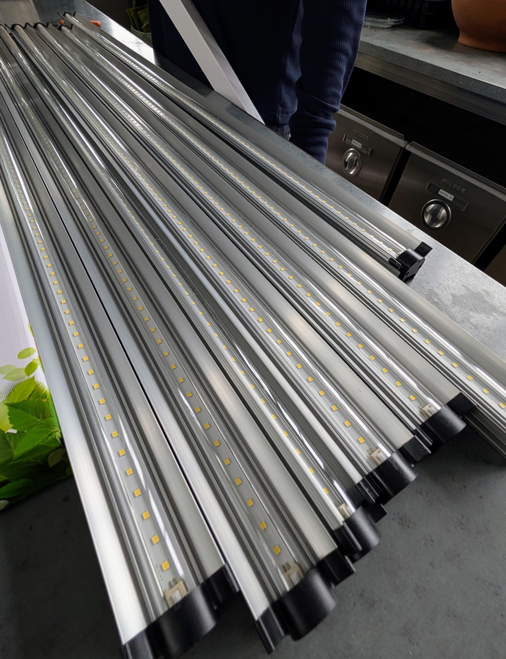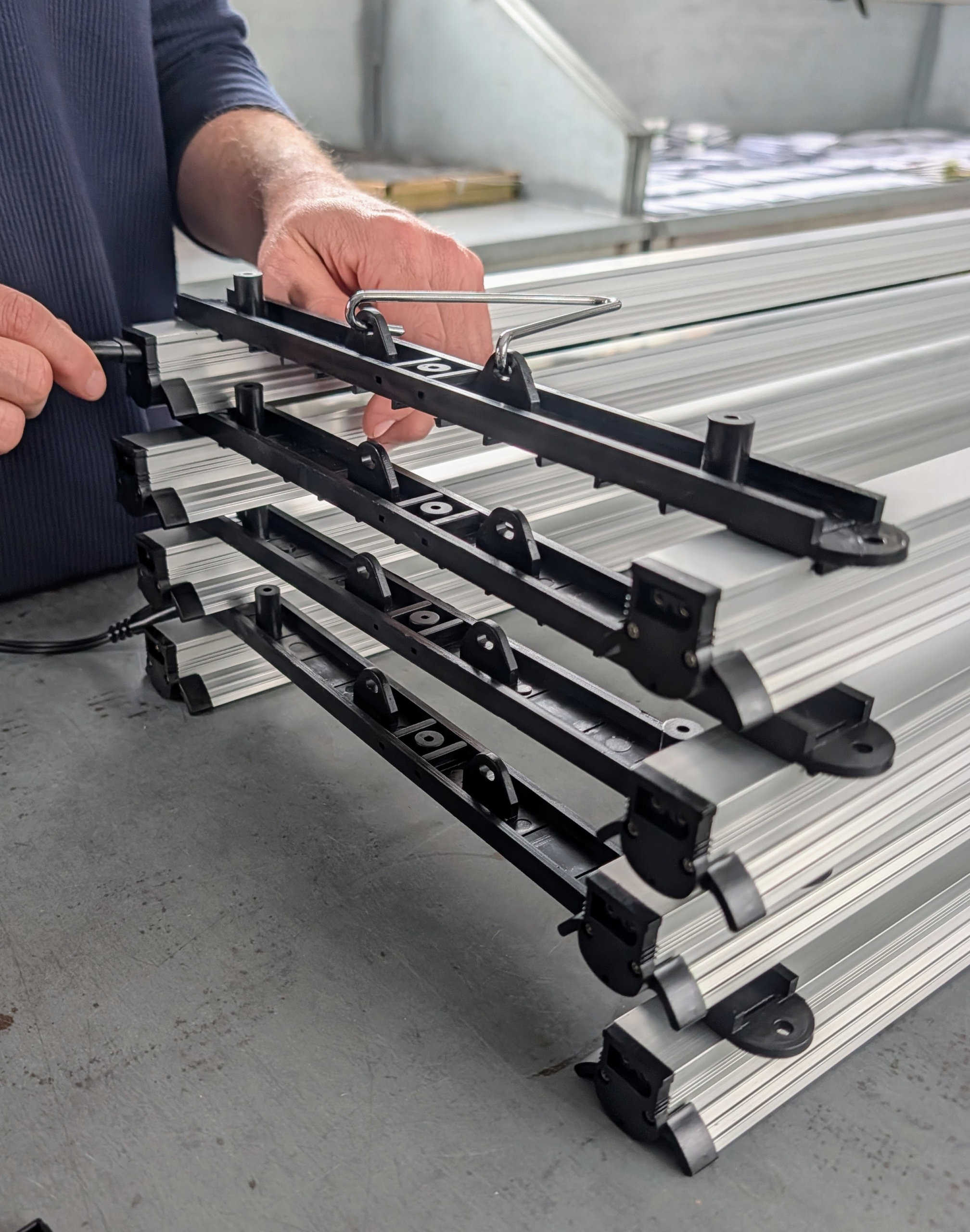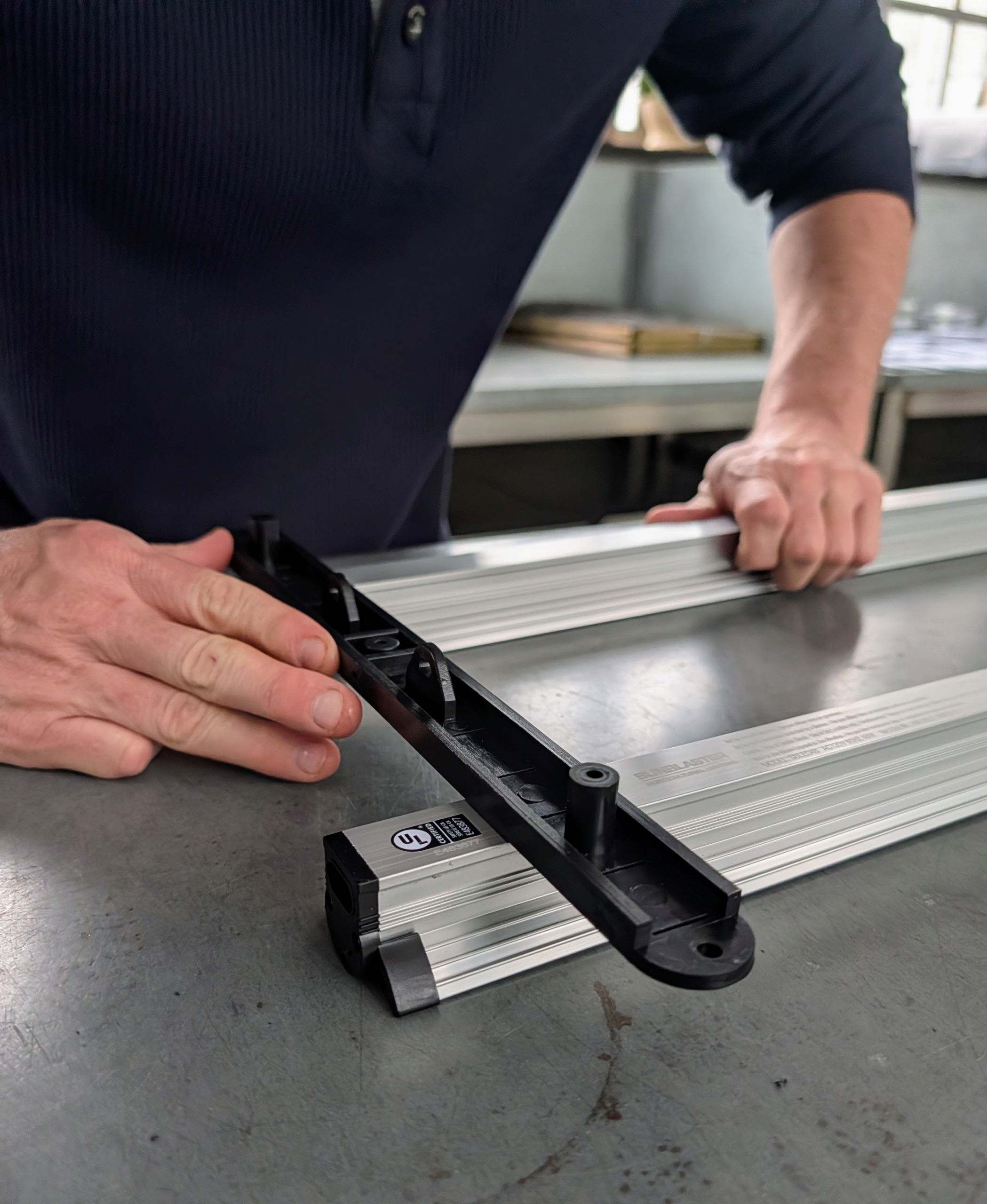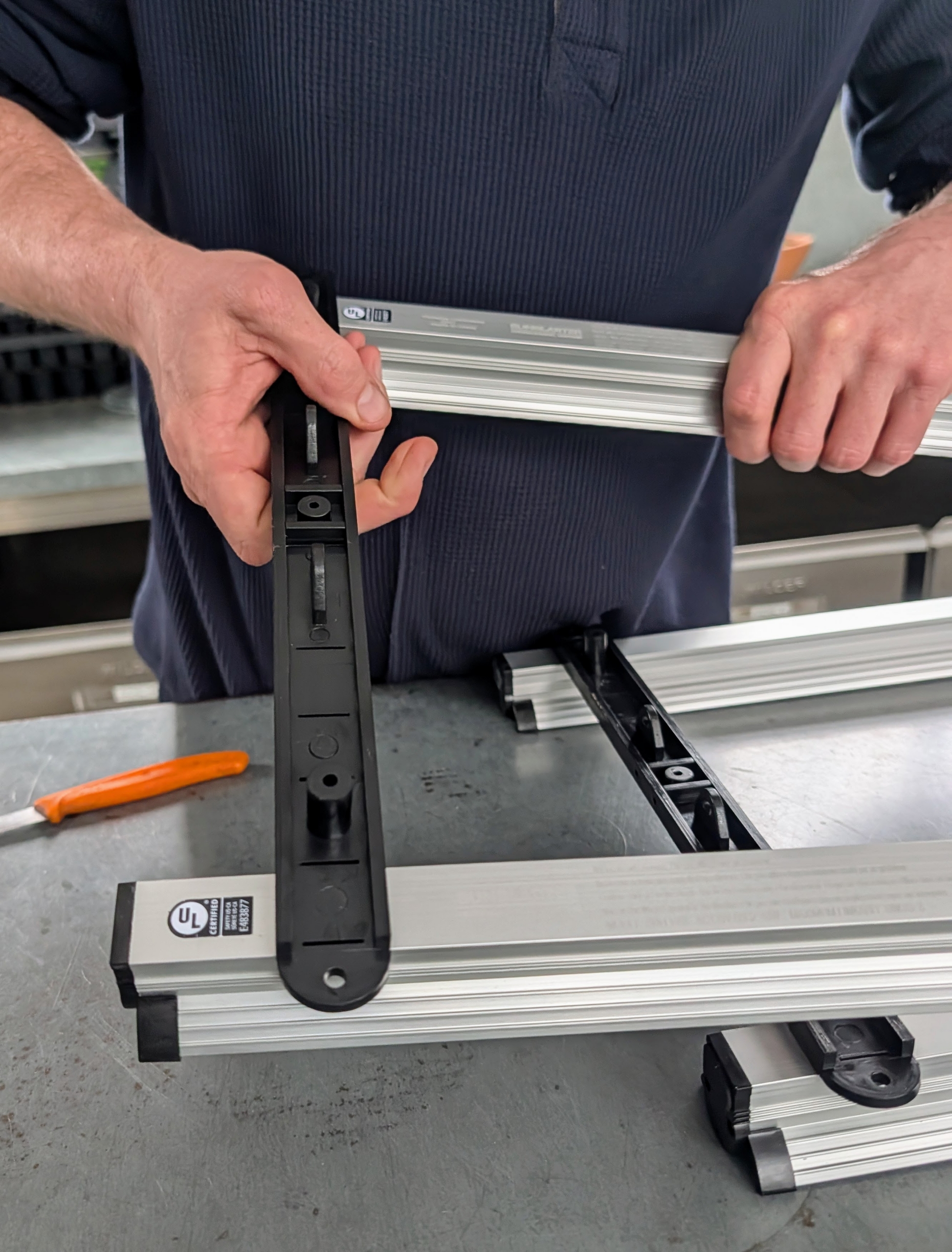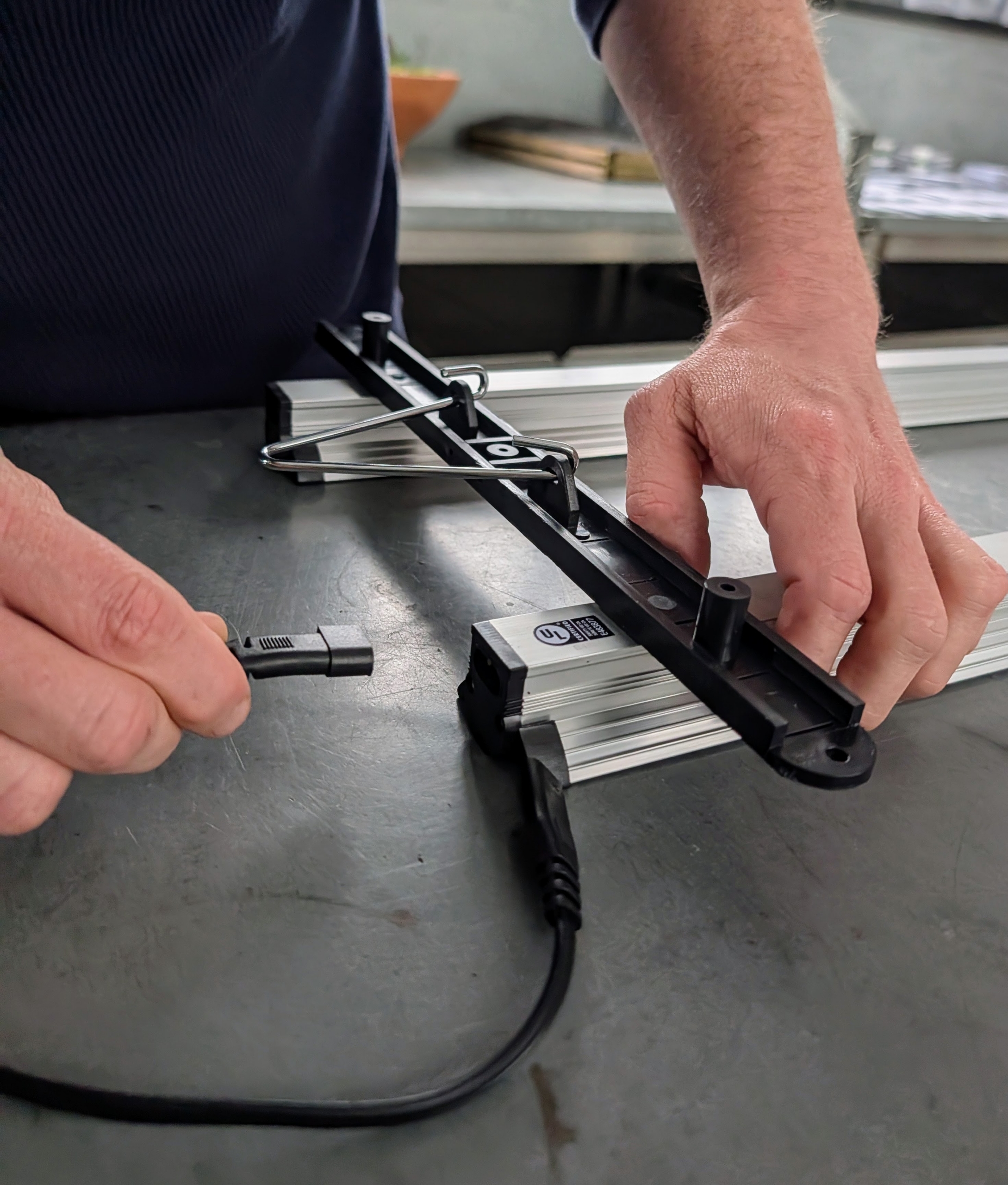 - The light strips are connected in pairs using the brackets provided. Ryan secures one at each end of a pair of light strips.