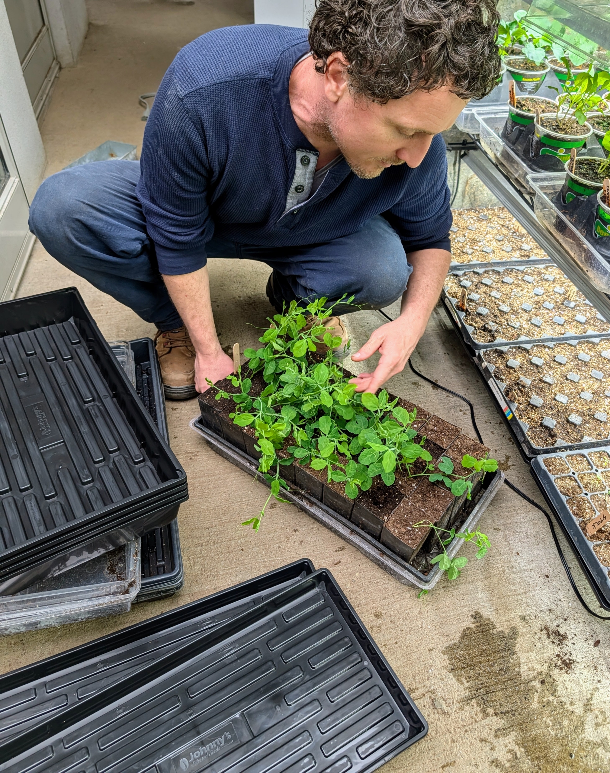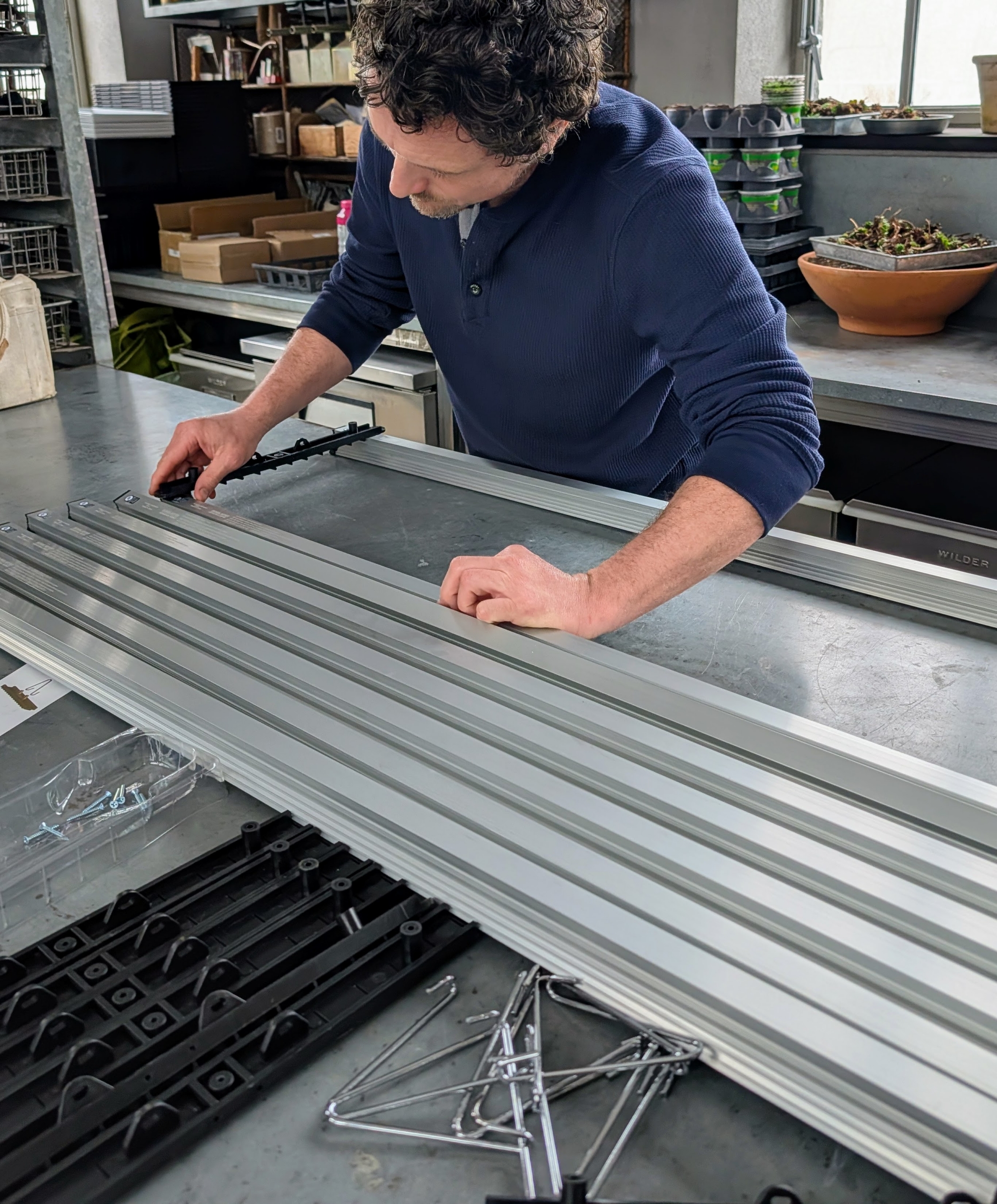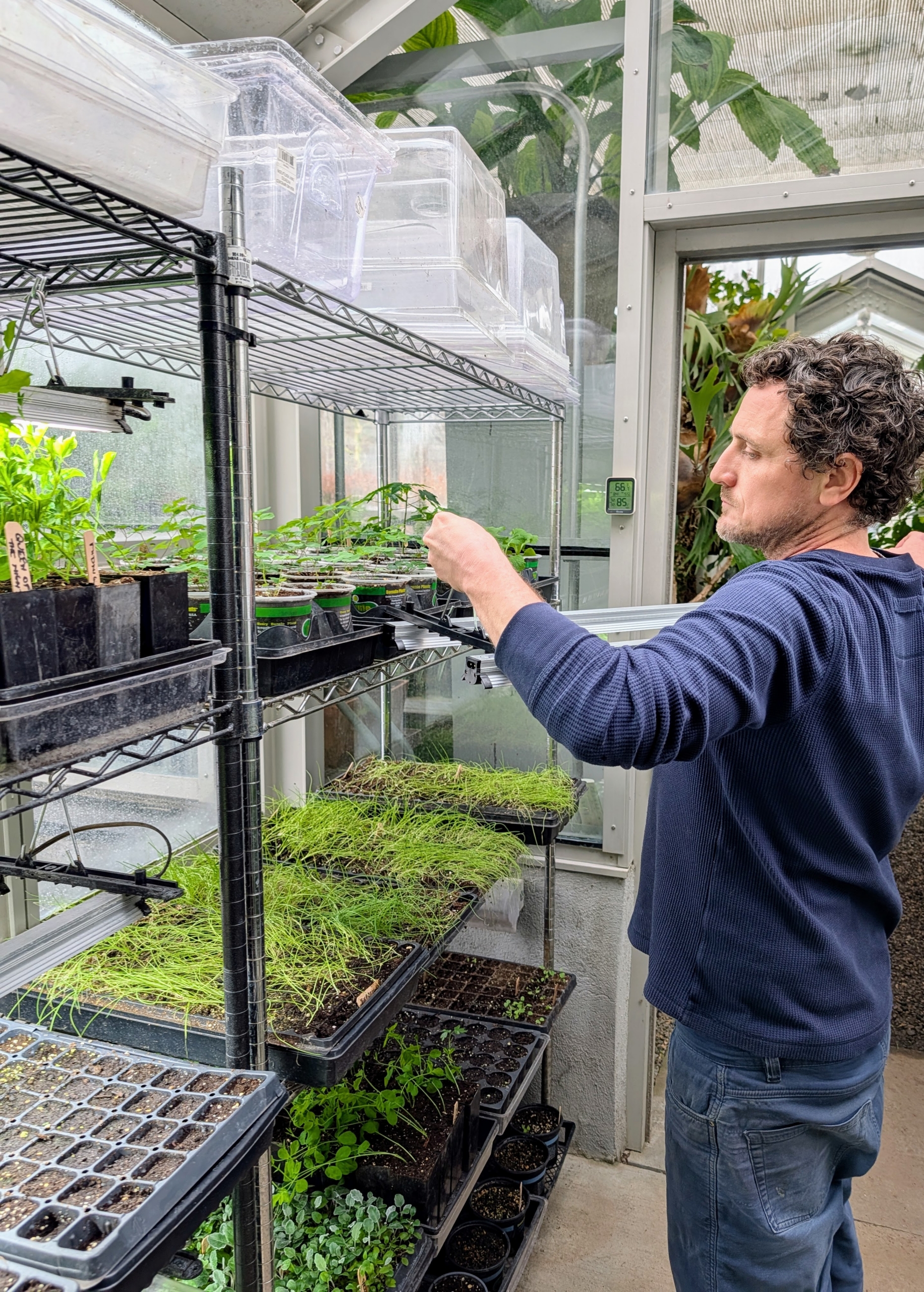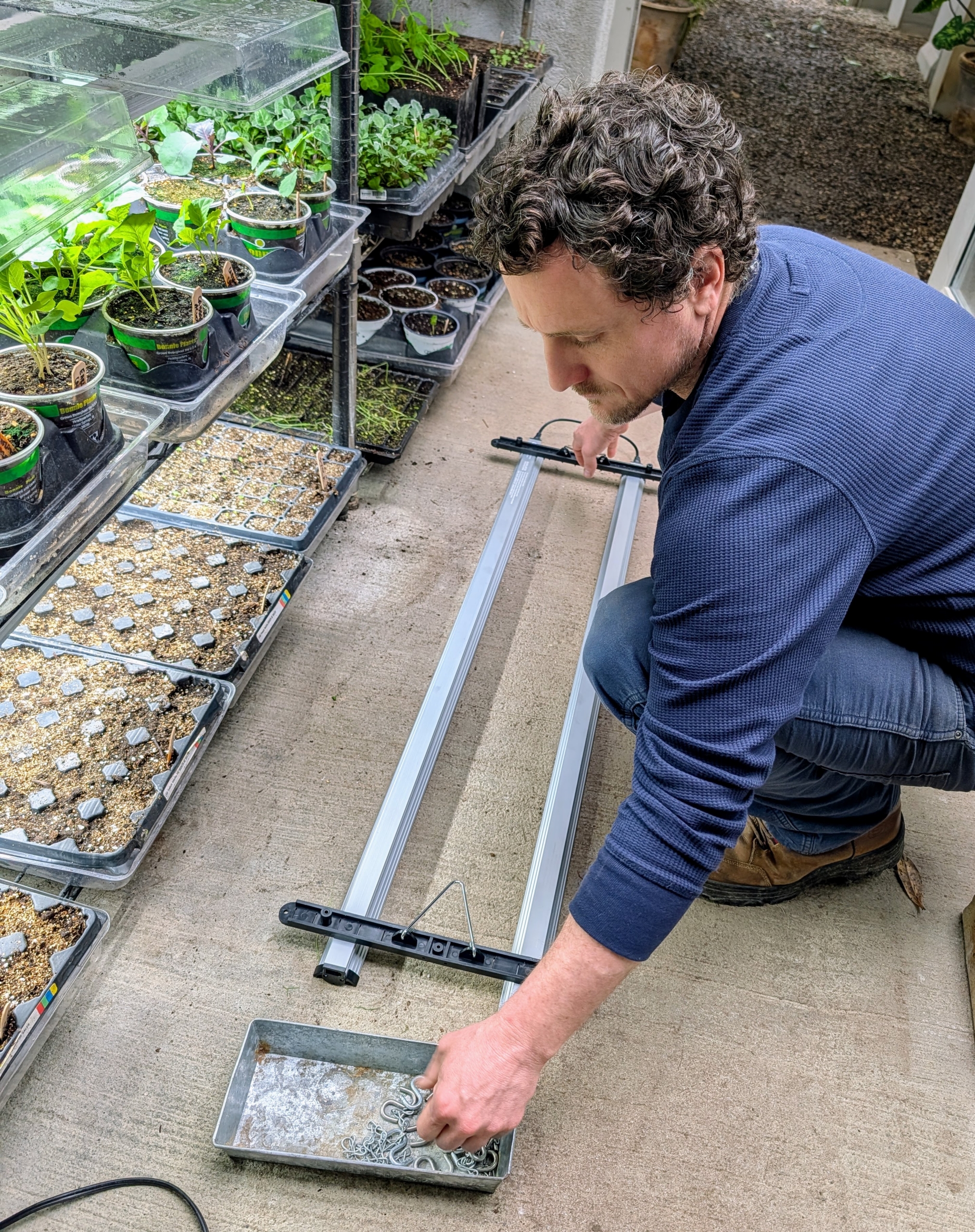 - Ryan arranges the trays and pots to fit as many as possible onto the rack.