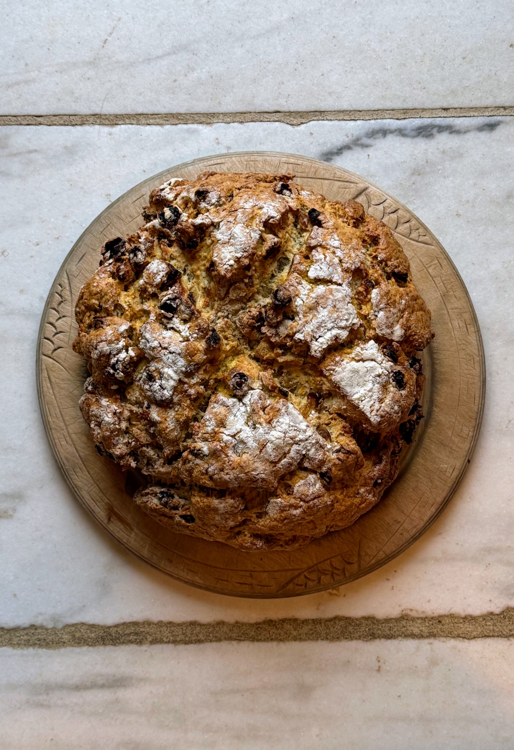 - I made loaves of my Irish Soda Bread with rye flour, wheat germ, golden raisins, and caraway. Everyone always loves my Irish soda bread – there’s never a crumb left over. Legend has it that, in some areas of Ireland, a cross was cut on the top of the Irish soda bread with a knife to ward off the devil and protect the household. It also helps the bread cook evenly and thoroughly. Irish soda bread is a somewhat sweet white bread made with eggs and butter and studded with raisins and caraway seeds — the “soda” in the name comes from the baking soda, or “bread soda” in Ireland used to leaven it instead of yeast and kneading.
