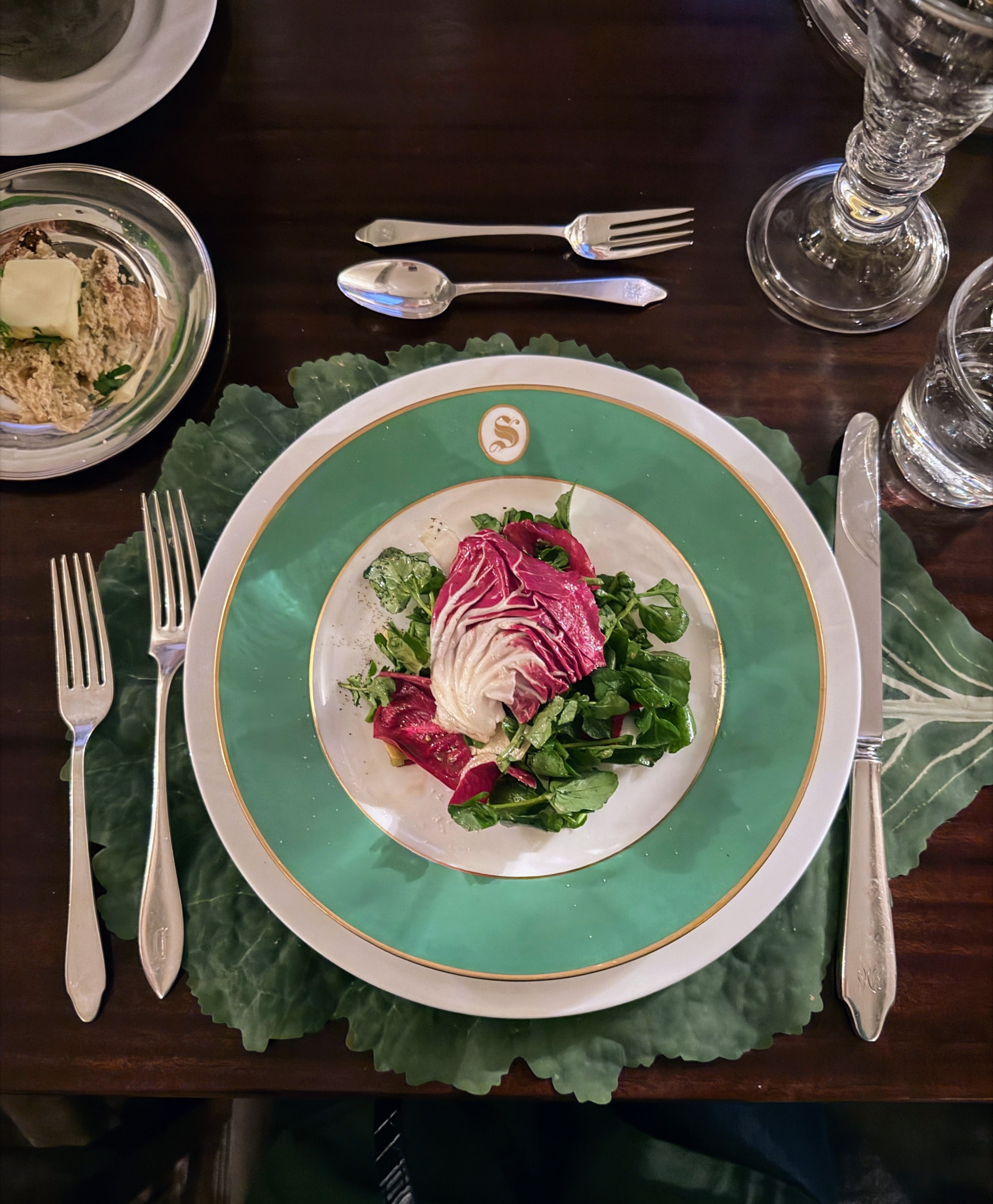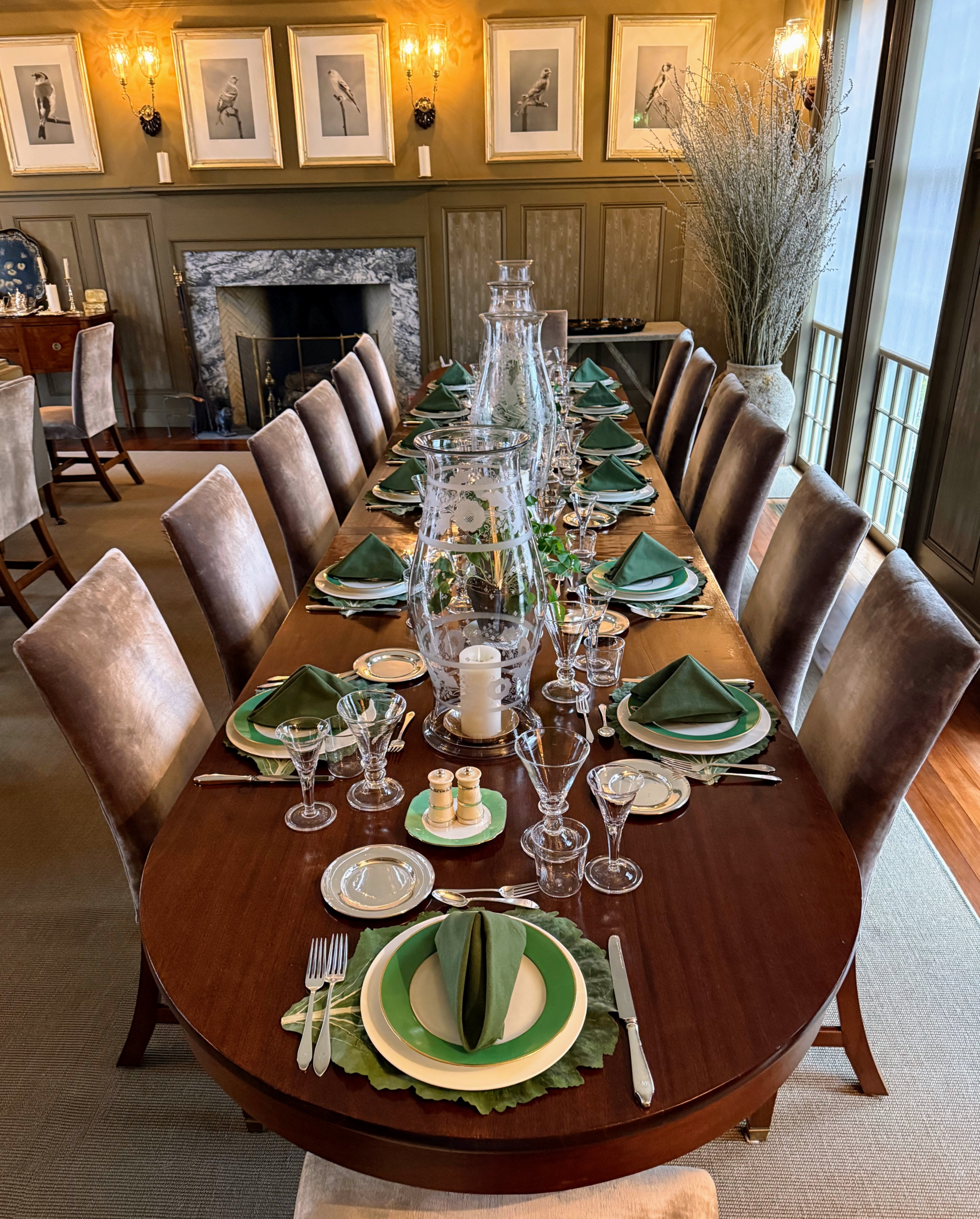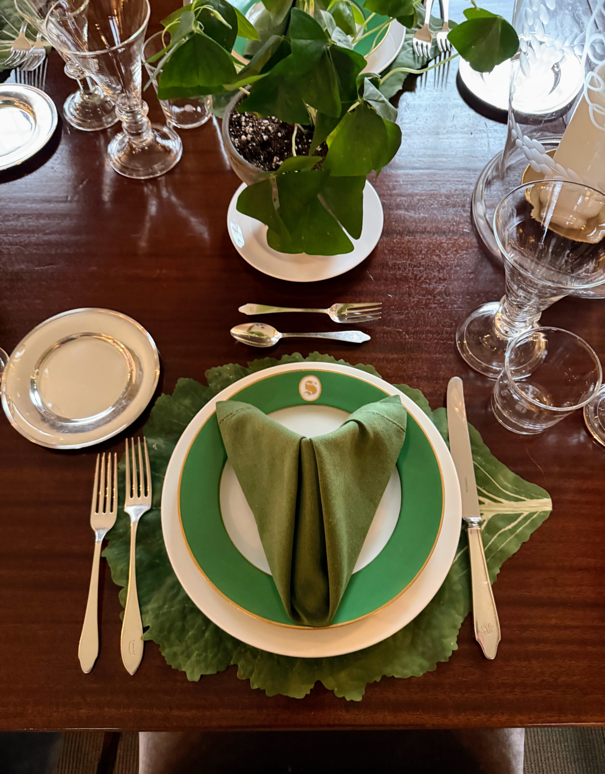 - I decide the place settings for every holiday meal – working closely with my housekeepers to make sure we have all the necessary plates, utensils, and glasses. The green china plates are Paris porcelain monogrammed with an “S”.