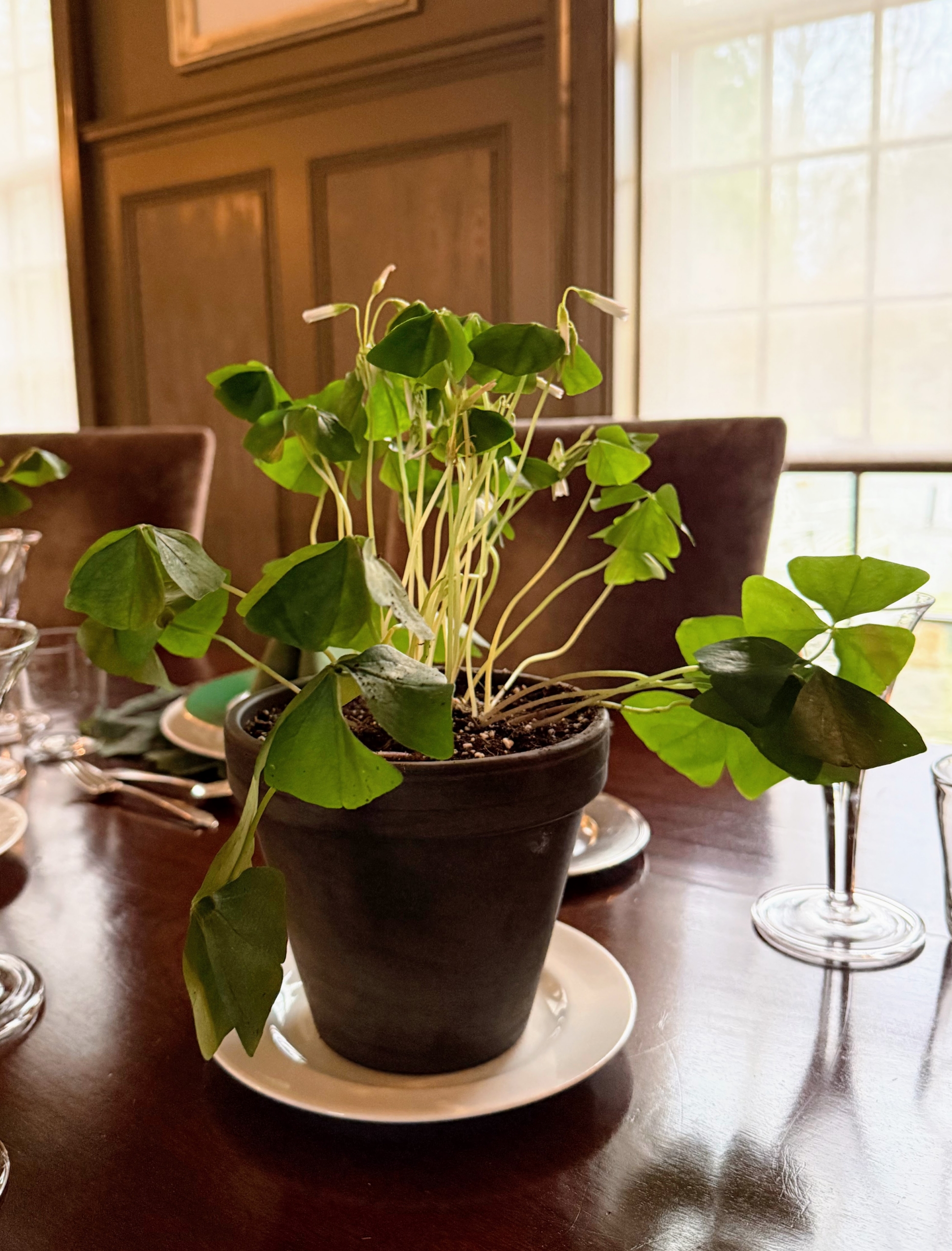 - I also displayed False Shamrock, Oxalis triangularis, down the center as my centerpieces. Do you know the difference between a shamrock and a clover? Shamrocks always have three leaves, while clovers can have a fourth. Shamrocks are usually green, but one can also find them in purple, green, or white. And shamrocks grow in clumps, while four-leaf clovers are rare and grow one at a time.